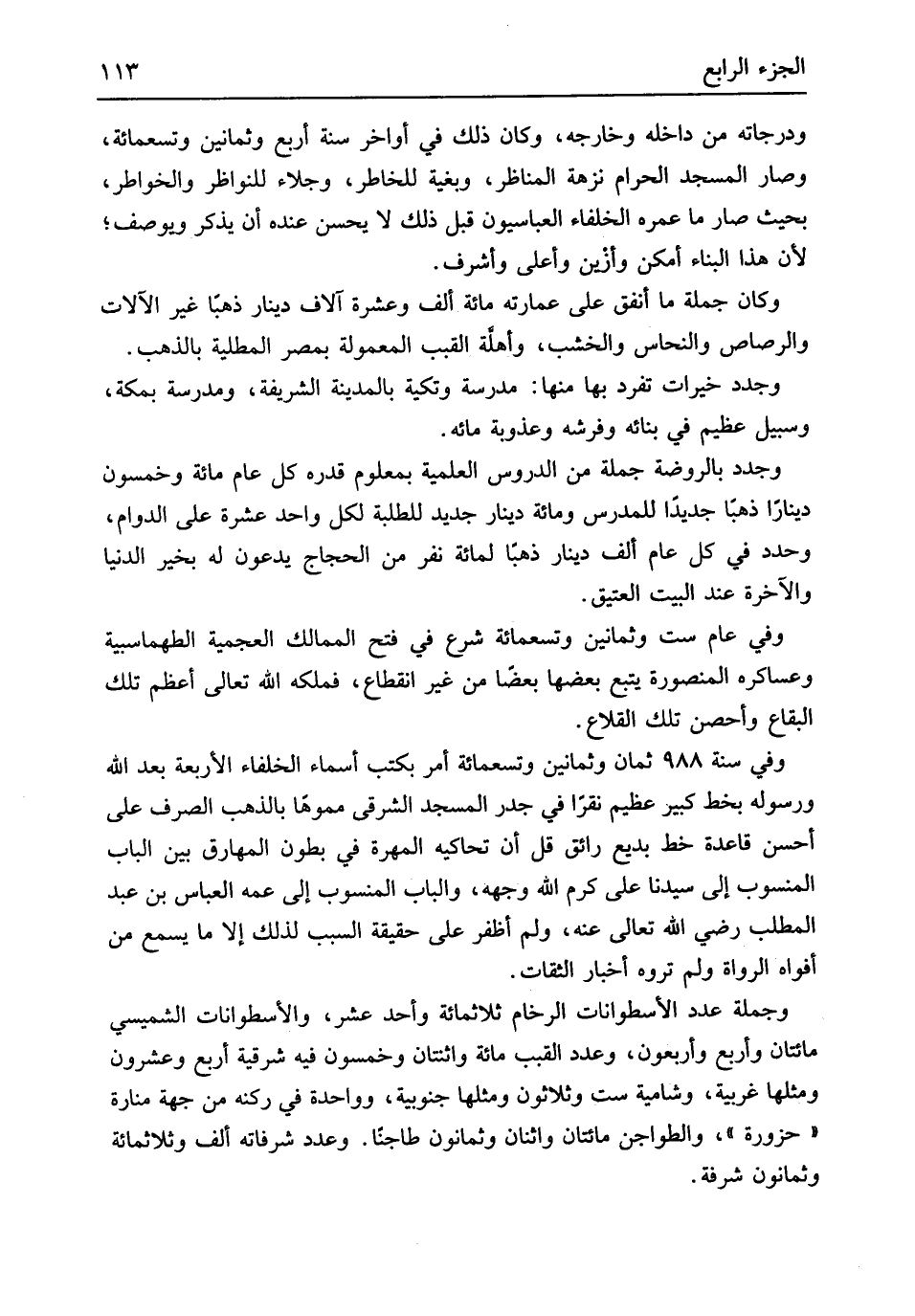 ودرجاته من دَاخله وخارجه وَكَانَ ذَلِك فِي أَوَاخِر سنة أَربع وَثَمَانِينَ وَتِسْعمِائَة وَصَارَ الْمَسْجِد الْحَرَام نزهة المناظر وبغية للخاطر وجلاء للنواظر والخواطر بِحَيْثُ صَار مَا عمره الْخُلَفَاء العباسيون قبل ذَلِك لَا يحسن عِنْده أَن يذكر ويوصف لِأَن هَذَا الْبناء أمكن وأزين وَأَعْلَى وأشرف وَكَانَ جملَة مَا أنْفق على عِمَارَته مائَة ألف وَعشرَة آلَاف دِينَار ذَهَبا غير الْآلَات والرصاص والنحاس والخشب وأهلَّة القبب المعمولة بِمصْر المطلية بِالذَّهَب وجدد خيرات تفرد بهَا مِنْهَا مدرسة وتكية بِالْمَدِينَةِ الشَّرِيفَة ومدرسة بِمَكَّة وسبيل عَظِيم فِي بنائِهِ وفرشه وعذوبة مَائه وجدد بالروضة جملَة من الدُّرُوس العلمية بِمَعْلُوم قدره كل عَام مائَة وَخَمْسُونَ دِينَارا ذَهَبا جَدِيدا للمدرس وَمِائَة دِينَار جَدِيد للطلبة لكل وَاحِد عشرَة على الدَّوَام وحدد فِي كل عَام ألف دِينَار ذَهَبا لمِائَة نفر من الْحجَّاج يدعونَ لَهُ بِخَير الدُّنْيَا وَالْآخِرَة عِنْد الْبَيْت الْعَتِيق وَفِي عَام سِتّ وَثَمَانِينَ وَتِسْعمِائَة شرع فِي فتح الممالك العجمية الطهماسبية وعساكره المنصورة يتبع بَعْضهَا بَعْضًا من غير انْقِطَاع فملكه الله تَعَالَى أعظم تِلْكَ الْبِقَاع وَأحْصن تِلْكَ القلاع وَفِي سنة 988 ثَمَان وَثَمَانِينَ وَتِسْعمِائَة أَمر بكتب أَسمَاء الْخُلَفَاء الْأَرْبَعَة بعد الله وَرَسُوله بِخَط كَبِير عَظِيم نقراً فِي جدر الْمَسْجِد الشَّرْقِي مموهاً بِالذَّهَب الصّرْف على أحسن قَاعِدَة خطّ بديع رائق قل أَن تحاكيه المهرة فِي بطُون المهارق بَين الْبَاب الْمَنْسُوب إِلَى سيدنَا عَليّ كرم الله وَجهه وَالْبَاب الْمَنْسُوب إِلَى عَمه الْعَبَّاس بن عبد الْمطلب رَضِي الله تَعَالَى عَنهُ وَلم أظفر على حَقِيقَة السَّبَب لذَلِك إِلَّا مَا يسمع من أَفْوَاه الروَاة وَلم تروه أَخْبَار الثِّقَات وَجُمْلَة عدد الأسطوانات الرخام ثَلَاثمِائَة وَأحد عشر والأسطوانات الشميسي مِائَتَان وَأَرْبع وَأَرْبَعُونَ وَعدد القبب مائَة وَاثْنَتَانِ وَخَمْسُونَ فِيهِ شرقية أَربع وَعِشْرُونَ وَمثلهَا غربية وشامية سِتّ وَثَلَاثُونَ وَمثلهَا جنوبية وَوَاحِدَة فِي رُكْنه من جِهَة مَنَارَة حزورة والطواجن مِائَتَان وَاثْنَانِ وَثَمَانُونَ طاجناً وَعدد شرفاته ألف وثلاثمائة وَثَمَانُونَ شرفة