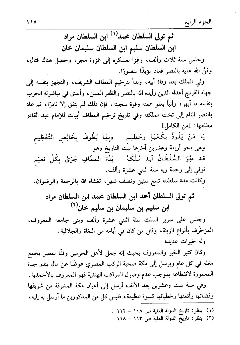 وَجلسَ على سَرِير الْملك سنة اثْنَتَيْ عشرَة وَألف وَبنى جَامعه الْمَعْرُوف المزخرف بأنواع الزِّينَة وَقتل من كَانَ فِي أَيَّامه من الْبُغَاة والجلالية وَله خيرات عديدة وَكَانَ كثير الْخَيْر وَالْمَعْرُوف بِحَيْثُ إِنَّه جعل لأهل الْحَرَمَيْنِ وَقفا بِمصْر يجمع مغله فِي كل عَام وَيُرْسل إِلَى مَكَّة صُحْبَة الركب الْمصْرِيّ عوضا عَن مَال بندر جدة المعمورة لانقطاعه بِمُوجب عدم وُصُول المراكب الْهِنْدِيَّة فَهُوَ الْمَعْرُوف بالأحمدية وَفِي سنة سِتّ وَعشْرين بعد الْألف أرسل إِلَى أَعْيَان مَكَّة المشرفة من شريفها وقضاتها وأئمتها وخطبائها كسْوَة عَظِيمَة فَلبس كل من الْمَذْكُورين مَا أرسل بِهِ إِلَيْهِ