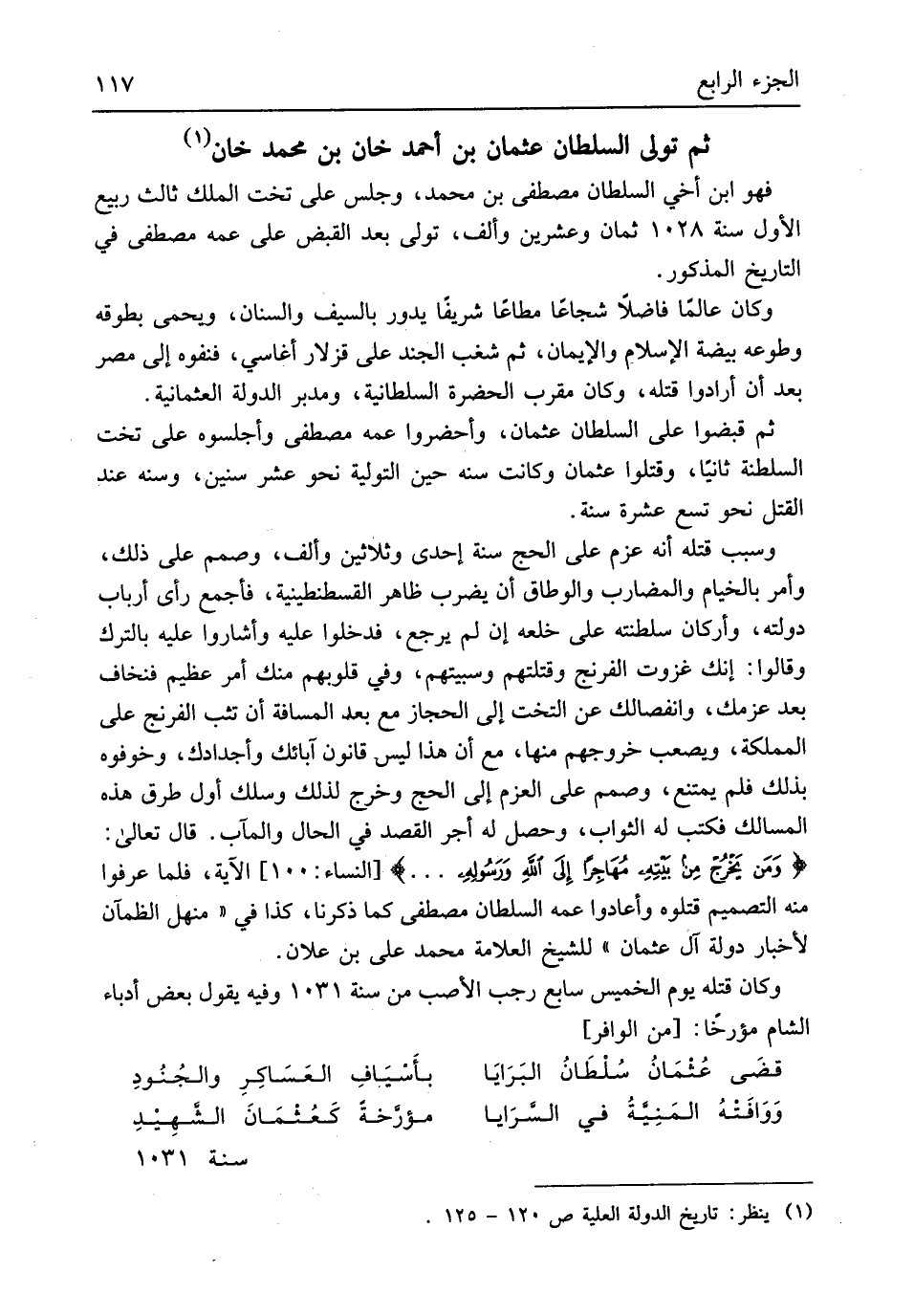 (قضَى عُثْمَانُ سُلْطَانُ البَرَايَا ... بأَسْيَافِ العَساكِرِ والجُنُودِ)