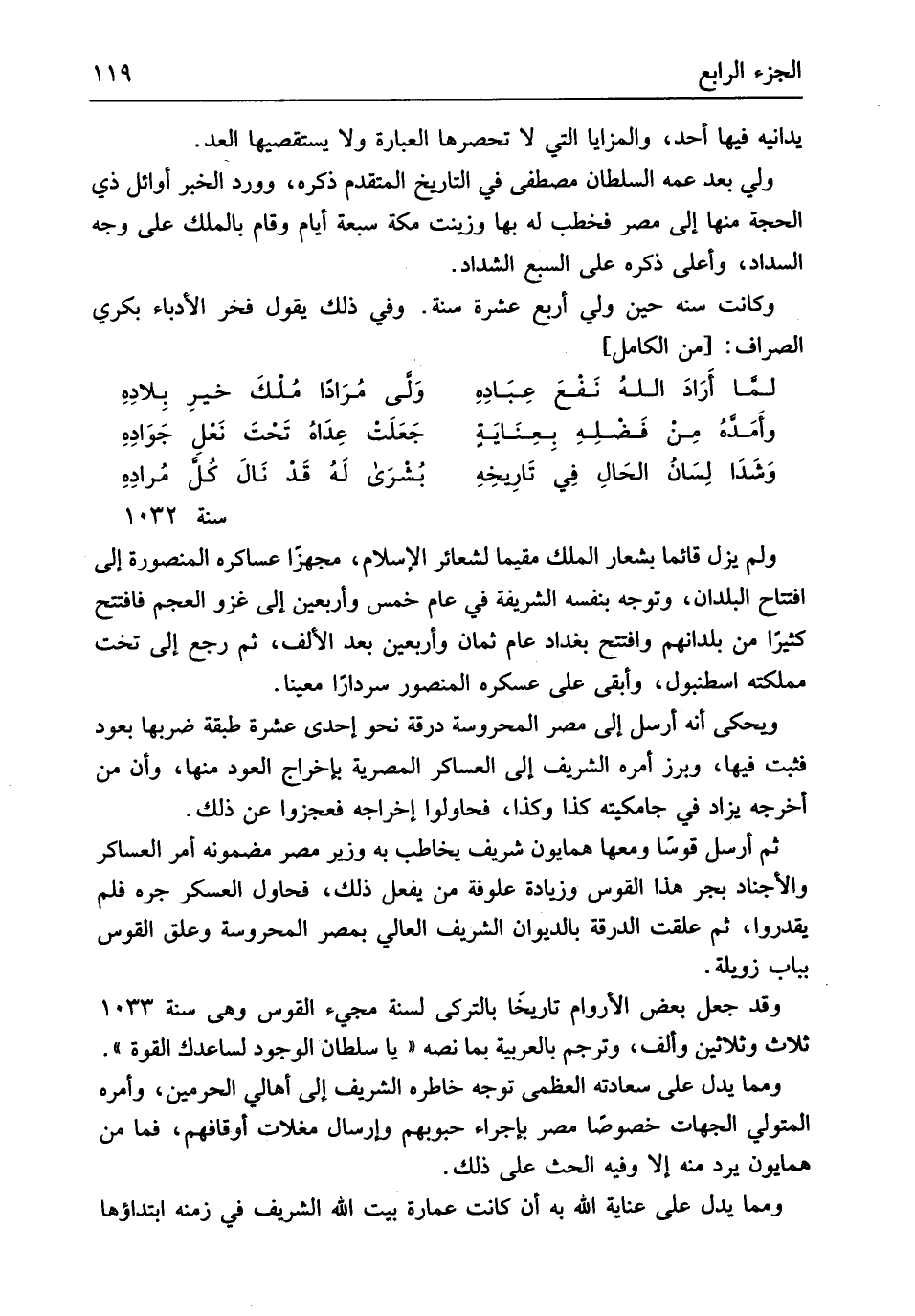 سنة 1032 وَلم يزل قَائِما بشعار الْملك مُقيما لشعائر الْإِسْلَام مجهزاً عساكره المنصورة إِلَى افْتِتَاح الْبلدَانِ وَتوجه بِنَفسِهِ الشَّرِيفَة فِي عَام خمس وَأَرْبَعين إِلَى غَزْو الْعَجم فَافْتتحَ كثيرا من بلدانهم وافتتح بَغْدَاد عَام ثَمَان وَأَرْبَعين بعد الْألف ثمَّ رَجَعَ إِلَى تخت مَمْلَكَته اسطنبول وَأبقى على عسكره الْمَنْصُور سرداراً معينا ويحكى أَنه أرسل إِلَى مصر المحروسة درقة نَحْو إِحْدَى عشرَة طبقَة ضربهَا بِعُود فَثَبت فِيهَا وبرز أمره الشريف إِلَى العساكر المصرية بِإِخْرَاج الْعود مِنْهَا وَأَن من أخرجه يُزَاد فِي جامكيته كَذَا وَكَذَا فحاولوا إِخْرَاجه فعجزوا عَن ذَلِك ثمَّ أرسل قوساً وَمَعَهَا همايون شرِيف يُخَاطب بِهِ وَزِير مصر مضمونه أَمر العساكر والأجناد بجر هَذَا الْقوس وَزِيَادَة علوفة من يفعل ذَلِك فحاول الْعَسْكَر جَرّه فَلم يقدروا ثمَّ علقت الدرقة بالديوان الشريف العالي بِمصْر المحروسة وعلق الْقوس بِبَاب زويلة وَقد جعل بعض الأورام تَارِيخا بالتركى لسنة مجيْ الْقوس وَهِي سنة 1033 ثَلَاث وَثَلَاثِينَ وَألف وَترْجم بِالْعَرَبِيَّةِ بِمَا نَصه يَا سُلْطَان الْوُجُود لساعدك الْقُوَّة وَمِمَّا يدل على سعادته الْعُظْمَى توجه خاطره الشريف إِلَى أهالي الْحَرَمَيْنِ وَأمره الْمُتَوَلِي الْجِهَات خُصُوصا مصر بإجراء حبوبهم وإرسال مغلات أوقافهم فَمَا من همايون يرد مِنْهُ إِلَّا وَفِيه الْحَث على ذَلِك وَمِمَّا يدل على عناية الله بِهِ أَن كَانَت عمَارَة بَيت الله الشريف فِي زَمَنه ابْتِدَاؤُهَا