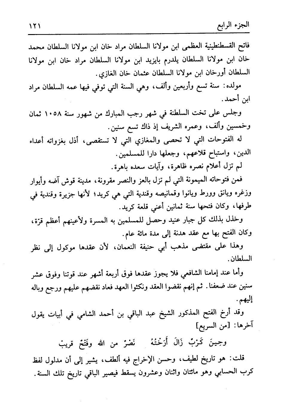 فاتح الْقُسْطَنْطِينِيَّة الْعُظْمَى ابْن مَوْلَانَا السُّلْطَان مُرَاد خَان ابْن مَوْلَانَا السُّلْطَان مُحَمَّد خَان ابْن مَوْلَانَا السُّلْطَان يلدرم بايزيد ابْن مَوْلَانَا السُّلْطَان مُرَاد خَان ابْن مَوْلَانَا السُّلْطَان أورخان ابْن مَوْلَانَا السُّلْطَان عُثْمَان خَان الْغَازِي مولده سنة تسع وَأَرْبَعين وَألف وَهِي السّنة الَّتِي توفّي فِيهَا عَمه السُّلْطَان مُرَاد ابْن أَحْمد وَجلسَ على تخت السلطنة فِي شهر رَجَب الْمُبَارك من شهور سنة 1058 ثَمَان وَخمسين وَألف وعمره الشريف إِذْ ذَاك تسع سِنِين لَهُ الفتوحات الَّتِي لَا تحصى والمغازي الَّتِي لَا تستقصى أذلّ بغزواته أَعدَاء الدّين واستباح قلاعهم وَجعلهَا دَارا للْمُسلمين لم تزل أَعْلَام نَصره ظَاهِرَة وآيات سعده باهرة فَمن فتوحاته الميمونة الَّتِي لم تزل بالعز والنصر مقرونة مَدِينَة قوش آضه وأيوار وزغره ويانق وورط ويانوا وقمانيصه وقندية الَّتِي هِيَ كريد لِأَنَّهَا جَزِيرَة وقندية فِي طرفها وَكَانَ فتحهَا سنة ثَمَانِينَ أَعنِي قلعة كريد وخذل بذلك كل جَبَّار عنيد وَحصل للْمُسلمين بِهِ المسرة ولأعينهم أعظم قُرَّة وَكَانَ الْفَتْح بهَا مَعَ عقد هدنة إِلَى مُدَّة مائَة عَام وَهَذَا على مُقْتَضى مَذْهَب أبي حنيفَة النُّعْمَان لِأَن عقدهَا موكول إِلَى نظر السُّلْطَان وَأما عِنْد إمامنا الشَّافِعِي فَلَا يجوز عقدهَا فَوق أَرْبَعَة أشهر عِنْد قوتنا وَفَوق عشر سِنِين عِنْد ضعفنا ثمَّ إِنَّهُم نقضوا العقد وَنَكَثُوا الْعَهْد فَعَاد نقضهم عَلَيْهِ وَرجع وباله إِلَيْهِم وَقد أرخ الْفَتْح الْمَذْكُور الشَّيْخ عبد الْبَاقِي بن أَحْمد الشَّامي فِي أَبْيَات يَقُول آخرهَا // (من السَّرِيع) //
