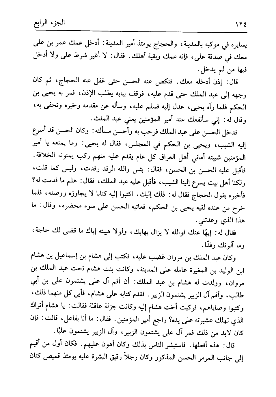 يسايره فِي موكبه بِالْمَدِينَةِ وَالْحجاج يَوْمئِذٍ أَمِير الْمَدِينَة أَدخل عمك عمر بن عَليّ مَعَك فِي صَدَقَة عَليّ فَإِنَّهُ عمك وَبَقِيَّة أهلك فَقَالَ لَا أغير شَرط عَليّ وَلَا أَدخل فِيهَا من لم يدْخل قَالَ إِذن أدخلهُ مَعَك فنكص عَنهُ الْحسن حَتَّى غفل عَنهُ الْحجَّاج ثمَّ كَانَ وَجهه إِلَى عبد الْملك حَتَّى قدم عَلَيْهِ فَوقف بِبَابِهِ يطْلب الْإِذْن فَمر بِهِ يحيى بن الحكم فَلَمَّا رَآهُ يحيى عدل إِلَيْهِ فَسلم عَلَيْهِ وَسَأَلَهُ عَن مقدمه وَخَبره وتحفى بِهِ وَقَالَ لَهُ إِنِّي سأنفعك عِنْد أَمِير الْمُؤمنِينَ يَعْنِي عبد الْملك فَدخل الْحسن على عبد الْملك فَرَحَّبَ بِهِ وَأحسن مَسْأَلته وَكَانَ الْحسن قد أسْرع إِلَيْهِ الشيب وَيحيى بن الحكم فِي الْمجْلس فَقَالَ لَهُ يحيى وَمَا يمنعهُ يَا أَمِير الْمُؤمنِينَ شيبته أماني أهل الْعرَاق كل عَام يقدم عَلَيْهِ مِنْهُم ركب يمنونه الْخلَافَة فَأقبل عَلَيْهِ الْحسن بن الْحسن فَقَالَ بئس وَالله الرفد رفدت وَلَيْسَ كَمَا قلت وَلَكنَّا أهل بَيت يسْرع إِلَيْنَا الشيب فَأقبل عَلَيْهِ عبد الْملك فَقَالَ هَلُمَّ مَا قدمت لَهُ فَأخْبرهُ بقول الْحجَّاج فَقَالَ لَهُ ذَلِك إِلَيْك اكتبوا إِلَيْهِ كتابا لَا يُجَاوِزهُ وَوَصله فَلَمَّا خرج من عِنْده لقِيه يحيى بن الحكم فَعَاتَبَهُ الْحسن على سوء محضره وَقَالَ مَا هَذَا الَّذِي وَعَدتنِي فَقَالَ لَهُ إيهاً عَنْك فوَاللَّه لَا يزَال يهابك وَلَوْلَا هيبته إياك مَا قضى لَك حَاجَة وَمَا آلوتك رفدَاً وَكَانَ عبد الْملك بن مَرْوَان غضب عَلَيْهِ فَكتب إِلَى هِشَام بن إِسْمَاعِيل بن هِشَام ابْن الْوَلِيد بن الْمُغيرَة عَامله على الْمَدِينَة وَكَانَت بنت هِشَام تَحت عبد الْملك بن مَرْوَان وَولدت لَهُ هِشَام بن عبد الْملك أَن أقِم آل عَليّ يشتمون عَليّ بن أبي طَالب وأقم آل الزبير يشتمون الزبير فَقدم كِتَابه على هِشَام فَأبى كل مِنْهُمَا ذَلِك وَكَتَبُوا وصاياهم فركبت أُخْت هِشَام إِلَيْهِ وَكَانَت جزلة عَاقِلَة فَقَالَت يَا هِشَام أتراك الَّذِي تهْلك عشيرته على يَده رَاجع أَمِير الْمُؤمنِينَ فَقَالَ مَا أَنا بفاعل قَالَت فَإِن كَانَ لَا بُد من ذَلِك فَمر آل عَليّ يشتمون الزبير وَآل الزبير يشتمون عليا قَالَ هَذِه أَفعَلهَا فَاسْتَبْشَرَ النَّاس بذلك وَكَانَ أَهْون عَلَيْهِم فَكَانَ أول من أقيم إِلَى جَانب المرمر الْحسن الْمَذْكُور وَكَانَ رجلا رَقِيق الْبشرَة عَلَيْهِ يَوْمئِذٍ قَمِيص كتَّان