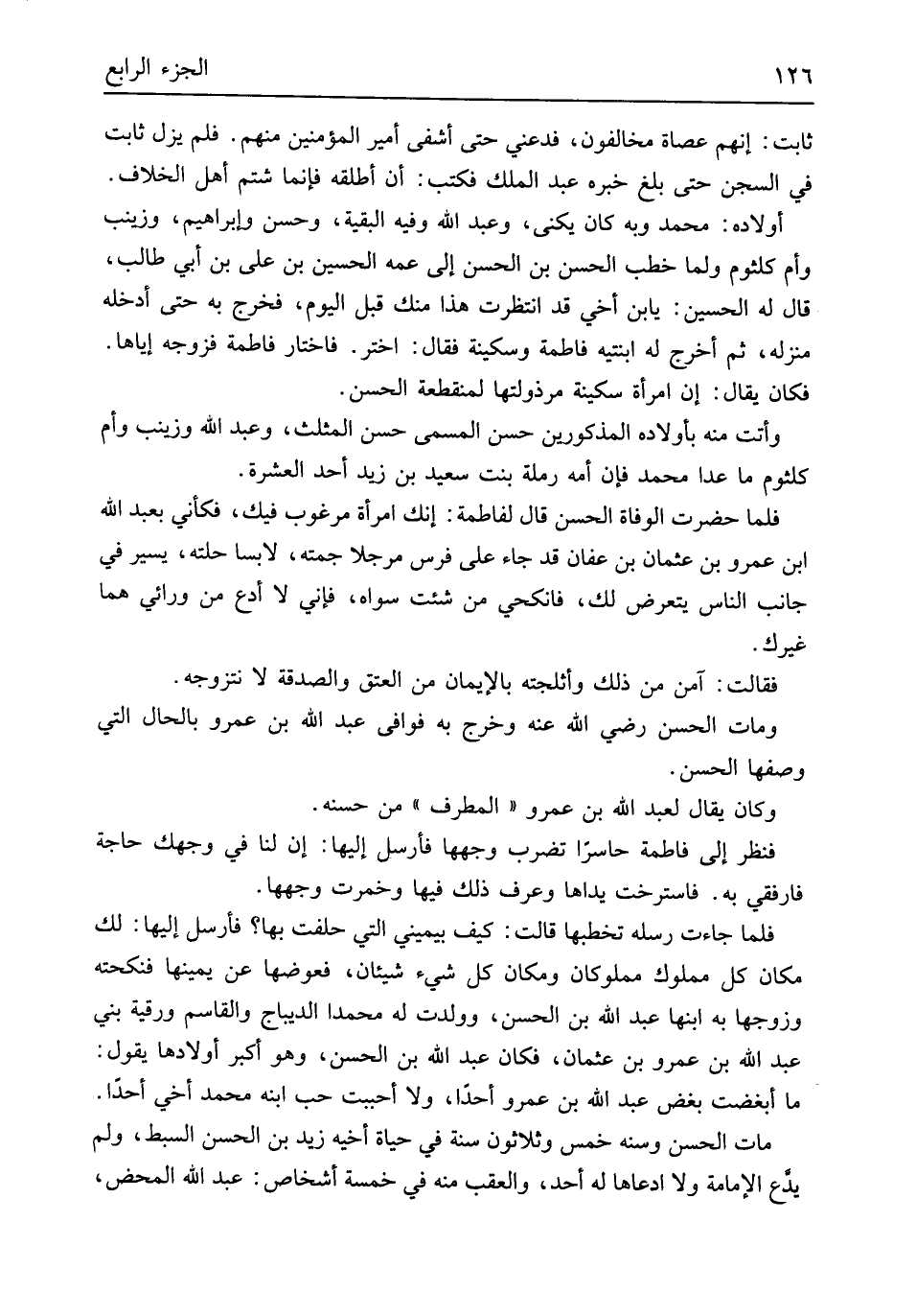 ثَابت إِنَّهُم عصاة مخالفون فَدَعْنِي حَتَّى أشفي أَمِير الْمُؤمنِينَ مِنْهُم فَلم يزل ثَابت فِي السجْن حَتَّى بلغ خَبره عبد الْملك فَكتب أَن أطلقهُ فَإِنَّمَا شتم أهل الْخلاف أَوْلَاده مُحَمَّد وَبِه كَانَ يكنى وَعبد الله وَفِيه الْبَقِيَّة وَحسن وَإِبْرَاهِيم وَزَيْنَب وَأم كُلْثُوم وَلما خطب الْحسن بن الْحسن إِلَى عَمه الْحُسَيْن بن عَليّ بن أبي طَالب قَالَ لَهُ الْحُسَيْن يَابْنَ أخي قد انتظرت هَذَا مِنْك قبل الْيَوْم فَخرج بِهِ حَتَّى أدخلهُ منزله ثمَّ أخرج لَهُ ابْنَتَيْهِ فَاطِمَة وسكينة فَقَالَ اختر فَاخْتَارَ فَاطِمَة فَزَوجهُ إِيَّاهَا فَكَانَ يَقُول إِن امْرَأَة سكينَة مرذولتها لمنقطعة الْحسن وَأَتَتْ مِنْهُ بأولاده الْمَذْكُورين حسن الْمُسَمّى حسن المثلث وَعبد الله وَزَيْنَب وَأم كُلْثُوم مَا عدا مُحَمَّد فَإِن أمه رَملَة بنت سعيد بن زيد أحد الْعشْرَة فَلَمَّا حضرت الْوَفَاة الْحسن قَالَ لفاطمة إِنَّك امْرَأَة مَرْغُوب فِيك فَكَأَنِّي بِعَبْد الله ابْن عَمْرو بن عُثْمَان بن عَفَّان قد جَاءَ على فرس مرجلاً جمته لابساً حلته يسير فِي جَانب النَّاس يتَعَرَّض لَك فَانْكِحِي من شِئْت سواهُ فَإِنِّي لَا أدع من ورائي هما غَيْرك فَقَالَت آمن من ذَلِك وأثلجته بِالْإِيمَان من الْعتْق وَالصَّدَََقَة لَا نتزوجه وَمَات الْحسن رَضِي الله عَنهُ وَخرج بِهِ فَوَافى عبد الله بن عَمْرو بِالْحَال الَّتِي وصفهَا الْحسن وَكَانَ يُقَال لعبد الله بن عَمْرو الْمطرف من حسنه فَنظر إِلَى فَاطِمَة حاسراً تضرب وَجههَا فَأرْسل إِلَيْهَا إِن لنا فِي وَجهك حَاجَة فارفقي بِهِ فاسترخت يداها وَعرف ذَلِك فِيهَا وخمرت وَجههَا فَلَمَّا جَاءَت رسله تخطبها قَالَت كَيفَ بيميني الَّتِي حَلَفت بهَا فَأرْسل إِلَيْهَا لَك مَكَان كل مَمْلُوك مملوكان وَمَكَان كل شَيْء شَيْئَانِ فعوضها عَن يَمِينهَا فنكحته وَزوجهَا بِهِ ابْنهَا عبد الله بن الْحسن وَولدت لَهُ مُحَمَّدًا الديباج وَالقَاسِم ورقية بني عبد الله بن عَمْرو بن عُثْمَان فَكَانَ عبد الله بن الْحسن وَهُوَ أكبر أَوْلَادهَا يَقُول مَا أبغضت بغض عبد الله بن عَمْرو أحدا وَلَا أَحْبَبْت حب ابْنه مُحَمَّد أخي أحدا مَاتَ الْحسن وسنه خمس وَثَلَاثُونَ سنة فِي حَيَاة أَخِيه زيد بن الْحسن السبط وَلم يدع الْإِمَامَة وَلَا ادَّعَاهَا لَهُ أحد والعقب مِنْهُ فِي خَمْسَة أشخاص عبد الله الْمَحْض