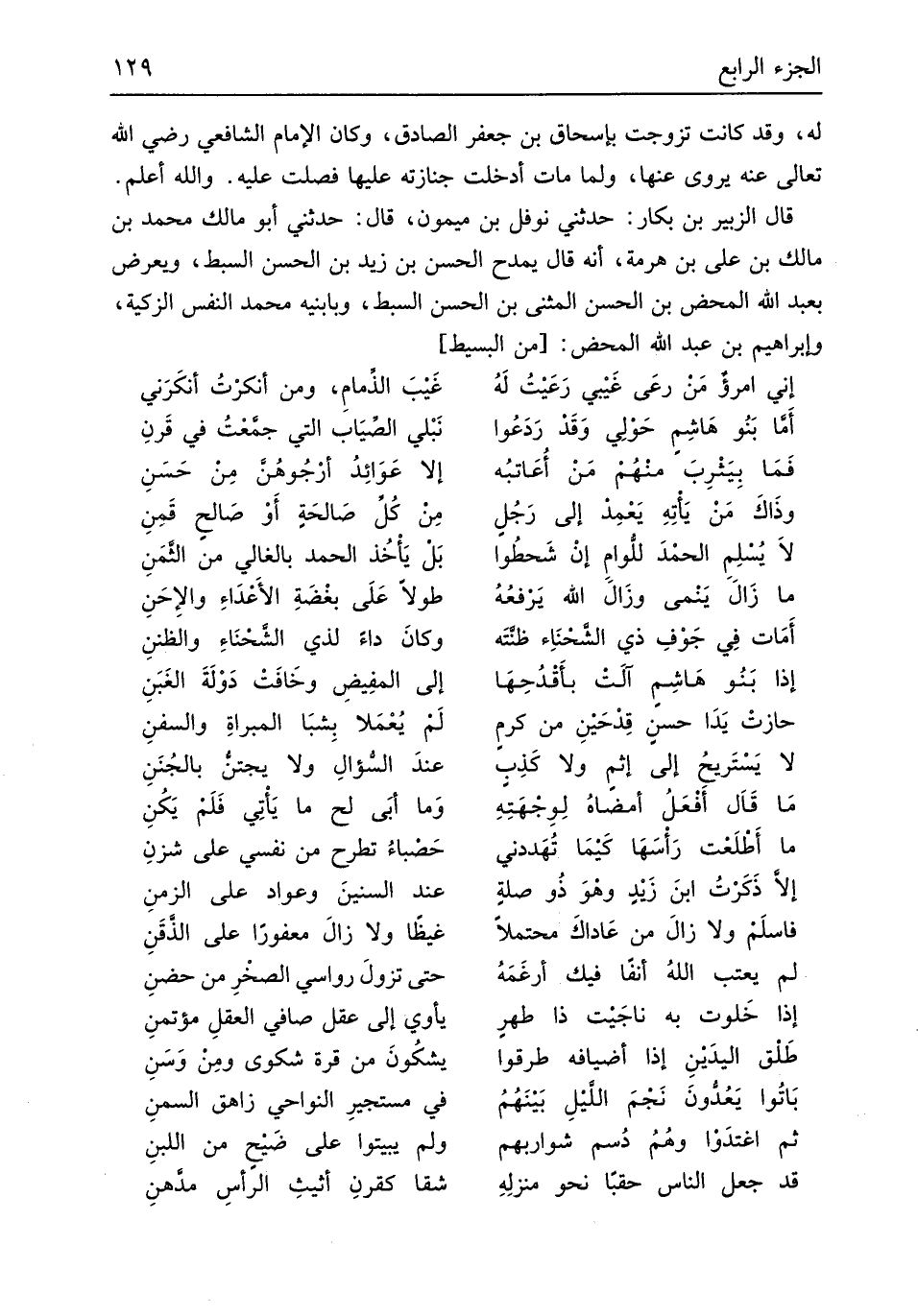 لَهُ وَقد كَانَت تزوجت بِإسْحَاق بن جَعْفَر الصَّادِق وَكَانَ الإِمَام الشَّافِعِي رَضِي الله تَعَالَى عَنهُ يروي عَنْهَا وَلما مَاتَ أدخلت جنَازَته عَلَيْهَا فصلت عَلَيْهِ وَالله أعلم قَالَ الزبير بن بكار حَدثنِي نَوْفَل بن مَيْمُون قَالَ حَدثنِي أَبُو مَالك مُحَمَّد بن مَالك بن عَليّ بن هرمة أَنه قَالَ يمدح الْحسن بن زيد بن الْحسن السبط ويعرض بِعَبْد الله الْمَحْض بن الْحسن الْمثنى بن الْحسن السبط وبابنيه مُحَمَّد النَّفس الزكية وَإِبْرَاهِيم بن عبد الله الْمَحْض من // (الْبَسِيط) //