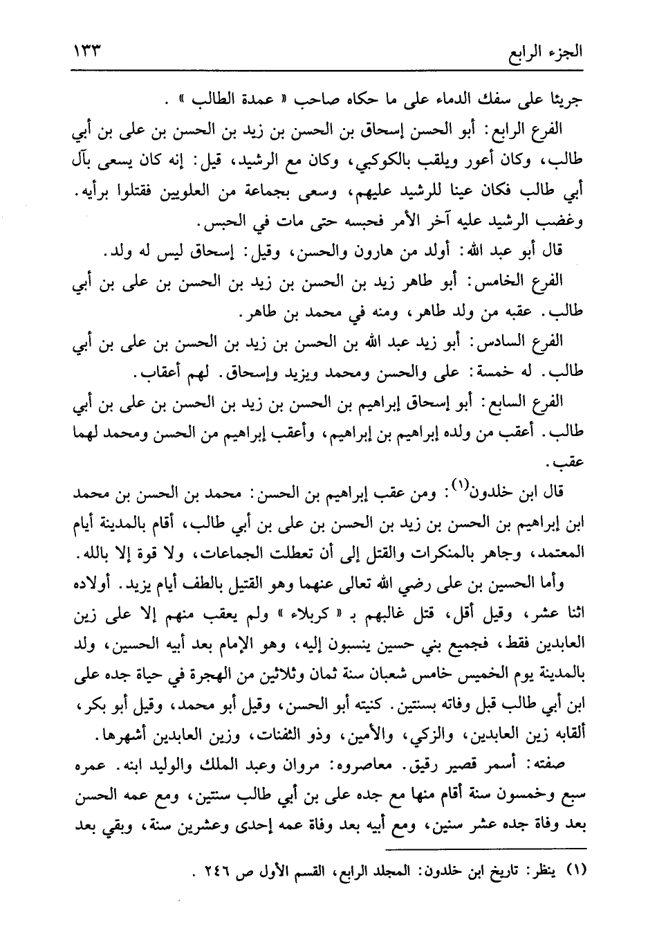 جريئاً على سفك الدِّمَاء على مَا حَكَاهُ صَاحب عُمْدَة الطَّالِب الْفَرْع الرَّابِع أَبُو الْحسن إِسْحَاق بن الْحسن بن زيد بن الْحسن بن عَليّ بن أبي طَالب وَكَانَ أَعور ويلقب بالكوكبي وَكَانَ مَعَ الرشيد قيل إِنَّه كَانَ يسْعَى بآل أبي طَالب فَكَانَ عينا للرشيد عَلَيْهِم وسعى بِجَمَاعَة من العلويين فَقتلُوا بِرَأْيهِ وَغَضب الرشيد عَلَيْهِ آخر الْأَمر فحسبه حَتَّى مَاتَ فِي الْحَبْس قَالَ أَبُو عبد الله أولد من هَارُون وَالْحسن وَقيل إِسْحَاق لَيْسَ لَهُ ولد الْفَرْع الْخَامِس أَبُو طَاهِر زيد بن الْحسن بن زيد بن الْحسن بن عَليّ بن أبي طَالب عقبه من ولد طَاهِر وَمِنْه فِي مُحَمَّد بن طَاهِر الْفَرْع السَّادِس أَبُو زيد عبد الله بن الْحُسَيْن بن زيد بن الْحُسَيْن بن عَليّ بن أبي طَالب لَهُ خَمْسَة عَليّ وَالْحسن وَمُحَمّد وَيزِيد وَإِسْحَاق لَهُم أعقاب الْفَرْع السَّابِع أَبُو إِسْحَاق إِبْرَاهِيم بن الْحسن بن زيد بن الْحسن بن عَليّ بن أبي طَالب أعقب من وَلَده إِبْرَاهِيم بن إِبْرَاهِيم وأعقب إِبْرَاهِيم من الْحسن وَمُحَمّد لَهما عقب قَالَ ابْن خلدون وَمن عقب إِبْرَاهِيم بن الْحسن مُحَمَّد بن الْحسن بن مُحَمَّد ابْن إِبْرَاهِيم بن الْحسن بن زيد بن الْحسن بن عَليّ بن أبي طَالب أَقَامَ بِالْمَدِينَةِ أَيَّام الْمُعْتَمد وجاهر بالمنكرات وَالْقَتْل إِلَى أَن تعطلت الْجَمَاعَات وَلَا قُوَّة إِلَّا بِاللَّه وَأما الْحُسَيْن بن عَليّ رَضِي الله تَعَالَى عَنْهُمَا وَهُوَ الْقَتِيل بالطف أَيَّام يزِيد أَوْلَاده اثْنَا عشر وَقيل أقل قتل غالبهم ب كربلاء وَلم يعقب مِنْهُم إِلَّا على زين العابدين فَقَط فَجَمِيع بني حُسَيْن ينسبون إِلَيْهِ وَهُوَ الإِمَام بعد أَبِيه الْحُسَيْن ولد بِالْمَدِينَةِ يَوْم الْخَمِيس خَامِس شعْبَان سنة ثَمَان وَثَلَاثِينَ من الْهِجْرَة فِي حَيَاة جده على ابْن أبي طَالب قبل وَفَاته بِسنتَيْنِ كنيته أَبُو الْحسن وَقيل أَبُو مُحَمَّد وَقيل أَبُو بكر ألقابه زين العابدين والزكي والأمين وَذُو الثفنات وزين العابدين أشهرها صفته أسمر قصير رَقِيق معاصروه مَرْوَان وَعبد الْملك والوليد ابْنه عمره سبع وَخَمْسُونَ سنة أَقَامَ مِنْهَا مَعَ جده عَليّ بن أبي طَالب سنتَيْن وَمَعَ عَمه الْحسن بعد وَفَاة جده عشر سِنِين وَمَعَ أَبِيه بعد وَفَاة عَمه إِحْدَى وَعشْرين سنة وَبَقِي بعد