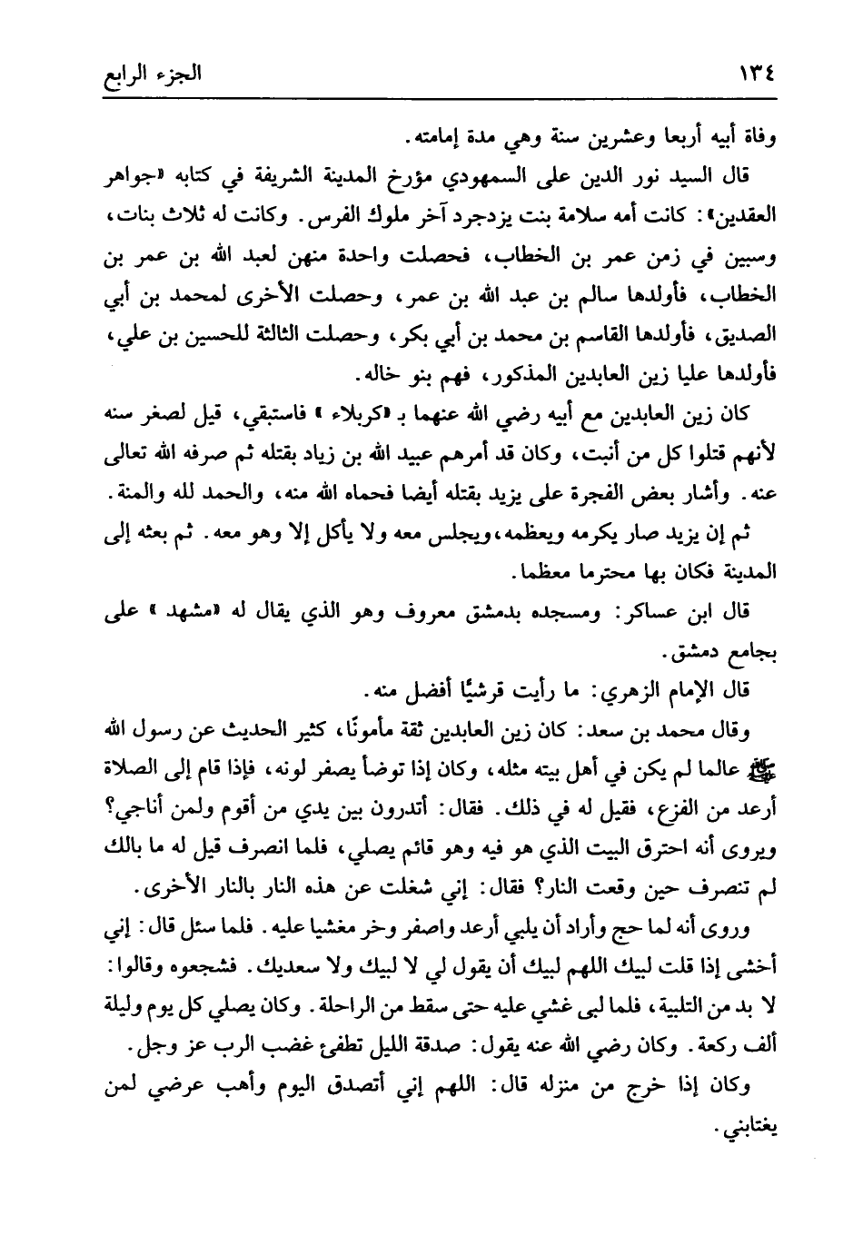 عَالما لم يكن فِي أهل بَيته مثله وَكَانَ إِذا تَوَضَّأ يصفر لَونه فَإِذا قَامَ إِلَى الصَّلَاة أرعد من الْفَزع فَقيل لَهُ فِي ذَلِك فَقَالَ أَتَدْرُونَ بَين يَدي من أقوم وَلمن أُنَاجِي ويروى أَنه احْتَرَقَ الْبَيْت الَّذِي هُوَ فِيهِ وَهُوَ قَائِم يُصَلِّي فَلَمَّا انْصَرف قيل لَهُ مَا بالك لم تَنْصَرِف حِين وَقعت النَّار فَقَالَ إِنِّي شغلت عَن هَذِه النَّار بالنَّار الْأُخْرَى وروى أَنه لما حج وَأَرَادَ أَن يُلَبِّي أرعد واصفر وخر مغشياً عَلَيْهِ فَلَمَّا سُئِلَ قَالَ إِنِّي أخْشَى إِذا قلت لبيْك اللَّهُمَّ لبيْك أَن يَقُول لي لَا لبيْك وَلَا سعديك فشجعوه وَقَالُوا لَا بُد من التَّلْبِيَة فَلَمَّا لبّى غشي عَلَيْهِ حَتَّى سقط من الرَّاحِلَة وَكَانَ يُصَلِّي كل يَوْم وَلَيْلَة ألف رَكْعَة وَكَانَ رَضِي الله عَنهُ يَقُول صَدَقَة اللَّيْل تُطْفِئ غضب الرب عز وَجل وَكَانَ إِذا خرج من منزله قَالَ اللَّهُمَّ إِنِّي أَتصدق الْيَوْم وَأهب عرضي لمن يغتابني