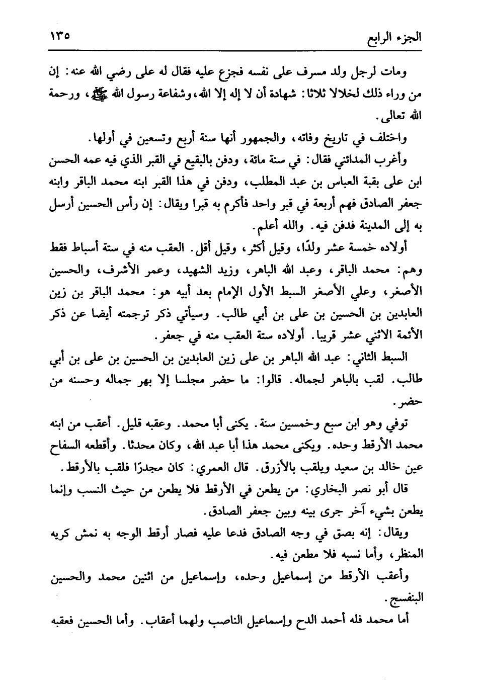 وَرَحْمَة الله تَعَالَى وَاخْتلف فِي تَارِيخ وَفَاته وَالْجُمْهُور أَنَّهَا سنة أَربع وَتِسْعين فِي أَولهَا وَأغْرب الْمَدَائِنِي فَقَالَ فِي سنة مائَة وَدفن بِالبَقِيعِ فِي الْقَبْر الَّذِي فِيهِ عَمه الْحسن ابْن عَليّ بقبة الْعَبَّاس بن عبد الْمطلب وَدفن فِي هَذَا الْقَبْر ابْنه مُحَمَّد الباقر وَابْنه جَعْفَر الصَّادِق فهم أَرْبَعَة فِي قبر وَاحِد فَأكْرم بِهِ قبراً وَيُقَال إِن رَأس الْحُسَيْن أرسل بِهِ إِلَى الْمَدِينَة فَدفن فِيهِ وَالله أعلم أَوْلَاده خَمْسَة عشر ولدا وَقيل أَكثر وَقيل أقل الْعقب مِنْهُ فِي سِتَّة أَسْبَاط فَقَط وهم مُحَمَّد الباقر وَعبد الله الباهر وَزيد الشَّهِيد وَعمر الْأَشْرَف وَالْحُسَيْن الْأَصْغَر وَعلي الْأَصْغَر السبط الأول الإِمَام بعد أَبِيه هُوَ مُحَمَّد الباقر بن زين العابدين بن الْحُسَيْن بن عَليّ بن أبي طَالب وَسَيَأْتِي ذكر تَرْجَمته أَيْضا عَن ذكر الأتمة الاثْنَي عشر قَرِيبا أَوْلَاده سِتَّة الْعقب مِنْهُ فِي جَعْفَر السبط الثَّانِي عبد الله الباهر بن عَليّ زين العابدين بن الْحُسَيْن بن عَليّ بن أبي طَالب لقب بالباهر لجماله قَالُوا مَا حضر مَجْلِسا إِلَّا بهر جماله وَحسنه من حضر توفّي وَهُوَ ابْن سبع وَخمسين سنة يكنى أَبَا مُحَمَّد وعقبه قَلِيل أعقب من ابْنه مُحَمَّد الأرقط وَحده ويكنى مُحَمَّد هَذَا أَبَا عبد الله وَكَانَ مُحدثا وأقطعه السفاح عين خَالِد بن سعيد ويلقب بالأزرق قَالَ الْعمريّ كَانَ مجدراً فلقب بالأرقط قَالَ أَبُو نصر البُخَارِيّ من يطعن فِي الأرقط فَلَا يطعن من حَيْثُ النّسَب وَإِنَّمَا يطعن بِشَيْء آخر جرى بَينه وَبَين جَعْفَر الصَّادِق وَيُقَال إِنَّه بَصق فِي وَجه الصَّادِق فَدَعَا عَلَيْهِ فَصَارَ أرقط الْوَجْه بِهِ نمش كريه المنظر وَأما نسبه فَلَا مطْعن فِيهِ وأعقب الأرقط من إِسْمَاعِيل وَحده وَإِسْمَاعِيل من اثْنَيْنِ مُحَمَّد وَالْحُسَيْن البنفسج أما مُحَمَّد فَلهُ أَحْمد الدح وَإِسْمَاعِيل الناصب وَلَهُمَا أعقاب وَأما الْحُسَيْن فعقبه