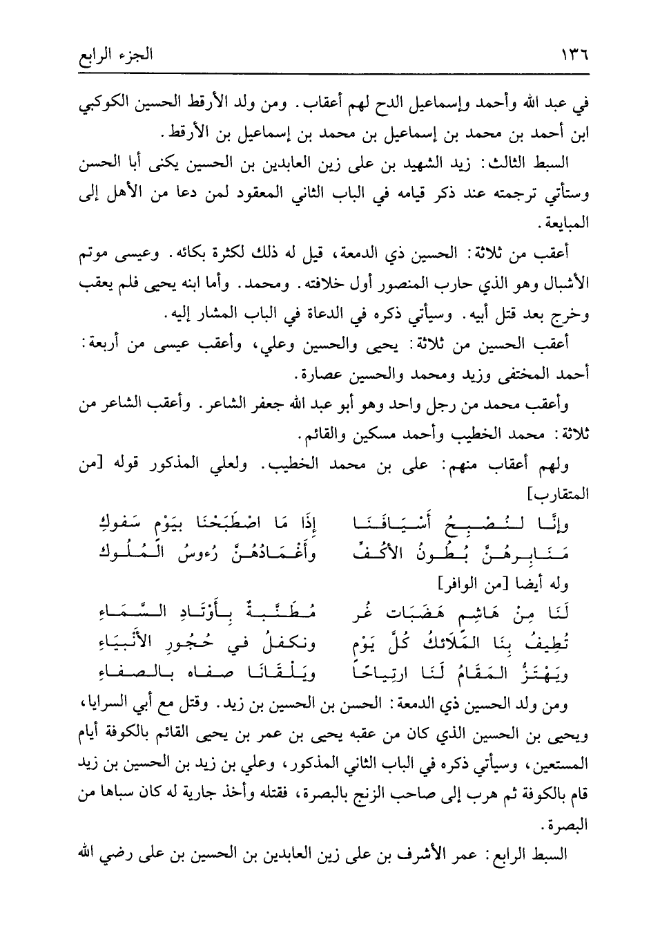 فِي عبد الله وَأحمد وَإِسْمَاعِيل الدح لَهُم أعقاب وَمن ولد الأرقط الْحُسَيْن الكوكبي ابْن أَحْمد بن مُحَمَّد بن إِسْمَاعِيل بن مُحَمَّد بن إِسْمَاعِيل بن الأرقط السبط الثَّالِث زيد الشَّهِيد بن عَليّ زين العابدين بن الْحُسَيْن يكنى أَبَا الْحسن وَسَتَأْتِي تَرْجَمته عِنْد ذكر قِيَامه فِي الْبَاب الثَّانِي الْمَعْقُود لمن دَعَا من الْأَهْل إِلَى الْمُبَايعَة أعقب من ثَلَاثَة الْحُسَيْن ذِي الدمعة قيل لَهُ ذَلِك لِكَثْرَة بكائه وَعِيسَى موتم الأشبال وَهُوَ الَّذِي حَارب الْمَنْصُور أول خِلَافَته وَمُحَمّد وَأما ابْنه يحيى فَلم يعقب وَخرج بعد قتل أَبِيه وَسَيَأْتِي ذكره فِي الدعاة فِي الْبَاب الْمشَار إِلَيْهِ أعقب الْحُسَيْن من ثَلَاثَة يحيى وَالْحُسَيْن وَعلي وأعقب عِيسَى من أَرْبَعَة أَحْمد المختفي وَزيد وَمُحَمّد وَالْحُسَيْن عصارة وأعقب مُحَمَّد من رجل وَاحِد وَهُوَ أَبُو عبد الله جَعْفَر الشَّاعِر وأعقب الشَّاعِر من ثَلَاثَة مُحَمَّد الْخَطِيب وَأحمد مِسْكين والقائم وَلَهُم أعقاب مِنْهُم عَليّ بن مُحَمَّد الْخَطِيب ولعلي الْمَذْكُور قَوْله // (من المتقارب) //