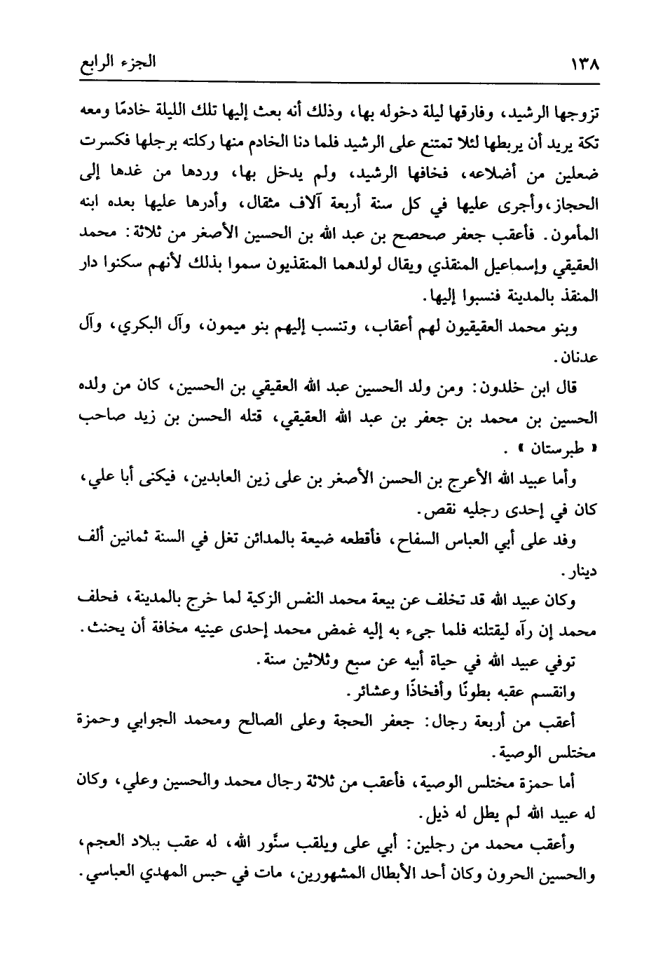 تزَوجهَا الرشيد وفارقها لَيْلَة دُخُوله بهَا وَذَلِكَ أَنه بعث إِلَيْهَا تِلْكَ اللَّيْلَة خَادِمًا وَمَعَهُ تكة يُرِيد أَن يربطها لِئَلَّا تمْتَنع على الرشيد فَلَمَّا دنا الْخَادِم مِنْهَا ركلته برجلها فَكسرت ضعلين من أضلاعه فخافها الرشيد وَلم يدْخل بهَا وردهَا من غدها إِلَى الْحجاز وأجرى عَلَيْهَا فِي كل سنة أَرْبَعَة آلَاف مِثْقَال وأدرها عَلَيْهَا بعده ابْنه الْمَأْمُون فأعقب جَعْفَر صحصح بن عبد الله بن الْحُسَيْن الْأَصْغَر من ثَلَاثَة مُحَمَّد العقيقي وَإِسْمَاعِيل المنقذي وَيُقَال لولدهما المنقذيون سموا بذلك لأَنهم سكنوا دَار المنقذ بِالْمَدِينَةِ فنسبوا إِلَيْهَا وَبَنُو مُحَمَّد العقيقيون لَهُم أعقاب وتنسب إِلَيْهِم بَنو مَيْمُون وَآل الْبكْرِيّ وَآل عدنان قَالَ ابْن خلدون وَمن ولد الْحُسَيْن عبد الله العقيقي بن الْحُسَيْن كَانَ من وَلَده الْحُسَيْن بن مُحَمَّد بن جَعْفَر بن عبد الله العقيقي فتله الْحسن بن زيد صَاحب طبرستان وَأما عبيد الله الْأَعْرَج بن الْحسن الْأَصْغَر بن عَليّ زين العابدين فيكنى أَبَا عَليّ كَانَ فِي إِحْدَى رجلَيْهِ نقص وَفد على أبي الْعَبَّاس السفاح فأقطعه ضَيْعَة بِالْمَدَائِنِ تغل فِي السّنة ثَمَانِينَ ألف دِينَار وَكَانَ عبيد الله قد تخلف عَن بيعَة مُحَمَّد النَّفس الزكية لما خرج بِالْمَدِينَةِ فَحلف مُحَمَّد إِن رَآهُ لَيَقْتُلَنهُ فَلَمَّا جِيءَ بِهِ إِلَيْهِ غمض مُحَمَّد إِحْدَى عَيْنَيْهِ مَخَافَة أَن يَحْنَث توفّي عبيد الله فِي حَيَاة أَبِيه عَن سبع وَثَلَاثِينَ سنة وانقسم عقبه بطوناً وأفخاذاً وعشائر أعقب من أَرْبَعَة رجال جَعْفَر الْحجَّة وَعلي الصَّالح وَمُحَمّد الجوابي وَحَمْزَة مختلس الْوَصِيَّة أما حَمْزَة مختلس الْوَصِيَّة فأعقب من ثَلَاثَة رجال مُحَمَّد وَالْحُسَيْن وَعلي وَكَانَ لَهُ عبيد الله لم يطلّ لَهُ ذيل وأعقب مُحَمَّد من رجلَيْنِ أبي عَليّ ويلقب سنَّور الله لَهُ عقب بِبِلَاد الْعَجم وَالْحُسَيْن الحرون وَكَانَ أحد الْأَبْطَال الْمَشْهُورين مَاتَ فِي حبس الْمهْدي العباسي