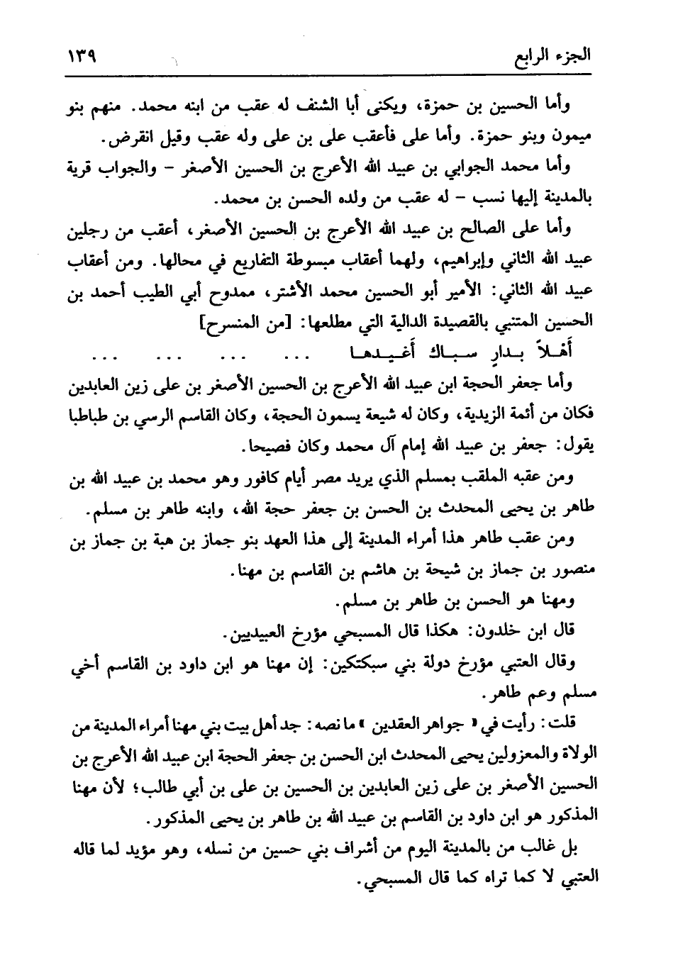 وَأما جَعْفَر الْحجَّة ابْن عبيد الله الْأَعْرَج بن الْحُسَيْن الْأَصْغَر بن عَليّ زين العابدين فَكَانَ من أَئِمَّة الزيدية وَكَانَ لَهُ شيعَة يسمون الْحجَّة وَكَانَ الْقَاسِم الرسي بن طَبَاطَبَا يَقُول جَعْفَر بن عبيد الله إِمَام آل مُحَمَّد وَكَانَ فصيحاً وَمن عقبه الملقب بِمُسلم الَّذِي يُرِيد مصر أَيَّام كافور وَهُوَ مُحَمَّد بن عبيد الله بن طَاهِر بن يحيى الْمُحدث بن الْحسن بن جَعْفَر حجَّة الله وَابْنه طَاهِر بن مُسلم وَمن عقب طَاهِر هَذَا أُمَرَاء الْمَدِينَة إِلَى هَذَا الْعَهْد بَنو جماز بن هبة بن جماز بن مَنْصُور بن جماز بن شيحة بن هَاشم بن الْقَاسِم بن مهنا ومهنا هُوَ الْحسن بن طَاهِر بن مُسلم قَالَ ابْن خلدون هَكَذَا قَالَ المسبحي مؤرخ العبيديين وَقَالَ الْعُتْبِي مؤرخ دولة بني سبكتكين إِن مهنا هُوَ ابْن دَاوُد بن الْقَاسِم أخي مُسلم وَعم طَاهِر قلت رَأَيْت فِي جَوَاهِر الْعقْدَيْنِ مَا نَصه جد أهل بَيت بني مهنا أُمَرَاء الْمَدِينَة من الْوُلَاة والمعزولين يحيى الْمُحدث ابْن الْحسن بن جَعْفَر الْحجَّة ابْن عبيد الله الْأَعْرَج بن الْحُسَيْن الْأَصْغَر بن عَليّ زين العابدين بن الْحُسَيْن بن عَليّ بن أبي طَالب لِأَن مهنا الْمَذْكُور هُوَ ابْن دَاوُد بن الْقَاسِم بن عبيد الله بن طَاهِر بن يحيى الْمَذْكُور بل غَالب من بِالْمَدِينَةِ الْيَوْم من أَشْرَاف بني حُسَيْن من نَسْله وَهُوَ مؤيد لما قَالَه الْعُتْبِي لَا كَمَا ترَاهُ كَمَا قَالَ المسبحي