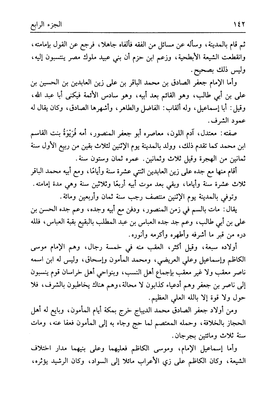ثمَّ قَامَ بِالْمَدِينَةِ وَسَأَلَهُ عَن مسَائِل من الْفِقْه فألفاه جَاهِلا فَرجع عَن القَوْل بإمامته وانقطعت الشِّيعَة الأبطحية وَزعم ابْن حزم أَن بني عبيد مُلُوك مصر ينتسبون إِلَيْهِ وَلَيْسَ ذَلِك بِصَحِيح وَأما الإِمَام جَعْفَر الصَّادِق بن مُحَمَّد الباقر بن عَليّ زين العابدين بن الْحُسَيْن بن عَليّ بن أبي طَالب وَهُوَ الْقَائِم بعد أَبِيه وَهُوَ سادس الْأَئِمَّة فيكنى أَبَا عبد الله وَقيل أَبَا إِسْمَاعِيل وَله ألقاب الْفَاضِل والطاهر وأشهرها الصَّادِق وَكَانَ يُقَال لَهُ عَمُود الشّرف صفته معتدل آدم اللَّوْن معاصره أَبُو جَعْفَر الْمَنْصُور أمه فُرَيْوَةُ بنت الْقَاسِم ابْن مُحَمَّد كَمَا تقدم ذَلِك وَولد بِالْمَدِينَةِ يَوْم الْإِثْنَيْنِ لثلاث بَقينَ من ربيع الأول سنة ثَمَانِينَ من الْهِجْرَة وَقيل ثَلَاث وَثَمَانِينَ عمره ثَمَان وَسِتُّونَ سنة أَقَامَ مِنْهَا مَعَ جده عَليّ زين العابدين اثْنَتَيْ عشرَة سنة وأياماً وَمَعَ أَبِيه مُحَمَّد الباقر ثَلَاث عشرَة سنة وأياماً وَبَقِي بعد موت أَبِيه أَرْبعا وَثَلَاثِينَ سنة وَهِي مُدَّة إِمَامَته وَتُوفِّي بِالْمَدِينَةِ يَوْم الْإِثْنَيْنِ منتصف رَجَب سنة ثَمَان وَأَرْبَعين وَمِائَة يُقَال مَاتَ بالسم فِي زمن الْمَنْصُور وَدفن مَعَ أَبِيه وجده وَعم جده الْحسن بن عَليّ بن أبي طَالب وَعم جد جده الْعَبَّاس بن عبد الْمطلب بِالبَقِيعِ بَقِيَّة الْعَبَّاس فَللَّه دره من قبر مَا أشرفه وأطهره وأكرمه وأنوره أَوْلَاده سَبْعَة وَقيل أَكثر الْعقب مِنْهُ فِي خَمْسَة رجال وهم الإِمَام مُوسَى الكاظم وَإِسْمَاعِيل وَعلي العريضي وَمُحَمّد الْمَأْمُون وَإِسْحَاق وَلَيْسَ لَهُ ابْن اسْمه نَاصِر معقب وَلَا غير معقب بِإِجْمَاع أهل النّسَب وبنواحي أهل خُرَاسَان قوم ينسبون إِلَى نَاصِر بن جَعْفَر وهم أدعياء كذابون لَا محَالة وهم هُنَاكَ يخاطبون بالشرف فَلَا حول وَلَا قُوَّة إِلَّا بِاللَّه الْعلي الْعَظِيم وَمن أَوْلَاد جَعْفَر الصَّادِق مُحَمَّد الديباج خرج بِمَكَّة أَيَّام الْمَأْمُون وَبَايع لَهُ أهل الْحجاز بالخلافة وَحمله المعتصم لما حج وَجَاء بِهِ إِلَى الْمَأْمُون فَعَفَا عَنهُ وَمَات سنة ثَلَاث وَمِائَتَيْنِ بجرجان وَأما إِسْمَاعِيل الإِمَام ومُوسَى الكاظم فعلَيْهِمَا وعَلى بنيهما مدَار اخْتِلَاف الشِّيعَة وَكَانَ الكاظم على زِيّ الْأَعْرَاب مائلاً إِلَى السوَاد وَكَانَ الرشيد يؤثره