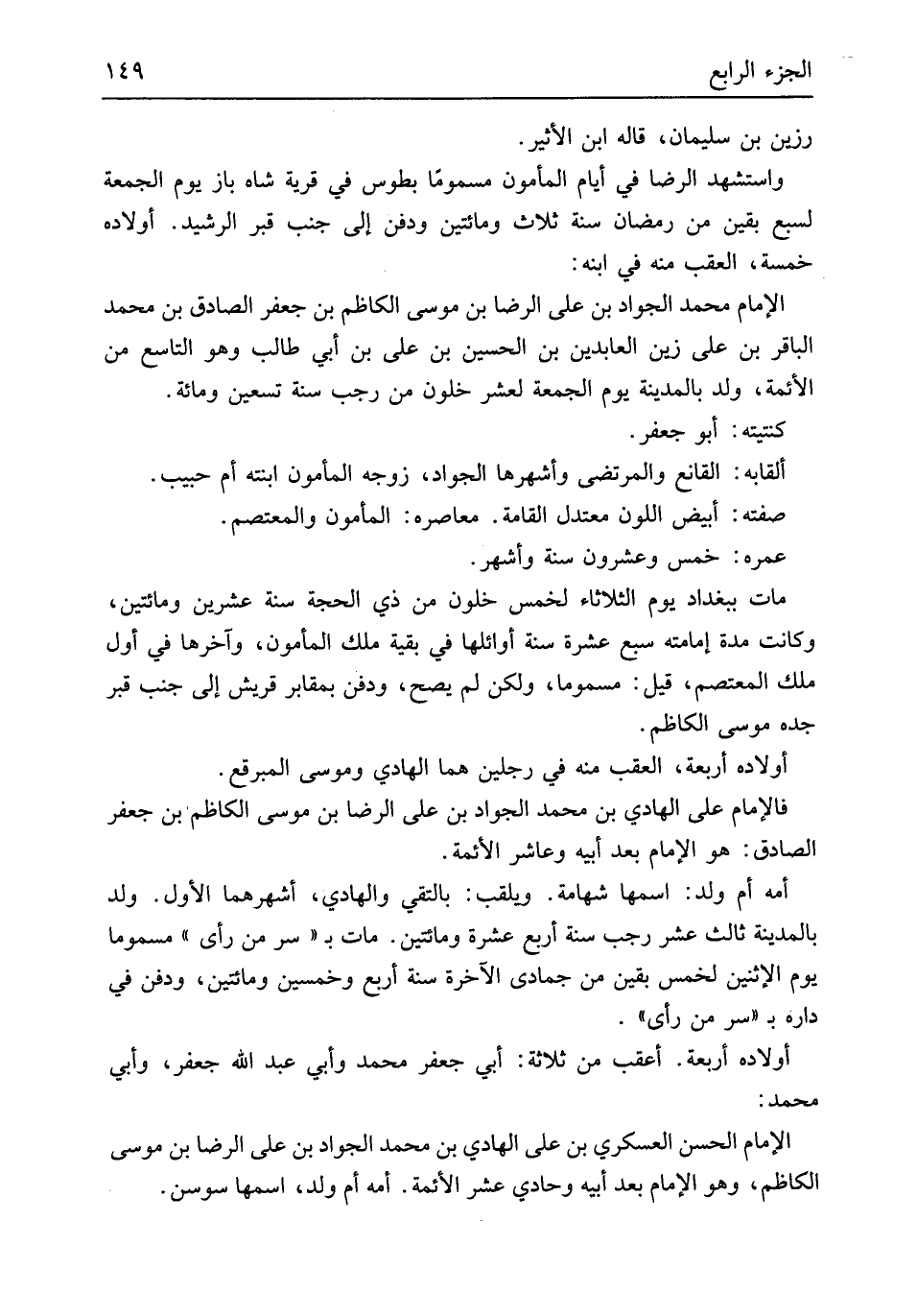 رزين بن سُلَيْمَان قَالَه ابْن الْأَثِير وَاسْتشْهدَ الرِّضَا فِي أَيَّام الْمَأْمُون مسموماً بطوس فِي قَرْيَة شاه باز يَوْم الْجُمُعَة لسبع بَقينَ من رَمَضَان سنة ثَلَاث وَمِائَتَيْنِ وَدفن إِلَى جنب قبر الرشيد أَوْلَاده خَمْسَة الْعقب مِنْهُ فِي ابْنه الإِمَام مُحَمَّد الْجواد بن عَليّ الرِّضَا بن مُوسَى الكاظم بن جَعْفَر الصَّادِق بن مُحَمَّد الباقر بن عَليّ زين العابدين بن الْحُسَيْن بن عَليّ بن أبي طَالب وَهُوَ التَّاسِع من الْأَئِمَّة ولد بِالْمَدِينَةِ يَوْم الْجُمُعَة لعشر خلون من رَجَب سنة تسعين وَمِائَة كنتيته أَبُو جَعْفَر ألقابة القانع والمرتضى وأشهرها الْجواد زوجه الْمَأْمُور ابْنَته أم حبيب صفته أَبيض اللَّوْن معتدل الْقَامَة معاصره الْمَأْمُون والمعتصم عمره خمس وَعِشْرُونَ سنة وَأشهر مَاتَ بِبَغْدَاد يَوْم الثُّلَاثَاء لخمس خلون من ذِي الْحجَّة سنة عشْرين وَمِائَتَيْنِ وَكَانَت مُدَّة إِمَامَته سبع عشرَة سنة أوائلها فِي بَقِيَّة ملك الْمَأْمُون واَخرها فِي أول ملك المعتصم قيل مسموماً وَلَكِن لم يَصح وَدفن بمقابر قُرَيْش إِلَى جنب قبر جده مُوسَى الكاظم أَوْلَاده أَرْبَعَة الْعقب مِنْهُ فِي رجلَيْنِ هما الْهَادِي ومُوسَى المبرقع فالإمام عَليّ الْهَادِي بن مُحَمَّد الْجواد بن عَليّ الرِّضَا بن مُوسَى الكاظم بن جَعْفَر الصَّادِق هُوَ الإِمَام بعد أَبِيه وعاشر الْأَئِمَّة أمه أم ولد اسْمهَا شهامة ويلقب بالتقي وَالْهَادِي أشهرهما الأول ولد بِالْمَدِينَةِ ثَالِث عشر رَجَب سنة أَربع عشرَة وَمِائَتَيْنِ مَاتَ ب سر من رأى مسموماً يَوْم الْإِثْنَيْنِ لخمس بَقينَ من جُمَادَى الْآخِرَة سنة أَربع وَخمسين وَمِائَتَيْنِ وَدفن فِي دَاره ب سر من رأى أَوْلَاده أَرْبَعَة أعقب من ثَلَاثَة أبي جَعْفَر مُحَمَّد وَأبي عبد الله جَعْفَر وَأبي مُحَمَّد الإِمَام الْحسن العسكري بن عَليّ الْهَادِي بن مُحَمَّد الْجواد بن عَليّ الرِّضَا بن مُوسَى الكاظم وَهُوَ الإِمَام بعد أَبِيه وحادي عشر الْأَئِمَّة أمه أم ولد اسْمهَا سوسن