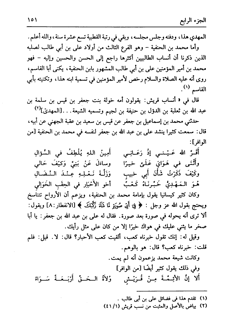 الْمهْدي هَذَا وَدَفنه وَجلسَ مَجْلِسه وَبَقِي فِي رُتْبَة القطبية تسع عشرَة سنة وَالله أعلم وَأما مُحَمَّد بن الْحَنَفِيَّة وَهُوَ الْفَرْع الثَّالِث من أَوْلَاد عَليّ بن أبي طَالب لصلبه الَّذين ذكرنَا أَنْسَاب الطالبين أَكْثَرهَا رَاجع إِلَى الْحسن وَالْحُسَيْن وَإِلَيْهِ فَهُوَ مُحَمَّد بن أَمِير الْمُؤمنِينَ عَليّ بن أبي طَالب الْمَشْهُور بِابْن الْحَنَفِيَّة يكنى أَبَا الْقَاسِم روى أَنه عَلَيْهِ الصَّلَاة وَالسَّلَام رخص لأمير الْمُؤمنِينَ فِي تَسْمِيَة ابْنه هَذَا وتكنيته بِأبي الْقَاسِم قَالَ فِي أَنْسَاب قُرَيْش يَقُولُونَ أمه خَوْلَة بنت جَعْفَر بن قيس بن سَلمَة بن عبد الله بن ثَعْلَبَة بن الدؤل بن حنيفَة بن لجيم وتسميه الشِّيعَة الْمهْدي حَدثنِي مُحَمَّد بن إِسْمَاعِيل بن جَعْفَر عَن قيس بن سعيد بن عقبَة الْجُهَنِيّ عَن أَبِيه قَالَ سَمِعت كثيرا ينشد عَليّ بن عبد الله بن جَعْفَر لنَفسِهِ فِي مُحَمَّد بن الْحَنَفِيَّة // (من الوافر) //