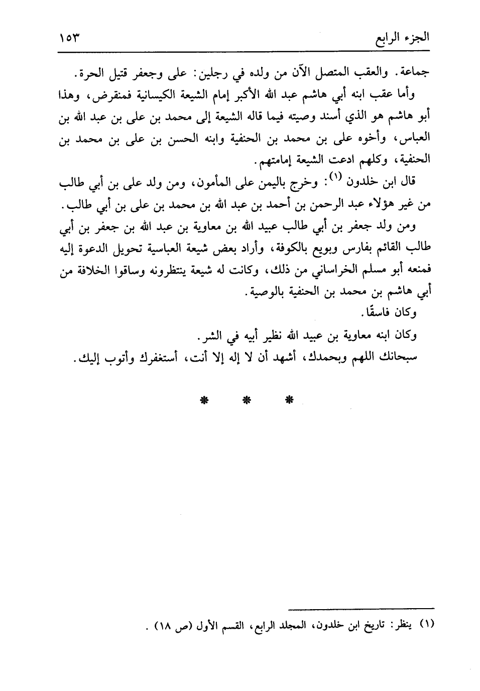 جمَاعَة والعقب الْمُتَّصِل الْآن من وَلَده فِي رجلَيْنِ على وجعفر قَتِيل الْحرَّة وَأما عقب ابْنه أبي هَاشم عبد الله الْأَكْبَر إِمَام الشِّيعَة الكيسانية فمنقرض وَهَذَا أَبُو هَاشم هُوَ الَّذِي أسْند وَصيته فِيمَا قَالَه الشِّيعَة إِلَى مُحَمَّد بن عَليّ بن عبد الله بن الْعَبَّاس وَأَخُوهُ عَليّ بن مُحَمَّد بن الْحَنَفِيَّة وَابْنه الْحسن بن عَليّ بن مُحَمَّد بن الْحَنَفِيَّة وَكلهمْ ادَّعَت الشِّيعَة إمامتهم قَالَ ابْن خلدون وَخرج بِالْيَمِينِ على الْمَأْمُون وَمن ولد عَليّ بن أبي طَالب من غير هَؤُلَاءِ عبد الرَّحْمَن بن أَحْمد بن عبد الله بن مُحَمَّد بن عَليّ بن أبي طَالب وَمن ولد جَعْفَر بن أبي طَالب عبيد الله بن مُعَاوِيَة بن عبد الله بن جَعْفَر بن أبي طَالب الْقَائِم بِفَارِس وبويع بِالْكُوفَةِ وَأَرَادَ بعض شيعَة العباسية تَحْويل الدعْوَة إِلَيْهِ فَمَنعه أَبُو مُسلم الْخُرَاسَانِي من ذَلِك وَكَانَت لَهُ شيعَة ينتظرونه وَسَاقُوا الْخلَافَة من أبي هَاشم بن مُحَمَّد بن الْحَنَفِيَّة بِالْوَصِيَّةِ وَكَانَ فَاسِقًا وَكَانَ ابْنه مُعَاوِيَة بن عبيد الله نَظِير أَبِيه فِي الشَّرّ سُبْحَانَكَ اللَّهُمَّ وَبِحَمْدِك أشهد أَن لَا إِلَه إِلَّا أَنْت أستغفرك وَأَتُوب إِلَيْك