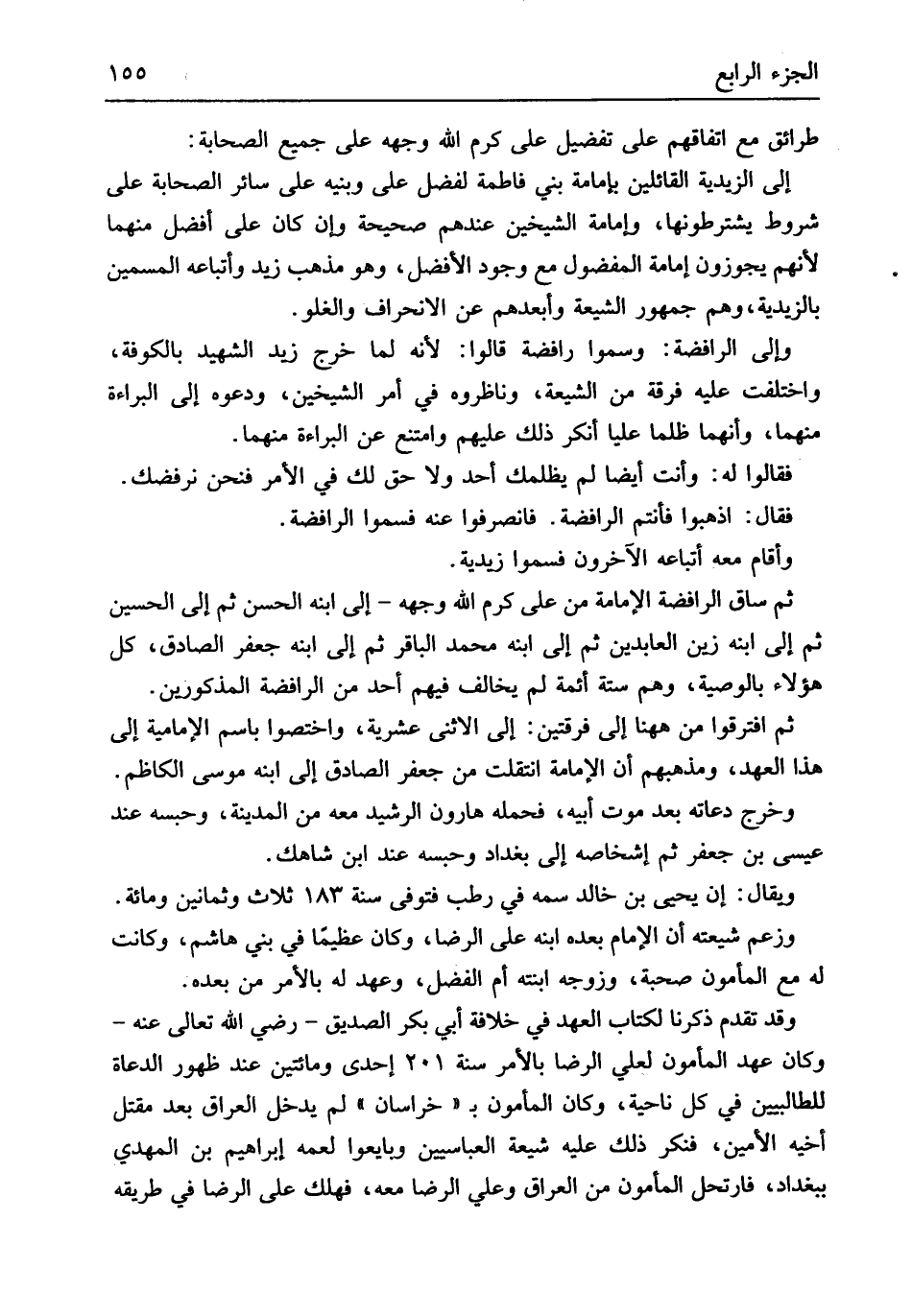 طرائق مَعَ اتِّفَاقهم على تَفْضِيل عَليّ كرم الله وَجهه على جَمِيع الصَّحَابَة إِلَى الزيدية الْقَائِلين بإمامة بني فَاطِمَة لفضل عَليّ وبنيه على سَائِر الصَّحَابَة على شُرُوط يشترطونها وإمامة الشَّيْخَيْنِ عِنْدهم صَحِيحَة وَإِن كَانَ على أفضل مِنْهُمَا لأَنهم يجوزون إِمَامَة الْمَفْضُول مَعَ وجود الْأَفْضَل وَهُوَ مَذْهَب زيد وَأَتْبَاعه المسمين بالزيدية وهم جُمْهُور الشِّيعَة وأبعدهم عَن الانحراف والغلو وَإِلَى الرافضة وَسموا رافضة قَالُوا لِأَنَّهُ لما خرج زيد الشَّهِيد بِالْكُوفَةِ وَاخْتلفت عَلَيْهِ فرقة من الشِّيعَة وناظروه فِي أَمر الشَّيْخَيْنِ وَدعوهُ إِلَى الْبَرَاءَة مِنْهُمَا وأنهما ظلما عليا أنكر ذَلِك عَلَيْهِم وَامْتنع عَن الْبَرَاءَة مِنْهُمَا فَقَالُوا لَهُ وَأَنت أَيْضا لم يظلمك أحد وَلَا حق لَك فِي الْأَمر فَنحْن نرفضك فَقَالَ اذْهَبُوا فَأنْتم الرافضة فانصرفوا عَنهُ فسموا الرافضة وَأقَام مَعَه أَتْبَاعه الاخرون فسموا زيدية ثمَّ سَاق الرافضة الإمامهّ من عَليّ كرم الله وَجهه إِلَى ابْنه الْحسن ثمَّ إِلَى الْحُسَيْن ثمَّ إِلَى ابْنه زين العايدين ثمَّ إِلَى ابْنه مُحَمَّد الباقر ثمَّ إِلَى ابْنه جَعْفَر الصَّادِق كل هَؤُلَاءِ بِالْوَصِيَّةِ وهم سِتَّة أَئِمَّة لم يُخَالف فيهم أحد من الرافضة الْمَذْكُورين ثمَّ افْتَرَقُوا من هَهُنَا إِلَى فرْقَتَيْن إِلَى الاثْنَي عشرِيَّة واختصوا باسم الإمامية إِلَى هَذَا الْعَهْد ومذهبهم أَن الْإِمَامَة انْتَقَلت من جَعْفَر الصَّادِق إِلَى ابْنه مُوسَى الكاظم وَخرج دعاته بعد موت أَبِيه فَحَمله هَارُون الرشيد مَعَه من الْمَدِينَة وحبسه عِنْد عِيسَى بن جَعْفَر ثمَّ إشخاصه إِلَى بَغْدَاد وحبسه عِنْد ابْن شاهك وَيُقَال إِن يحيى بن خَالِد سمه فِي رطب فَتوفي سنة 183 ثَلَاث وَثَمَانِينَ وَمِائَة وَزعم شيعته أَن الإِمَام بعده ابْنه عَليّ الرِّضَا وَكَانَ عَظِيما فِي بني هَاشم وَكَانَت لَهُ مَعَ الْمَأْمُون صُحْبَة وزوجه ابْنَته أم الْفضل وعهد لَهُ بِالْأَمر من بعده وَقد تقدم ذكرنَا لكتاب الْعَهْد فِي خلَافَة أبي بكر الصّديق رَضِي الله تَعَالَى عَنهُ وَكَانَ عهد الْمَأْمُون لعَلي الرِّضَا بِالْأَمر سنة 201 إِحْدَى وَمِائَتَيْنِ عِنْد ظُهُور الدعاة للطالبيين فِي كل نَاحيَة وَكَانَ الْمَأْمُون ب خُرَاسَان لم يدْخل الْعرَاق بعد مقتل أَخِيه الْأمين فنكر ذَلِك عَلَيْهِ شيعَة العباسيين وَبَايَعُوا لِعَمِّهِ إِبْرَاهِيم بن الْمهْدي بِبَغْدَاد فارتحل الْمَأْمُون من الْعرَاق وَعلي الرِّضَا مَعَه فَهَلَك عَليّ الرِّضَا فِي طَرِيقه
