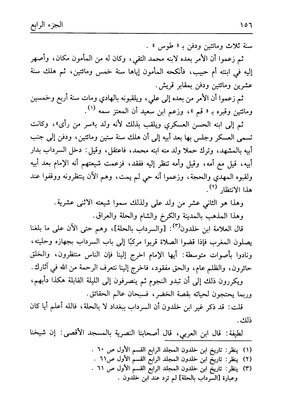 سنة ثَلَاث وَمِائَتَيْنِ وَدفن ب طوس ثمَّ زَعَمُوا أَن الْأَمر بعده لِابْنِهِ مُحَمَّد التقي وَكَانَ لَهُ من الْمَأْمُون مَكَان وأصهر إِلَيْهِ فِي ابْنَته أم حبيب فأنكحه الْمَأْمُون إِيَّاهَا سنة خمس وَمِائَتَيْنِ ثمَّ هلك سنة عشْرين وَمِائَتَيْنِ وَدفن بمقابر قُرَيْش ثمَّ زَعَمُوا أَن الْأَمر من بعده إِلَى عَليّ ويلقبونه بالهادي وَمَات سنة أَربع وَخمسين وَمِائَتَيْنِ وقبره ب قُم وَزعم ابْن سعيد أَن المعتز سمه ثمَّ إِلَى ابْنه الْحسن العسكري ويلقب بذلك لِأَنَّهُ ولد ب سر من رأى وَكَانَت تسمى الْعَسْكَر وَجلسَ بهَا بعد أَبِيه إِلَى أَن هلك سنة سِتِّينَ وَمِائَتَيْنِ وَدفن إِلَى جنب أَبِيه بالمشهد وَترك حملا ولد مِنْهُ ابْنه مُحَمَّد فاعتقل وَقيل دخل السرداب بدار أَبِيه قيل مَعَ أمه وَقيل وَأمه تنظر إِلَيْهِ ففقد فَزَعَمت شيعتهم أَنه الإِمَام بعد أَبِيه ولقبوه الْمهْدي وَالْحجّة وَزَعَمُوا أَنه حَيّ لم يمت وهم الْآن ينتظرونه ووقفوا عِنْد هَذَا الِانْتِظَار وَهَذَا هُوَ الثَّانِي عشر من ولد عَليّ وَلذَلِك سموا شيعته الاثْنَي عشرِيَّة وَهَذَا الْمَذْهَب بِالْمَدِينَةِ والكرخ وَالشَّام والحلة وَالْعراق قَالَ الْعَلامَة ابْن خلدون والسرداب بالحلة وهم حَتَّى الْآن على مَا بلغنَا يصلونَ الْمغرب فَإِذا قضوا الصَّلَاة قربوا مركبا إِلَى بَاب السرداب بجهازه وحليته وَنَادَوْا بِأَصْوَات متوسطة أَيهَا الإِمَام اخْرُج إِلَيْنَا فَإِن النَّاس منتظرون والخلق حائرون وَالظُّلم عَام وَالْحق مَفْقُود فَاخْرُج إِلَيْنَا نتعرف الرَّحْمَة من الله فِي آثارك ويكررون ذَلِك إِلَى أَن تبدو النُّجُوم ثمَّ يَنْصَرِفُونَ إِلَى اللَّيْلَة الْقَابِلَة هَكَذَا دأبهم وَرُبمَا يحتجون لِحَيَاتِهِ بِقصَّة الْخضر فسبحان عَالم الْحَقَائِق قلت ذكر غير ابْن خلدون أَن السرداب بِبَغْدَاد لَا بالحلة فَالله أعلم أيا كَانَ ذَلِك لَطِيفَة قَالَ ابْن الْعَرَبِيّ قَالَ أَصْحَابنَا النصرية بِالْمَسْجِدِ الْأَقْصَى إِن شَيخنَا