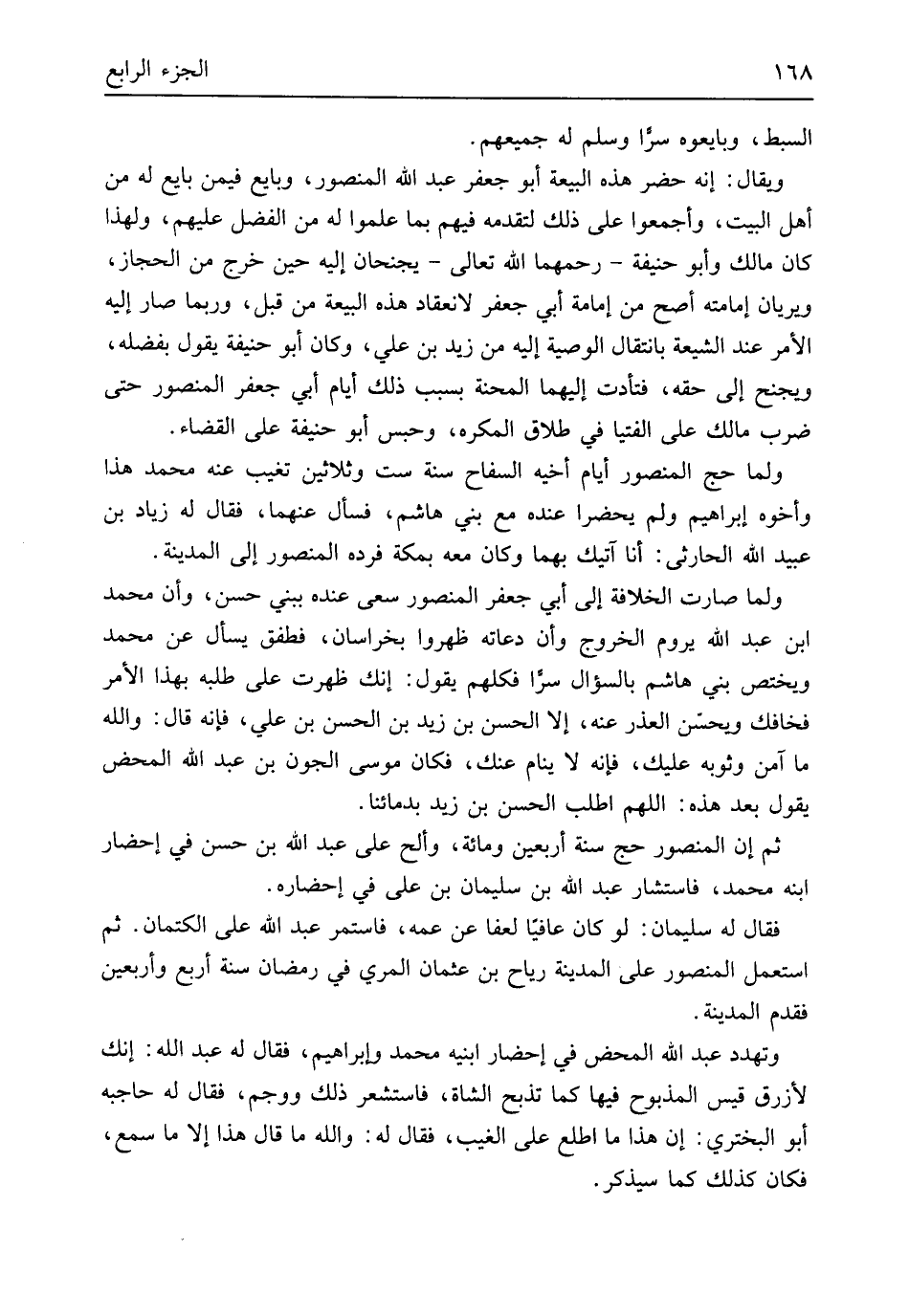 السبط وَبَايَعُوهُ سرا وَسلم لَهُ جَمِيعهم وَيُقَال إِنَّه حضر هَذِه الْبيعَة أَبُو جَعْفَر عبد الله الْمَنْصُور وَبَايع فِيمَن بَايع لَهُ من أهل الْبَيْت وَأَجْمعُوا على ذَلِك لتقدمه فيهم بِمَا علمُوا لَهُ من الْفضل عَلَيْهِم وَلِهَذَا كَانَ مَالك وَأَبُو حنيفَة رحمهمَا الله تَعَالَى يجنحان إِلَيْهِ حِين خرج من الْحجاز ويريان إِمَامَته أصح من إِمَامَة أبي جَعْفَر لانعقاد هَذِه الْبيعَة من قبل وَرُبمَا صَار إِلَيْهِ الْأَمر عِنْد الشِّيعَة بانتقال الْوَصِيَّة إِلَيْهِ من زيد بن عَليّ وَكَانَ أَبُو حنيفَة يَقُول بفضله ويجنح إِلَى حَقه فتأدت إِلَيْهِمَا المحنة بِسَبَب ذَلِك أَيَّام أبي جَعْفَر الْمَنْصُور حَتَّى ضرب مَالك على الْفتيا فِي طَلَاق الْمُكْره وَحبس أَبُو حنيفَة على الْقَضَاء وَلما حج الْمَنْصُور أَيَّام أَخِيه السفاح سنة سِتّ وَثَلَاثِينَ تغيب عَنهُ مُحَمَّد هَذَا وَأَخُوهُ إِبْرَاهِيم وَلم يحضرا عِنْده مَعَ بني هِشَام فَسَأَلَ عَنْهُمَا فَقَالَ لَهُ زِيَاد بن عبيد الله الْحَارِثِيّ أَنا آتِيك بهما وَكَانَ مَعَه بِمَكَّة فَرده الْمَنْصُور إِلَى الْمَدِينَة وَلما صَارَت الْخلَافَة إِلَى أبي جَعْفَر الْمَنْصُور سعى عِنْده ببني حسن وَأَن مُحَمَّد ابْن عبد الله يروم الْخُرُوج وَأَن دعاته ظَهَرُوا بخراسان فَطَفِقَ يسْأَل عَن مُحَمَّد وَيخْتَص بني هَاشم بالسؤال سرا فكلهم يَقُول إِنَّك ظَهرت على طلبه بِهَذَا الْأَمر فخافك وَيحسن الْعذر عَنهُ إِلَّا الْحسن بن زيد بن الْحسن بن عَليّ فَإِنَّهُ قَالَ وَالله مَا آمن وثوبه عَلَيْك فَإِنَّهُ لَا ينَام عَنْك فَكَانَ مُوسَى الجون بن عبد الله الْمَحْض يَقُول بعد هَذِه اللَّهُمَّ اطلب الْحسن بن زيد بدمائنا ثمَّ إِن الْمَنْصُور حج سنة أَرْبَعِينَ وَمِائَة وألح على عبد الله بن حسن فِي إِحْضَار ابْنه مُحَمَّد فَاسْتَشَارَ عبد الله بن سُلَيْمَان بن عَليّ فِي إِحْضَاره فَقَالَ لَهُ سُلَيْمَان لَو كَانَ عافياً لعفا عَن عَمه فاستمر عبد الله على الكتمان ثمَّ اسْتعْمل الْمَنْصُور على الْمَدِينَة ريَاح بن عُثْمَان المري فِي رَمَضَان سنة أَربع وَأَرْبَعين فَقدم الْمَدِينَة وتهدد عبد الله الْمَحْض فِي إِحْضَار ابنيه مُحَمَّد وَإِبْرَاهِيم فَقَالَ لَهُ عبد الله إِنَّك لأزرق قيس الْمَذْبُوح فِيهَا كَمَا تذبح الشَّاة فاستشعر ذَلِك ووجم فَقَالَ لَهُ حَاجِبه أَبُو البخْترِي إِن هَذَا مَا اطلع على الْغَيْب فَقَالَ لَهُ وَالله مَا قَالَ هَذَا إِلَّا مَا سمع فَكَانَ كَذَلِك كَمَا سَيذكرُ