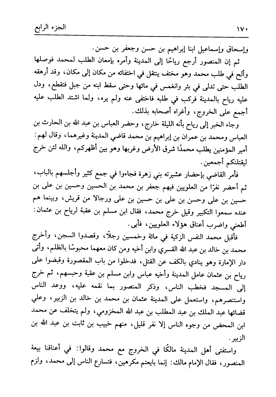 وَإِسْحَاق وَإِسْمَاعِيل ابْنا إِبْرَاهِيم بن حسن وجعفر بن حسن ثمَّ إِن الْمَنْصُور أرجع رياحاً إِلَى الْمَدِينَة وَأمره بإمعان الطّلب لمُحَمد فوصلها وألح فِي طلب مُحَمَّد وَهُوَ مختف ينْتَقل فِي اختفائه من مَكَان إِلَى مَكَان وَقد أرهقه الطّلب حَتَّى تدلى فِي بِئْر وانغمس فِي مَائِهَا وَحَتَّى سقط ابْنه من جبل فتقطع وَدلّ عَلَيْهِ ريَاح بِالْمَدِينَةِ فَركب فِي طلبه فاختفى عَنهُ وَلم يره وَلما اشْتَدَّ الطّلب عَلَيْهِ أجمع على الْخُرُوج وأغراه أَصْحَابه بذلك وَجَاء الْخَبَر إِلَى ريَاح بِأَنَّهُ اللَّيْلَة خَارج وَحضر الْعَبَّاس بن عبد الله بن الْحَارِث بن الْعَبَّاس وَمُحَمّد بن عمرَان بن إِبْرَاهِيم بن مُحَمَّد قَاضِي الْمَدِينَة وَغَيرهمَا وَقَالَ لَهُم أَمِير الْمُؤمنِينَ يطْلب مُحَمَّدًا شَرق الأَرْض وغربها وَهُوَ بَين أظْهركُم وَالله لَئِن خرج ليقتلنكم أَجْمَعِينَ فَأمر القَاضِي بإحضار عشيرته بني زهرَة فَجَاءُوا فِي جمع كثير وأجلسهم بِالْبَابِ ثمَّ أحضر نَفرا من العلويين فيهم جَعْفَر بن مُحَمَّد بن الْحُسَيْن وحسين بن عَليّ بن حُسَيْن بن عَليّ وَحسن بن عَليّ بن حُسَيْن بن عَليّ ورجالاً من قُرَيْش وبينما هم عِنْده سمعُوا التَّكْبِير وَقيل خرج مُحَمَّد فَقَالَ ابْن مُسلم بن عقبَة لرياح بن عُثْمَان أطعني وَاضْرِبْ أَعْنَاق هَؤُلَاءِ العلويين فَأبى فَأقبل مُحَمَّد النَّفس الزكية فِي مائَة وَخمسين رجلا وقصدوا السجْن وَأخرج مُحَمَّد بن خَالِد بن عبد الله الْقَسرِي وَابْن أَخِيه وَمن كَانَ مَعَهُمَا مَحْبُوسًا بالظلم وأتى دَار الْإِمَارَة وَهُوَ يُنَادي بالكف عَن الْقَتْل فَدَخَلُوا من بَاب الْمَقْصُورَة وقبضوا على ريَاح بن عُثْمَان عَامل الْمَدِينَة وأخيه عَبَّاس وَابْن مُسلم بن عقبَة وحبسهم ثمَّ خرج إِلَى الْمَسْجِد فَخَطب النَّاس وَذكر الْمَنْصُور بِمَا نقمه عَلَيْهِ ووعد النَّاس واستنصرهم وَاسْتعْمل على الْمَدِينَة عُثْمَان بن مُحَمَّد بن خَالِد بن الزبير وَعلي قَضَائهَا عبد الْملك بن عبد الْمطلب بن عبد الله المَخْزُومِي وَلم يتَخَلَّف عَن مُحَمَّد ابْن الْمَحْض من وُجُوه النَّاس إِلَّا نفر قَلِيل مِنْهُم خبيب بن ثَابت بن عبد الله بن الزبير واستفتى أهل الْمَدِينَة مَالِكًا فِي الْخُرُوج مَعَ مُحَمَّد وَقَالُوا فِي أعناقنا بيعَة الْمَنْصُور فَقَالَ الإِمَام مَالك إِنَّمَا بايعتم مكرهين فَتسَارع النَّاس إِلَى مُحَمَّد وَلزِمَ