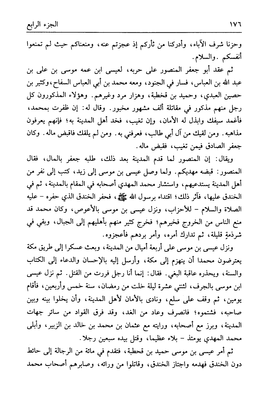 وحزناً شرف الْآبَاء وأدركنا من ثأركم إِذْ عجزتم عَنهُ ومنعناكم حَيْثُ لم تمنعوا أَنفسكُم وَالسَّلَام ثمَّ عقد أَبُو جَعْفَر الْمَنْصُور على حربه لعيسى ابْن عَمه مُوسَى بن عَليّ بن عبد الله بن الْعَبَّاس فَسَار فِي الْجنُود وَمَعَهُ مُحَمَّد بن أبي الْعَبَّاس السفاح وَكثير بن حُصَيْن الْعَبْدي وَحميد بن قخطبة وهزار مرد وَغَيرهم وَهَؤُلَاء المذكورون كل رجل مِنْهُم مَذْكُور فِي مقاتلة ألف مَشْهُور مخبور وَقَالَ لَهُ إِن ظَفرت بِمُحَمد فأغمد سَيْفك وابذل لَهُ الْأمان وَإِن تغيب فَخدَّ أهل الْمَدِينَة بِهِ فَإِنَّهُم يعْرفُونَ مذاهبه وَمن لقيك من آل أبي طَالب فعرفني بِهِ وَمن لم يلقك فاقبض مَاله وَكَانَ جَعْفَر الصَّادِق فِيمَن تغيب فَقبض مَاله وَيُقَال إِن الْمَنْصُور لما قدم الْمَدِينَة بعد ذَلِك طلبه جَعْفَر بِالْمَالِ فَقَالَ الْمَنْصُور قَبضه مهديكم وَلما وصل عِيسَى بن مُوسَى إِلَى زيد كتب إِلَى نفر من أهل الْمَدِينَة يستدعيهم وَاسْتَشَارَ مُحَمَّد الْمهْدي أَصْحَابه فِي الْمقَام بِالْمَدِينَةِ ثمَّ فِي الخَنْدَق عَلَيْهَا فآثر ذَلِك اقْتِدَاء برَسُول الله