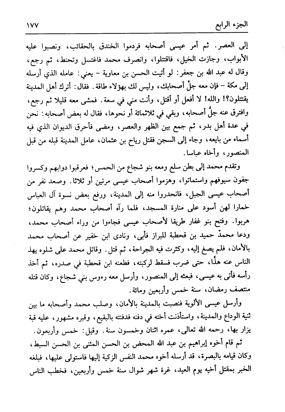 إِلَى الْعَصْر ثمَّ أَمر عِيسَى أَصْحَابه فردموا الخَنْدَق بالحقائب ونصبوا عَلَيْهِ الْأَبْوَاب وَجَازَت الْخَيل فَاقْتَتلُوا وَانْصَرف مُحَمَّد فاغتسل وتحنط ثمَّ رَجَعَ وَقَالَ لَهُ عبد الله بن جَعْفَر لَو أتيت الْحسن بن مُعَاوِيَة يَعْنِي عَامله الَّذِي أرْسلهُ إِلَى مَكَّة فَإِن مَعَه جلّ أَصْحَابك وَلَيْسَ لَك بهؤلاء طَاقَة فَقَالَ أترك أهل الْمَدِينَة يقتتلون وَالله لَا أفعل أَو أقتل وَأَنت مني فِي سَعَة فَمشى مَعَه قَلِيلا ثمَّ رَجَعَ وافترق عَنهُ جلّ أصجابه وَبَقِي فِي ثَلَاثمِائَة أَو نَحْوهَا فَقَالَ لَهُ بعض أَصْحَابه نَحن فِي عدَّة أهل بدر ثمَّ جمع بَين الظّهْر وَالْعصر وَمضى فَأحرق الدِّيوَان الَّذِي فِيهِ أَسمَاء من بَايعه وَجَاء إِلَى السجْن فَقتل ريَاح بن عُثْمَان عَامل الْمَدِينَة قبله من قبل الْمَنْصُور وأخاه عباساً وَتقدم مُحَمَّد إِلَى بطن سلع وَمَعَهُ بَنو شُجَاع من الحمس فعرقبوا دوابهم وكسروا جفون سيوفهم واستماتوا وهزموا أَصْحَاب عِيسَى مرَّتَيْنِ أَو ثَلَاثًا وَصعد نفر من أَصْحَاب عِيسَى الْجَبَل فانحدروا مِنْهُ إِلَى الْمَدِينَة وَرفع بعض نسْوَة آل الْعَبَّاس خماراً لَهُنَّ أسود على مَنَارَة الْمَسْجِد فَلَمَّا رَاه أَصْحَاب مُحَمَّد وهم يُقَاتلُون هربوا وَفتح بَنو غفار طَرِيقا لأَصْحَاب عِيسَى فَجَاءُوا من وَرَاء أَصْحَاب مُحَمَّد ودعا مُحَمَّد حميد بن قَحْطَبَةَ للبراز فَأبى ونادى ابْن خفير عَن أَصْحَاب مُحَمَّد بالأمان فَلم يصغ إِلَيْهِ وَكَثُرت فِيهِ الْجراحَة ثمَّ قتل وَقَاتل مُحَمَّد عَليّ شلوه يهذ النَّاس عَنهُ هَذَا حَتَّى ضرب فَسقط لركبته فطعنه ابْن قَحْطَبَةَ فِي صَدره ثمَّ أَخذ رَأسه فَأتى بِهِ عِيسَى فَبَعثه إِلَى الْمَنْصُور وَأرْسل مَعَه رُءُوس بني شُجَاع وَكَانَ قَتله منتصف رَمَضَان سنة خمس وَأَرْبَعين وَمِائَة وَأرْسل عِيسَى الألوية فَنصبت بِالْمَدِينَةِ بالأمان وصلب مُحَمَّد وَأَصْحَابه مَا بَين ثنية الْوَدَاع وَالْمَدينَة واستأذنت أُخْته فِي دَفنه فدفتته بِالبَقِيعِ وقبره مَشْهُور عَلَيْهِ قبَّة يزار بهَا رَحمَه الله تَعَالَى عمره اثْنَان وخسمون سنة وَقيل خمس وأريعون ثمَّ قَامَ أَخُوهُ إِبْرَاهِيم بن عبد الله الْمَحْض بن الْحسن الْمثنى بن الْحسن السبط وَكَانَ قِيَامه بِالْبَصْرَةِ قد أرْسلهُ أَخُوهُ مُحَمَّد النَّفس الزكية إِلَيْهَا فاستولى عَلَيْهَا فَبَلغهُ الْخَبَر بمقتل أَخِيه يَوْم الْعِيد غرَّة شهر شَوَّال سنة خمس وَأَرْبَعين فَخَطب النَّاس