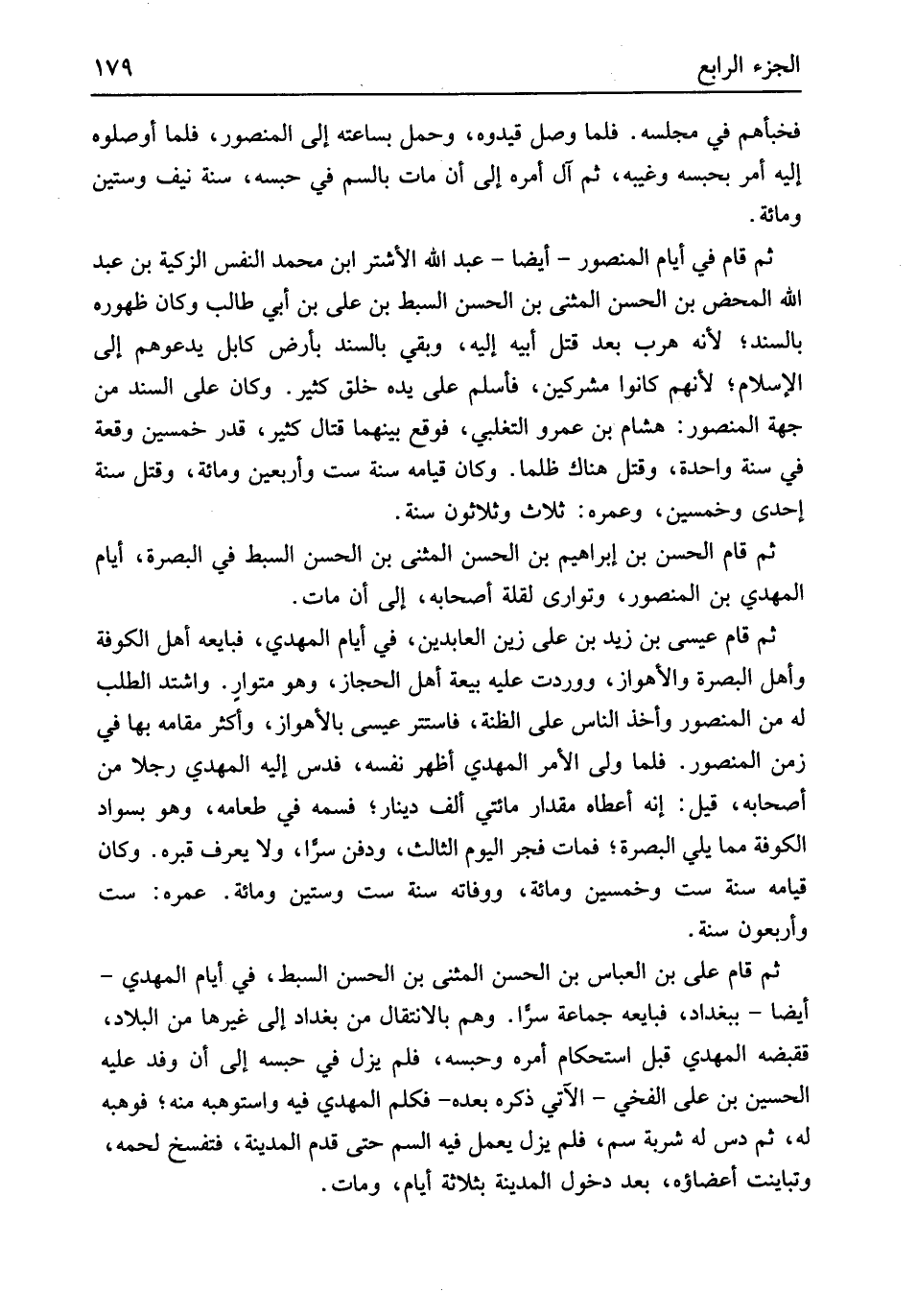 فخبأهم فِي مَجْلِسه فَلَمَّا وصل قيدوه وَحمل بساعته إِلَى الْمَنْصُور فَلَمَّا أوصلوه إِلَيْهِ أَمر بحبسه وغيبه ثمَّ آل أمره إِلَى أَن مَاتَ بالسم فِي حَبسه سنة نَيف وَسِتِّينَ وَمِائَة ثمَّ قَامَ فِي أَيَّام الْمَنْصُور أَيْضا عبد الله الأشتر ابْن مُحَمَّد النَّفس الزكية بن عبد الله الْمَحْض بن الْحسن الْمثنى بن الْحسن السبط بن عَليّ بن أبي طَالب وَكَانَ ظُهُوره بالسند لِأَنَّهُ هرب بعد قتل أَبِيه إِلَيْهِ وَبَقِي بالسند بِأَرْض كابل يَدعُوهُم إِلَى الْإِسْلَام لأَنهم كَانُوا مشتركين فَأسلم على يَده خلق كثير وَكَانَ على السَّنَد من جِهَة الْمَنْصُور هِشَام بن عَمْرو التغلبي فَوَقع بَينهمَا قتال كثير قدر خمسين وقْعَة فِي سنة وَاحِدَة وَقتل هُنَاكَ ظلما وَكَانَ قِيَامه سنة سِتّ وَأَرْبَعين وَمِائَة وَقتل سنة إِحْدَى وَخمسين وعمره ثَلَاث وَثَلَاثُونَ سنة ثمَّ قَامَ الْحسن بن إِبْرَاهِيم بن الْحسن الْمثنى بن الْحسن السبط فِي الْبَصْرَة أَيَّام الْمهْدي بن الْمَنْصُور وتوارى لقلَّة أَصْحَابه إِلَى أَن مَاتَ ثمَّ قَامَ عِيسَى بن زيد بن على زين العابدين فِي أَيَّام الْمهْدي فَبَايعهُ أهل الْكُوفَة وَأهل الْبَصْرَة والأهواز ووردت عَلَيْهِ بيعَة أهل الْحجاز وَهُوَ متوارٍ وَاشْتَدَّ الطّلب لَهُ من الْمَنْصُور وَأخذ النَّاس على الظنة فاستتر عِيسَى بالأهواز وَأكْثر مقَامه بهَا فِي زمن الْمَنْصُور فَلَمَّا ولي الْأَمر الْمهْدي أظهر نَفسه فَدس إِلَيْهِ الْمهْدي رجلا من أَصْحَابه قيل إِنَّه أعطَاهُ مِقْدَار مِائَتي ألف دِينَار فسمه فِي طَعَامه وَهُوَ بسواد الْكُوفَة مِمَّا يَلِي الْبَصْرَة فَمَاتَ فجر الْيَوْم الثَّالِث وَدفن سرا وَلَا يعرف قَبره وَكَانَ قِيَامه سنة سِتّ وَخمسين وَمِائَة ووفاته سنة سِتّ وَسِتِّينَ وَمِائَة عمره سِتّ وَأَرْبَعُونَ سنة ثمَّ قَامَ عَليّ بن الْعَبَّاس بن الْحسن الْمثنى بن الْحسن السبط فِي أَيَّام الْمهْدي أَيْضا بِبَغْدَاد فيايعه جمَاعَة سرا وهم بالانتقال من بَغْدَاد إِلَى غَيرهَا من الْبِلَاد ققبضه الْمهْدي قبل استحكام أمره وحبسه فَلم يزل فِي حَبسه إِلَى أَن وَفد عَلَيْهِ الْحُسَيْن بن عَليّ الفخي الْآتِي ذكره بعده فَكلم الْمهْدي فِيهِ واستوهبه مِنْهُ فوهبه لَهُ ثمَّ دس لَهُ شربة سم فَلم يزل يعْمل فِيهِ السم حَتَّى قدم الْمَدِينَة فتفسخ لَحْمه وتباينت أعضاؤه بعد دُخُول الْمَدِينَة بِثَلَاثَة أَيَّام وَمَات