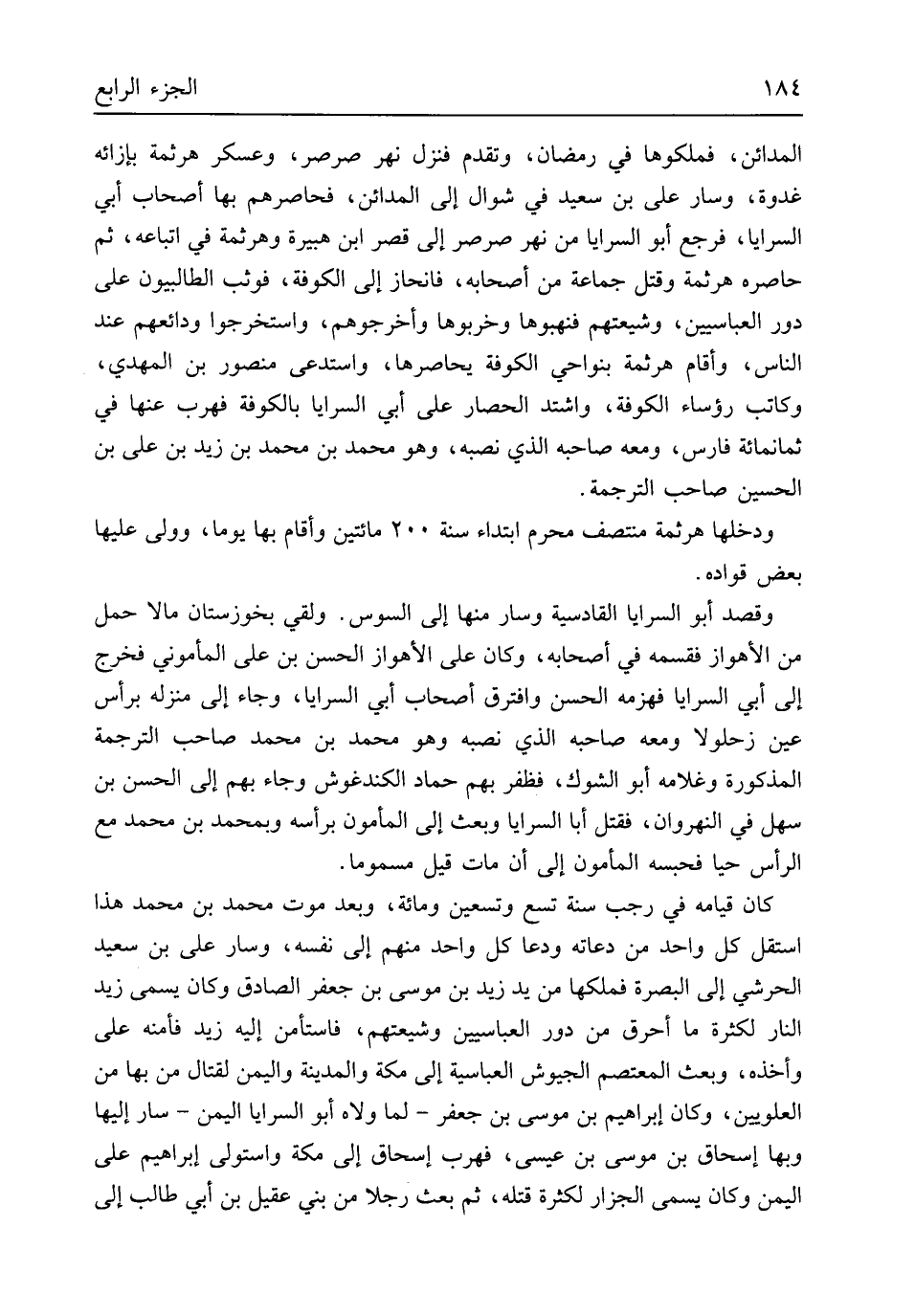 الْمَدَائِن فملكوها فِي رَمَضَان وَتقدم فَنزل نهر صَرْصَر وعسكر هرثمة بإزائه غدْوَة وَسَار عَليّ بن سعيد فِي شَوَّال إِلَى الْمَدَائِن فَحَاصَرَهُمْ بهَا أَصْحَاب أبي السَّرَايَا فَرجع أَبُو السَّرَايَا من نهر صَرْصَر إِلَى قصر ابْن هُبَيْرَة وهرثمة فِي اتِّبَاعه ثمَّ حاصره هرثمة وَقتل جمَاعَة من أَصْحَابه فانحاز إِلَى الْكُوفَة فَوَثَبَ الطالبيون على دور العباسيين وشيعتهم فنهبوها وخربوها وأخرجوهم وَاسْتَخْرَجُوا ودائعهم عِنْد النَّاس وَأقَام هرثمة بنواحي الْكُوفَة يحاصرها واستدعي مَنْصُور بن الْمهْدي وَكَاتب رُؤَسَاء الْكُوفَة وَاشْتَدَّ الْحصار على أبي السَّرَايَا بِالْكُوفَةِ فهرب عَنْهَا فِي ثَمَانمِائَة فَارس وَمَعَهُ صَاحبه الَّذِي نَصبه وَهُوَ مُحَمَّد بن مُحَمَّد بن زيد بن عَليّ بن الْحُسَيْن صَاحب التَّرْجَمَة ودخلها هرثمة منتصف محرم ابْتِدَاء سنة 200 مِائَتَيْنِ وَأقَام بهَا يَوْمًا وَولى عَلَيْهَا بعض قواده وَقصد أَبُو السَّرَايَا الْقَادِسِيَّة وَسَار مِنْهَا إِلَى السوس وَلَقي بخوزستان مَالا حمل من الأهواز فَقَسمهُ فِي أَصْحَابه وَكَانَ على الأهواز الْحسن بن عَليّ المأموني فَخرج إِلَى أبي السَّرَايَا فَهَزَمَهُ الْحسن وافترق أَصْحَاب أبي السَّرَايَا وَجَاء إِلَى منزله بِرَأْس عين زحلولا وَمَعَهُ صَاحبه الَّذِي نَصبه وَهُوَ مُحَمَّد بن مُحَمَّد صَاحب التَّرْجَمَة الْمَذْكُورَة وَغُلَامه أَبُو الشوك فظفر بهم حَمَّاد الكند غوش وَجَاء بهم إِلَى الْحسن بن سهل فِي النهروان فَقتل أَبَا السَّرَايَا وَبعث إِلَى الْمَأْمُون بِرَأْسِهِ وَبِمُحَمَّدٍ بن مُحَمَّد مَعَ الرَّأْس حَيا فحبسه الْمَأْمُون إِلَى أَن مَاتَ قيل مسموماً كَانَ قِيَامه فِي رَجَب سنة تسع وَتِسْعين وَمِائَة وَبعد موت مُحَمَّد بن مُحَمَّد هَذَا اسْتَقل كل وَاحِد من دعاته ودعا كل وَاحِد مِنْهُم إِلَى نَفسه وَسَار عَليّ بن سعيد الْحَرَشِي إِلَى الْبَصْرَة فملكها من يَد زيد بن مُوسَى بن جَعْفَر الصَّادِق وَكَانَ يُسمى زيد النَّار لِكَثْرَة مَا أحرق من دور العباسيين وشيعتهم فاستأمن إِلَيْهِ زيد فَأَمنهُ عَليّ وَأَخذه وَبعث المعتصم الجيوش العباسية إِلَى مَكَّة وَالْمَدينَة واليمن لقِتَال من بهَا من العلويين وَكَانَ إِبْرَاهِيم بن مُوسَى بن جَعْفَر لما ولاه أَبُو السَّرَايَا الْيمن سَار إِلَيْهَا وَبهَا إِسْحَاق بن مُوسَى بن عِيسَى فهرب إِسْحَاق إِلَى مَكَّة وَاسْتولى إِبْرَاهِيم على الْيمن وَكَانَ يُسمى الجزار لِكَثْرَة قَتله ثمَّ بعث رجلا من بني عقيل بن أبي طَالب إِلَى