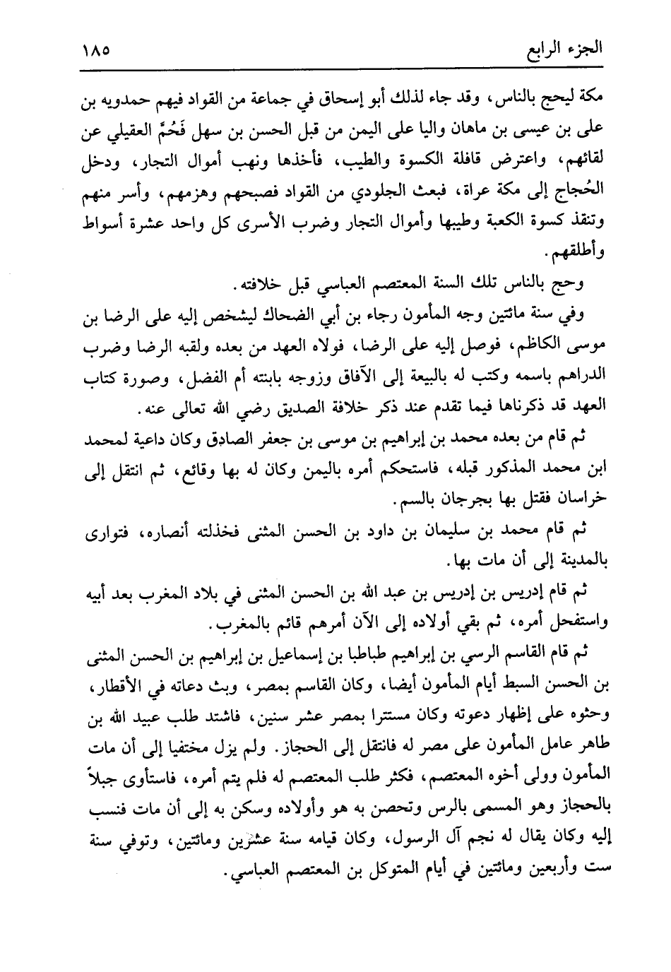 مَكَّة ليحج بِالنَّاسِ وَقد جَاءَ لذَلِك أَبُو إِسْحَاق فِي جمَاعَة من القواد فيهم حَمْدَوَيْه بن عَليّ بن عِيسَى بن ماهان والياً على الْيمن من قبل الْحسن بن سهل فَحُمَّ الْعقيلِيّ عَن لقائهم وَاعْترض قافلة الْكسْوَة وَالطّيب فَأَخذهَا وَنهب أَمْوَال التُّجَّار وَدخل الحُجاج إِلَى مَكَّة عُرَاة فَبعث الجلودي من القواد فصبحهم وَهَزَمَهُمْ وَأسر مِنْهُم وتنقذ كسْوَة الْكَعْبَة وطيبها وأموال التُّجَّار وَضرب الأسرى كل وَاحِد عشرَة أسواط وأطلقهم وَحج بِالنَّاسِ تِلْكَ السّنة المعتصم العباسي قبل خِلَافَته وَفِي سنة مِائَتَيْنِ وَجه الْمَأْمُون رَجَاء بن أبي الضَّحَّاك ليشخص إِلَيْهِ عَليّ الرِّضَا بن مُوسَى الكاظم فوصل إِلَيْهِ عَليّ الرِّضَا فولاه الْعَهْد من بعده ولقبه الرِّضَا وَضرب الدَّرَاهِم باسمه وَكتب لَهُ بالبيعة إِلَى الْآفَاق وزوجه بابنته أم الْفضل وَصُورَة كتاب الْعَهْد قد ذَكرنَاهَا فِيمَا تقدم عِنْد ذكر خلَافَة الصّديق رَضِي الله تَعَالَى عَنهُ ثمَّ قَامَ من بعده مُحَمَّد بن إِبْرَاهِيم بن مُوسَى بن جَعْفَر الصَّادِق وَكَانَ دَاعِيَة لمُحَمد ابْن مُحَمَّد الْمَذْكُور قبله فاستحكم أمره بِالْيمن وَكَانَ لَهُ بهَا وقائع ثمَّ انْتقل إِلَى خُرَاسَان فَقتل بهَا بجرجان بالسم ثمَّ قَامَ مُحَمَّد بن سُلَيْمَان بن دَاوُد بن الْحسن الْمثنى فخذلته أنصاره فتوارى بِالْمَدِينَةِ إِلَى أَن مَاتَ بهَا ثمَّ قَامَ إِدْرِيس بن إِدْرِيس بن عبد الله بن الْحسن الْمثنى فِي بِلَاد الْمغرب بعد أَبِيه واستفحل أمره ثمَّ بَقِي أَوْلَاده إِلَى الْآن أَمرهم قَائِم بالمغرب ثمَّ قَامَ الْقَاسِم الرسي بن إِبْرَاهِيم طَبَاطَبَا بن إِسْمَاعِيل بن إِبْرَاهِيم بن الْحسن الْمثنى بن الْحسن السبط أَيَّام الْمَأْمُون أَيْضا وَكَانَ الْقَاسِم بِمصْر وَبث دعاته فِي الأقطار وحثوه على إِظْهَار دَعوته وَكَانَ مستتراً بِمصْر عشر سِنِين فَاشْتَدَّ طلب عبيد الله بن طَاهِر عَامل الْمَأْمُون على مصر لَهُ فانتقل إِلَى الْحجاز وَلم يزل مختفياً إِلَى أَن مَاتَ الْمَأْمُون وَولى أَخُوهُ المعتصم فَكثر طلب المعتصم لَهُ فَلم يتم أمره فاستأوى جبلا بالحجاز وَهُوَ الْمُسَمّى بالرس وتحصن بِهِ هُوَ وَأَوْلَاده وَسكن بِهِ إِلَى أَن مَاتَ فنسب إِلَيْهِ وَكَانَ يُقَال لَهُ نجم آل الرَّسُول وَكَانَ قِيَامه سنة عشْرين وَمِائَتَيْنِ وَتُوفِّي سنة سِتّ وَأَرْبَعين وَمِائَتَيْنِ فِي أَيَّام المتَوَكل بن المعتصم العباسي