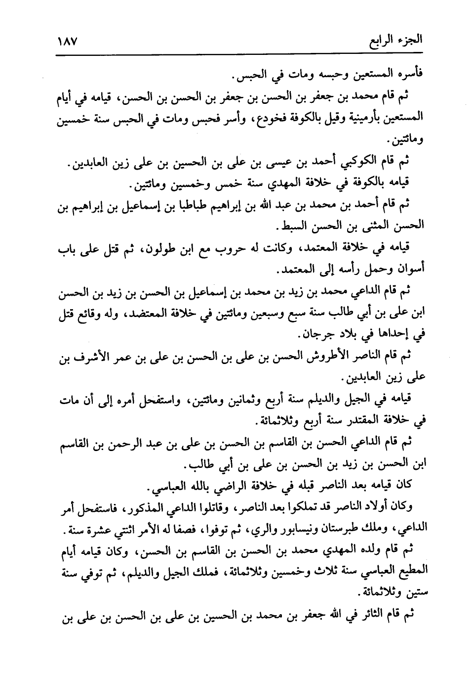 فَأسرهُ المستعين وحبسه وَمَات فِي الْحَبْس ثمَّ قَامَ مُحَمَّد بن جَعْفَر بن الْحسن بن جَعْفَر بن الْحسن بن الْحسن قِيَامه فِي أَيَّام المستعين بأرمينية وَقيل بِالْكُوفَةِ فخودع وَأسر فحبس وَمَات فِي الْحَبْس سنة خمسين وَمِائَتَيْنِ ثمَّ قَامَ الكوكبي أَحْمد بن عِيسَى بن عَليّ بن الْحُسَيْن بن عَليّ زين العابدين قِيَامه بِالْكُوفَةِ فِي خلَافَة الْمهْدي سنة خمس وَخمسين وَمِائَتَيْنِ ثمَّ قَامَ أَحْمد بن مُحَمَّد بن عبد الله بن إِبْرَاهِيم طَبَاطَبَا بن إِسْمَاعِيل بن إِبْرَاهِيم بن الْحسن الْمثنى بن الْحسن السبط قِيَامه فِي خلَافَة الْمُعْتَمد وَكَانَت لَهُ حروب مَعَ ابْن طولون ثمَّ قتل على بَاب أسوان وَحمل رَأسه إِلَى الْمُعْتَمد ثمَّ قَامَ الدَّاعِي مُحَمَّد بن زيد بن مُحَمَّد بن إِسْمَاعِيل بن الْحسن بن زيد بن الْحسن ابْن عَليّ بن أبي طَالب سنة سبع وَسبعين وَمِائَتَيْنِ فِي خلَافَة المعتضد وَله وقائع قتل فِي إِحْدَاهَا فِي بِلَاد جرجان ثمَّ قَامَ النَّاصِر الأطروش الْحسن بن عَليّ بن الْحسن بن عَليّ بن عمر الْأَشْرَف بن عَليّ زين العابدين قِيَامه فِي الجيل والديلم سنة أَربع وَثَمَانِينَ وَمِائَتَيْنِ واستفحل أمره إِلَى أَن مَاتَ فِي خلَافَة المقتدر سنة أَربع وثلاثمائة ثمَّ قَامَ الدَّاعِي الْحسن بن الْقَاسِم بن الْحسن بن عَليّ بن عبد الرَّحْمَن بن الْقَاسِم ابْن الْحسن بن زيد بن الْحسن بن عَليّ بن أبي طَالب كَانَ قِيَامه بعد النَّاصِر قبله فِي خلَافَة الراضي بِاللَّه العباسي وَكَانَ أَوْلَاد النَّاصِر قد تملكوا بعد النَّاصِر وقاتلوا الدَّاعِي الْمَذْكُور فاستفحل أَمر الدَّاعِي وَملك طبرستان ونيسابور والري ثمَّ توفوا فصفا لَهُ الْأَمر اثْنَتَيْ عشرَة سنة ثمَّ قَامَ وَلَده الْمهْدي مُحَمَّد بن الْحسن بن الْقَاسِم بن الْحسن وَكَانَ قِيَامه أَيَّام الْمُطِيع العباسي سنة ثَلَاث وَخمسين وثلاثمائة فَملك الجيل والديلم ثمَّ توفّي سنة سِتِّينَ وثلاثمائة ثمَّ قَامَ الثائر فِي الله جَعْفَر بن مُحَمَّد بن الْحُسَيْن بن عَليّ بن الْحسن بن عَليّ بن