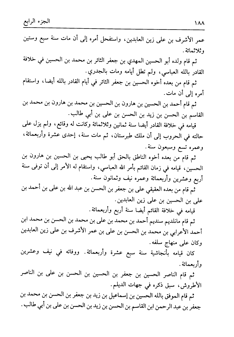 عمر الْأَشْرَف بن عَليّ زين العابدين واستفحل أمره إِلَى أَن مَاتَ سنة سبع وَسِتِّينَ وثلاثمائة ثمَّ قَامَ وَلَده أَبُو الْحُسَيْن الْمهْدي بن جَعْفَر الثائر بن مُحَمَّد بن الْحُسَيْن فِي خلَافَة الْقَادِر بِاللَّه العباسي وَلم تطل أَيَّامه وَمَات بالجدري ثمَّ قَامَ من بعده أَخُوهُ الْحُسَيْن بن جَعْفَر الثائر فِي أَيَّام الْقَادِر بِاللَّه أَيْضا واستقام أمره إِلَى أَن مَاتَ ثمَّ قَامَ أَحْمد بن الْحُسَيْن بن هَارُون بن الْحُسَيْن بن مُحَمَّد بن هَارُون بن مُحَمَّد بن الْقَاسِم بن الْحسن بن زيد بن الْحسن بن عَليّ بن أبي طَالب قِيَامه فِي خلَافَة الْقَادِر أَيْضا سنة ثَمَانِينَ وثلاثمائة وَكَانَت لَهُ وقائع وَلم يزل على حَالَته فِي الحروب إِلَى أَن ملك طبرستان ثمَّ مَاتَ سنة إِحْدَى عشرَة وَأَرْبَعمِائَة وعمره تسع وَسَبْعُونَ سنة ثمَّ قَامَ من بعده أَخُوهُ النَّاطِق بِالْحَقِّ أَبُو طَالب يحيى بن الْحُسَيْن بن هَارُون بن الْحُسَيْن قِيَامه فِي زمَان الْقَائِم بِأَمْر الله العباسي واستقام لَهُ الْأَمر إِلَى أَن توفّي سنة أَربع وَعشْرين وَأَرْبَعمِائَة وعمره نَيف وَثَمَانُونَ سنة ثمَّ قَامَ من بعده العقيقي عَليّ بن جَعْفَر بن الْحسن بن عبد الله بن عَليّ بن أَحْمد بن على بن الْحُسَيْن بن عَليّ زين العابدين قِيَامه فِي خلَافَة الْقَائِم أَيْضا سنة أَربع وَأَرْبَعمِائَة ثمَّ قَامَ مانلديم سنديم أَحْمد بن مُحَمَّد بن عَليّ بن مُحَمَّد بن الْحسن بن مُحَمَّد ابْن أَحْمد الْأَعرَابِي بن مُحَمَّد بن الْحسن بن عَليّ بن عمر الْأَشْرَف بن عَليّ زين العابدين وَكَانَ على منهاج سلفه كَانَ قِيَامه بأنجاشية سنة سبع عشرَة وَأَرْبَعمِائَة ووفاته فِي نَيف وَعشْرين وأريعمائة ثمَّ قَامَ النَّاصِر الْحُسَيْن بن جَعْفَر بن الْحُسَيْن بن الْحسن بن عَليّ بن النَّاصِر الأطروش سبق ذكره فِي جِهَات الديلم ثمَّ قَامَ الْمُوفق بِاللَّه الْحُسَيْن بن إِسْمَاعِيل بن زيد بن جَعْفَر بن الْحسن بن مُحَمَّد بن جَعْفَر بن عبد الرَّحْمَن ابْن الْقَاسِم بن الْحسن بن زيد بن الْحسن بن عَليّ بن أبي طَالب