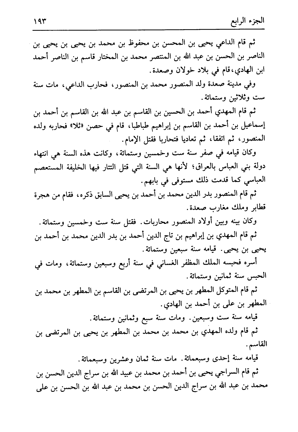 ثمَّ قَامَ الدَّاعِي يحيى بن المحسن بن مَحْفُوظ بن مُحَمَّد بن يحيى بن يحيى بن النَّاصِر بن الْحسن بن عبد الله بن الْمُنْتَصر مُحَمَّد بن الْمُخْتَار قَاسم بن النَّاصِر أَحْمد ابْن الْهَادِي قَامَ فِي بِلَاد خولان وصعدة وَفِي مَدِينَة صعدة ولد الْمَنْصُور مُحَمَّد بن الْمَنْصُور فحارب الدَّاعِي مَاتَ سنة سِتّ وَثَلَاثِينَ وسِتمِائَة ثمَّ قَامَ الْمهْدي أَحْمد بن الْحُسَيْن بن الْقَاسِم بن عبد الله بن الْقَاسِم بن أَحْمد بن إِسْمَاعِيل بن أَحْمد بن الْقَاسِم بن إِبْرَاهِيم طَبَاطَبَا قَامَ فِي حصن ثلا فحاربه وَلَده الْمَنْصُور ثمَّ اتفقَا ثمَّ تعاديا فتحاربا فَقتل الإِمَام وَكَانَ قِيَامه فِي صفر سنة سِتّ وَخمسين وسِتمِائَة وَكَانَت هَذِه السّنة هِيَ انْتِهَاء دولة بني الْعَبَّاس بالعراق لِأَنَّهَا هِيَ السّنة الَّتِي قتل التتار فِيهَا الْخَلِيفَة المستعصم العباسي كَمَا قدمت ذَلِك مُسْتَوْفِي فِي بابهم ثمَّ قَامَ الْمَنْصُور بدر الدّين مُحَمَّد بن أَحْمد بن يحيى السَّابِق ذكره فَقَامَ من هِجْرَة قطابر وَملك مغارب صعدة وَكَانَ بَينه وَبَين أَوْلَاد الْمَنْصُور محاربات فَقتل سنة سِتّ وَخمسين وسِتمِائَة ثمَّ قَامَ الْمهْدي بن إِبْرَاهِيم بن تَاج الدّين أَحْمد بن بدر الدّين مُحَمَّد بن أَحْمد بن يحيى بن يحيى قِيَامه سنة سبعين وسِتمِائَة أسره فحبسه الْملك المظفر الغساني فِي سنة أَربع وَسبعين وسِتمِائَة وَمَات فِي الْحَبْس سنة ثَمَانِينَ وسِتمِائَة ثمَّ قَامَ المتَوَكل المطهر بن يحيى بن المرتضى بن الْقَاسِم بن المطهر بن مُحَمَّد بن المطهر بن عَليّ بن أَحْمد بن الْهَادِي قِيَامه سنة سِتّ وَسبعين وَمَات سنة سبع وَثَمَانِينَ وسِتمِائَة ثمَّ قَامَ وَلَده الْمهْدي بن مُحَمَّد بن مُحَمَّد بن المطهر بن يحيى بن المرتضى بن الْقَاسِم قِيَامه سنة إِحْدَى وَسَبْعمائة مَاتَ سنة ثَمَان وَعشْرين وَسَبْعمائة ثمَّ قَامَ السراجي يحيى بن أَحْمد بن مُحَمَّد بن عبيد الله بن سراج الدّين الْحسن بن مُحَمَّد بن عبد الله بن سراج الدّين الْحسن بن مُحَمَّد بن عبد الله بن الْحسن بن على