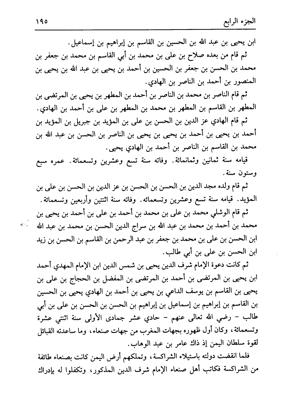 ابْن يحيى بن عبد الله بن الْحُسَيْن بن الْقَاسِم بن إِبْرَاهِيم بن إِسْمَاعِيل ثمَّ قَامَ من بعده صَلَاح بن عَليّ بن مُحَمَّد بن أبي الْقَاسِم بن مُحَمَّد بن جَعْفَر بن مُحَمَّد بن الْحسن بن جَعْفَر بن الْحُسَيْن بن أَحْمد بن يحيى بن عبد الله بن يحيى بن الْمَنْصُور بن أَحْمد بن النَّاصِر بن الْهَادِي ثمَّ قَامَ النَّاصِر بن مُحَمَّد بن النَّاصِر بن أَحْمد بن المطهر بن يحيى بن المرتضى بن المطهر بن الْقَاسِم بن المطهر بن مُحَمَّد بن المطهر بن عَليّ بن أَحْمد بن الْهَادِي ثمَّ قَامَ الْهَادِي عز الدّين بن الْحسن بن عَليّ بن الْمُؤَيد بن جِبْرِيل بن الْمُؤَيد بن أَحْمد بن يحيى بن أَحْمد بن يحيى بن يحيى بن النَّاصِر بن الْحسن بن عبد الله بن مُحَمَّد بن الْقَاسِم بن النَّاصِر بن أَحْمد بن الْهَادِي يحيى قِيَامه سنة ثَمَانِينَ وَثَمَانمِائَة وَفَاته سنة تسع وَعشْرين وَتِسْعمِائَة عمره سبع وَسِتُّونَ سنة ثمَّ قَامَ وَلَده مجد الدّين بن الْحسن بن الْحسن بن عز الدّين بن الْحسن بن عَليّ بن الْمُؤَيد قِيَامه سنة تسع وَعشْرين وَتِسْعمِائَة وَفَاته سنة اثْنَتَيْنِ وَأَرْبَعين وَتِسْعمِائَة ثمَّ قَامَ الوشلي مُحَمَّد بن عَليّ بن مُحَمَّد بن أَحْمد بن عَليّ بن أَحْمد بن يحيى بن مُحَمَّد بن أَحْمد بن مُحَمَّد بن عبد الله بن سراج الدّين الْحسن بن مُحَمَّد بن عبد الله ابْن الْحسن بن عَليّ بن مُحَمَّد بن جَعْفَر بن عبد الرَّحْمَن بن الْقَاسِم بن الْحسن بن زيد ابْن الْحسن بن عَليّ بن أبي طَالب ثمَّ كَانَت دَعْوَة الإِمَام شرف الدّين يحيى بن شمس الدّين ابْن الإِمَام الْمهْدي أَحْمد ابْن يحيى بن المرتضى بن أَحْمد بن المرتضى بن الْمفضل بن الْحجَّاج بن عَليّ بن يحيى بن الْقَاسِم بن يُوسُف الدَّاعِي بن يحيى بن أَحْمد بن الْهَادِي يحيى بن الْحُسَيْن بن الْقَاسِم بن إِبْرَاهِيم بن إِسْمَاعِيل بن إِبْرَاهِيم بن الْحسن بن الْحسن بن عَليّ بن أبي طَالب رَضِي الله تَعَالَى عَنْهُم حادي عشر جُمَادَى الأولى سنة اثْنَتَيْ عشرَة وَتِسْعمِائَة وَكَانَ أول ظُهُوره بجهات الْمغرب من جِهَات صنعاء وَمَا ساعدته الْقَبَائِل لقُوَّة سُلْطَان الْيمن إِذْ ذَاك عَامر بن عبد الْوَهَّاب فَلَمَّا انْقَضتْ دولته باستيلاء الشراكسة وتملكهم أَرض الْيمن كَانَت بِصَنْعَاء طَائِفَة من الشراكسة فكاتب أهل صنعاء الإِمَام شرف الدّين الْمَذْكُور وتكلفوا لَهُ بِإِدْرَاك
