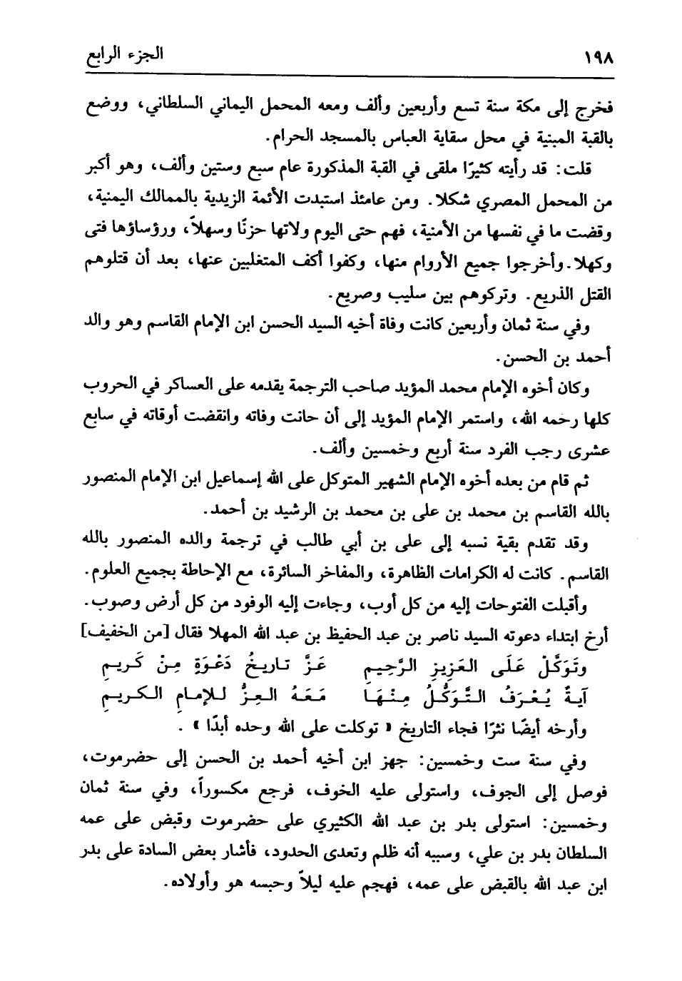 فَخرج إِلَى مَكَّة سنة تسع وَأَرْبَعين وَألف وَمَعَهُ الْمحمل الْيَمَانِيّ السلطاني وَوضع بالقبة المبنية فِي مَحل سِقَايَة الْعَبَّاس بِالْمَسْجِدِ الْحَرَام قلت قد رَأَيْته كثيرا ملقى فِي الْقبَّة الْمَذْكُورَة عَام سبع وَسِتِّينَ وَألف وَهُوَ أكبر من الْمحمل الْمصْرِيّ شكلاً وَمن عامئذ استبدت الْأَئِمَّة الزيدية بالممالك اليمنية وقضت مَا فِي نَفسهَا من الأمنية فهم حَتَّى الْيَوْم ولاتها حزنا وسهلا ورؤساؤها فَتى وكهلا وأخرجوا جَمِيع الأورام مِنْهَا وَكفوا أكف المتغلبين عَنْهَا بعد أَن قتلوهم الْقَتْل الذريع وتركوهم بَين سليب وصريع وَفِي سنة ثَمَان وَأَرْبَعين كَانَت وَفَاة أَخِيه السَّيِّد الْحسن ابْن الإِمَام الْقَاسِم وَهُوَ وَالِد أَحْمد بن الْحسن وَكَانَ أَخُوهُ الإِمَام مُحَمَّد الْمُؤَيد صَاحب التَّرْجَمَة يقدمهُ على العساكر فِي الحروب كلهَا رَحمَه الله وَاسْتمرّ الإِمَام مُحَمَّد الْمُؤَيد إِلَى أَن حانت وَفَاته وَانْقَضَت أوقاته فِي سَابِع عشري رَجَب الْفَرد سنة أَربع وَخمسين وَألف ثمَّ قَامَ من بعده أَخُوهُ الإِمَام الشهير المتَوَكل على الله إِسْمَاعِيل ابْن الإِمَام الْمَنْصُور بِاللَّه الْقَاسِم بن مُحَمَّد بن عَليّ بن مُحَمَّد بن الرشيد بن أَحْمد وَقد تقدم بَقِيَّة نسبه إِلَى عَليّ بن أبي طَالب فِي تَرْجَمَة وَالِده الْمَنْصُور بِاللَّه الْقَاسِم كَانَت لَهُ الكرامات الظَّاهِرَة والمفاخر السائرة مَعَ الْإِحَاطَة بِجَمِيعِ الْعُلُوم وَأَقْبَلت الفتوحات إِلَيْهِ من كل أَوب وَجَاءَت إِلَيْهِ الْوُفُود من كل أَرض وَصوب أرخ ابْتِدَاء دَعوته السَّيِّد نَاصِر بن عبد الحفيظ بن عبد الله المهلا فَقَالَ // (من الْخَفِيف) //