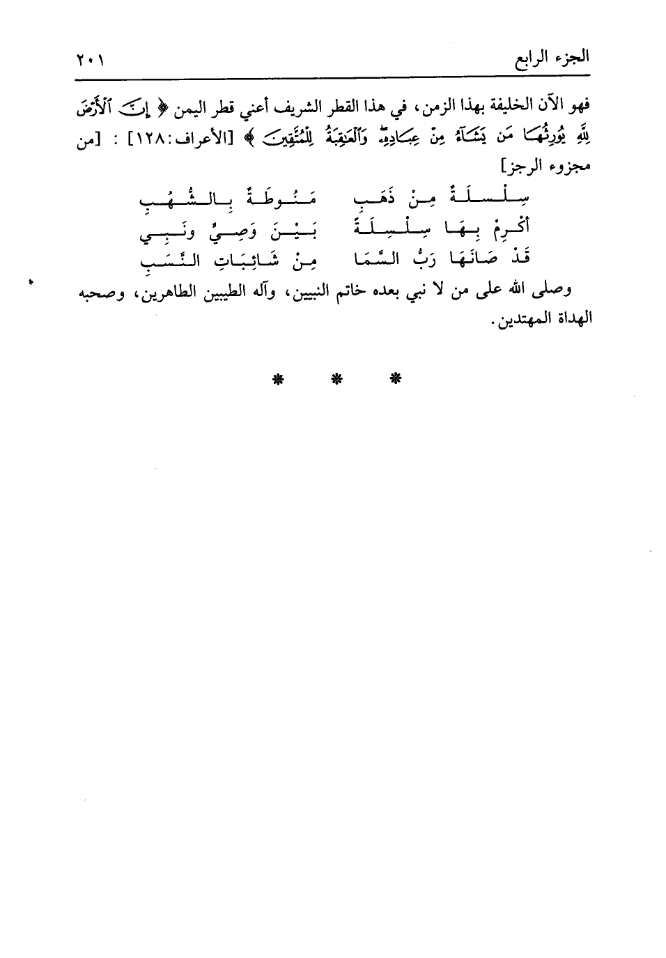 فَهُوَ الْآن الْخَلِيفَة بِهَذَا الزَّمن فِي هَذَا الْقطر الشريف أَعنِي قطر الْيمن {إنَّ اَلأَرضَ لله يُورثهَا من يَشَاء من عباده والعقبة لِلمُتقِين} الْأَعْرَاف 128 // (من مجزوء الرجز) //