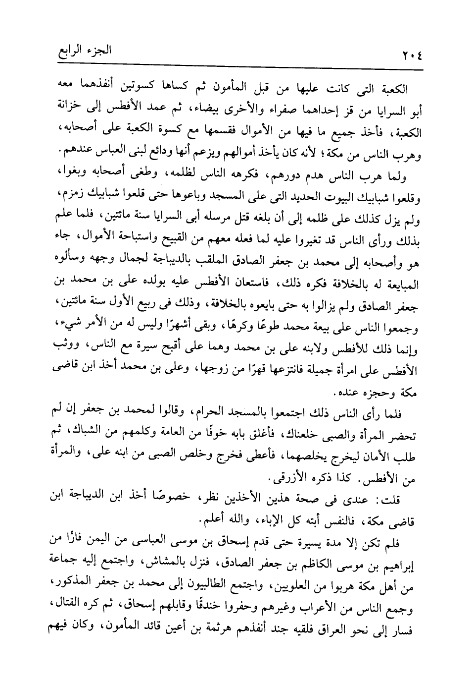 الْكَعْبَة الَّتِي كَانَت عَلَيْهَا من قبل الْمَأْمُون ثمَّ كساها كسوتين أنفذهما مَعَه أَبُو السَّرَايَا من قَز إِحْدَاهمَا صفراء وَالْأُخْرَى بَيْضَاء ثمَّ عمد الْأَفْطَس إِلَى خزانَة الْكَعْبَة فَأخذ جَمِيع مَا فِيهَا من الْأَمْوَال فَقَسمهَا مَعَ كسْوَة الْكَعْبَة على أَصْحَابه وهرب النَّاس من مَكَّة لِأَنَّهُ كَانَ يَأْخُذ أَمْوَالهم يزْعم أَنَّهَا ودائع لبني الْعَبَّاس عِنْدهم وَلما هرب النَّاس هدم دُورهمْ فكرهه النَّاس لظلمه وطغى أَصْحَابه وبغوا وقلعوا شبابيك الْبيُوت الْحَدِيد الَّتِي على الْمَسْجِد وباعوها حَتَّى قلعوا شبابيك زَمْزَم وَلم يزل كَذَلِك على ظلمه إِلَى أَن بلغه قتل مرسله أبي السَّرَايَا سنة مِائَتَيْنِ فَلَمَّا علم بذلك وَرَأى النَّاس قد تغيرُوا عَلَيْهِ لما فعله مَعَهم من الْقَبِيح واستباحة الْأَمْوَال جَاءَ هُوَ وَأَصْحَابه إِلَى مُحَمَّد بن جَعْفَر الصَّادِق الملقب بالديباجة لجمال وَجهه وسألوه الْمُبَايعَة لَهُ بالخلافة فكره ذَلِك فاستعان الْأَفْطَس عَلَيْهِ بولده عَليّ بن مُحَمَّد بن جَعْفَر الصَّادِق وَلم يزَالُوا بِهِ حَتَّى بَايعُوهُ بالخلافة وَذَلِكَ فِي ربيع الأول سنة مِائَتَيْنِ وجمعوا النَّاس على بيعَة مُحَمَّد طَوْعًا وَكرها وَبَقِي أشهر وَلَيْسَ لَهُ من من الْأَمر شَيْء وَإِنَّمَا ذَلِك للأفطس ولابنه عَليّ بن مُحَمَّد وهما على أقبح سيرة مَعَ النَّاس ووثب الْأَفْطَس على امْرَأَة جميلَة فانتزعها قهرا من زَوجهَا وَعلي بن مُحَمَّد أَخذ ابْن قَاضِي مَكَّة وحجزه عِنْده فَلَمَّا رأى النَّاس ذَلِك اجْتَمعُوا بِالْمَسْجِدِ الْحَرَام وَقَالُوا لمُحَمد بن جَعْفَر إِن لم تحضر الْمَرْأَة وَالصَّبِيّ خلعناك فأغلق بَابه خوفًا من الْعَامَّة وكلمهم من الشباك ثمَّ طلب الْأمان ليخرج يخلصهما فَأعْطى فَخرج وخلص الصَّبِي من ابْنه عَليّ وَالْمَرْأَة من الْأَفْطَس كَذَا ذكره الْأَزْرَقِيّ قلت عِنْدِي فِي صِحَة هذَيْن الأخذين نظر خُصُوصا أَخذ ابْن الديباجة ابْن قَاضِي مَكَّة فَالنَّفْس أبته كل الإباء وَالله أعلم فَلم تكن إِلَّا مُدَّة يسرة حَتَّى قدم إِسْحَاق بن مُوسَى العباسي من الْيمن فَارًّا من إِبْرَاهِيم بن مُوسَى الكاظم بن جَعْفَر الصَّادِق فَنزل بالمشاش وَاجْتمعَ إِلَيْهِ جمَاعَة من أهل مَكَّة هربوا من العلويين وَاجْتمعَ الطالبيون إِلَى مُحَمَّد بن جَعْفَر الْمَذْكُور وَجمع النَّاس من الْأَعْرَاب وَغَيرهم وحفروا خَنْدَقًا وقابلهم إِسْحَاق ثمَّ كره الْقِتَال فَسَار إِلَى نَحْو الْعرَاق فَلَقِيَهُ جند أنفذهم هرثمة بن أعين قَائِد الْمَأْمُون وَكَانَ فيهم