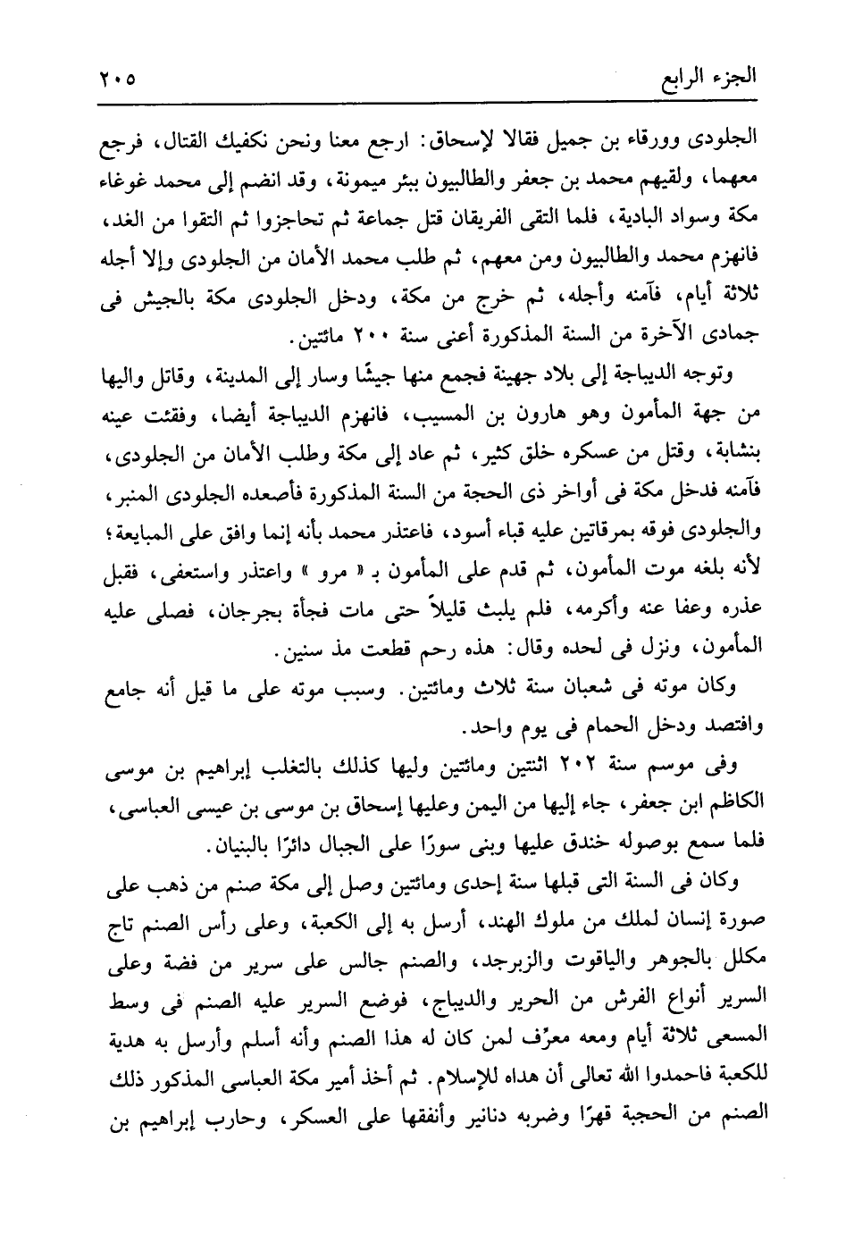 الجلودي وورقاء بن جميل فَقَالَا لإسحاق ارْجع مَعنا وَنحن نكفيك الْقِتَال فَرجع مَعَهُمَا ولقيهم مُحَمَّد بن جَعْفَر والطالبيون ببئر مَيْمُونَة وَقد انْضَمَّ إِلَى مُحَمَّد غوغاء مَكَّة وَسَوَاد الْبَادِيَة فَلَمَّا التقى الْفَرِيقَانِ قتل جمَاعَة ثمَّ تحاجزوا ثمَّ الْتَقَوْا من الْغَد فَانْهَزَمَ مُحَمَّد والطالبيون وَمن مَعَهم ثمَّ طلب مُحَمَّد الْأمان من الجلودي وَألا أجلة ثَلَاثَة أَيَّام فآمنه وأجله ثمَّ خرج من مَكَّة وَدخل الجلودي مَكَّة بالجيش فِي جُمَادَى الْآخِرَة من السّنة الْمَذْكُورَة أَعنِي سنة 200 مِائَتَيْنِ وَتوجه الديباجة إِلَى بِلَاد جُهَيْنَة فَجمع مِنْهَا جَيْشًا وَسَار إِلَى الْمَدِينَة وَقَاتل واليها من جِهَة الْمَأْمُون وَهُوَ هَارُون بن الْمسيب فَانْهَزَمَ الديباجة أَيْضا وفقئت عينه بنشابة وَقتل من عسكره خلق كثير ثمَّ عَاد إِلَى مَكَّة وَطلب الْأمان من الجلودي فآمنه فَدخل مَكَّة فِي أَوَاخِر ذِي الْحجَّة من السّنة الْمَذْكُورَة فأصعده الجلودي الْمِنْبَر والجلودي فَوْقه بمرقاتين عَلَيْهِ قبَاء أسود فَاعْتَذر مُحَمَّد بِأَنَّهُ إِنَّمَا وَافق على الْمُبَايعَة لِأَنَّهُ بلغه موت الْمَأْمُون ثمَّ قدم على الْمَأْمُون ب مرو وَاعْتذر واستعفى فَقبل عذره وَعَفا عَنهُ وأكرمه فَلم يلبث قَلِيلا حَتَّى مَاتَ فَجْأَة بجرجان فصلى عَلَيْهِ الْمَأْمُون وَنزل فِي لحده وَقَالَ هَذِه رحم قطعت مذ سِنِين وَكَانَ مَوته فِي شعْبَان سنة ثَلَاث وَمِائَتَيْنِ وَسبب مَوته على مَا قيل أَنه جَامع وافتصد وَدخل الْحمام فِي يَوْم وَاحِد وَفِي موسم سنة 202 اثْنَتَيْنِ وَمِائَتَيْنِ وَليهَا كَذَلِك بالتغلب إِبْرَاهِيم بن مُوسَى الكاظم ابْن جَعْفَر جَاءَ إِلَيْهَا من الْيمن وَعَلَيْهَا إِسْحَاق بن مُوسَى بن عِيسَى العباسي فَلَمَّا سمع بوصوله خَنْدَق عَلَيْهَا وَبنى سوراً على الْجبَال دائراً بالبنيان وَكَانَ فِي السّنة الَّتِي قبلهَا سنة إِحْدَى وَمِائَتَيْنِ وصل إِلَى مَكَّة صنم من ذهب على صُورَة إِنْسَان لملك من مُلُوك الْهِنْد أرسل بِهِ إِلَى الْكَعْبَة وعَلى رَأس الصَّنَم تَاج مكلل بالجوهر والياقوت والزبرجد والصنم جَالس على سَرِير من فضَّة وعَلى السرير أَنْوَاع الْفرش من الْحَرِير والديباج فَوضع السرير عَلَيْهِ الصَّنَم فِي وسط الْمَسْعَى ثَلَاثَة أَيَّام وَمَعَهُ معرِّف لمن كَانَ لَهُ هَذَا الصَّنَم وَأَنه أسلم وَأرْسل بِهِ هَدِيَّة للكعبة فاحمدوا الله تَعَالَى أَن هداه لِلْإِسْلَامِ ثمَّ أخد أَمِير مَكَّة العباسي الْمَذْكُور ذَلِك الصَّنَم من الحجبة قهرا وضربه دَنَانِير وأنفقها على الْعَسْكَر وَحَارب إِبْرَاهِيم بن