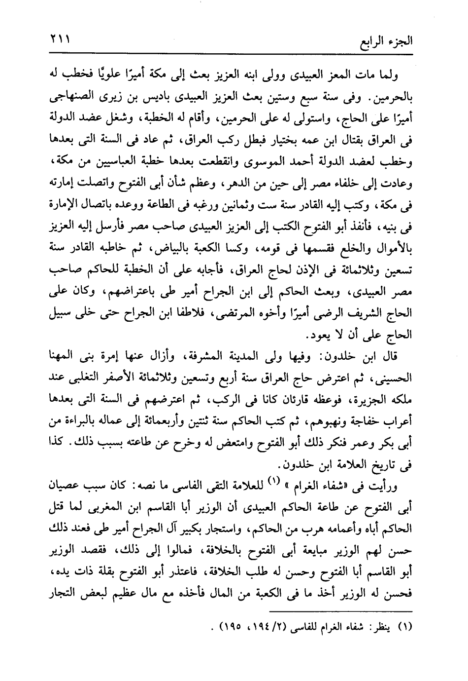 وَلما مَاتَ الْمعز العبيدي وَولى ابْنه الْعَزِيز بعث إِلَى مَكَّة أَمِيرا علوياً فَخَطب لَهُ بالحرمين وَفِي سنة سبع وَسِتِّينَ بعث الْعَزِيز العبيدي باديس بن زيري الصنهاجي أَمِيرا على الْحَاج وَاسْتولى لَهُ على الْحَرَمَيْنِ وَأقَام لَهُ الْخطْبَة وشغل عضد الدولة فِي الْعرَاق بِقِتَال ابْن عَمه بختيار فَبَطل ركب الْعرَاق ثمَّ عَاد فِي السّنة الَّتِي بعْدهَا وخطب لعضد الدولة أَحْمد الموسوي وانقطعت بعْدهَا خطْبَة العباسيين من مَكَّة وعادت إِلَى خلفاء مصر إِلَى حِين من الدَّهْر وَعظم شَأْن أبي الْفتُوح واتصلت إمارته فِي مَكَّة وَكتب إِلَيْهِ الْقَادِر سنة سِتّ وَثَمَانِينَ ورغبه فِي الطَّاعَة ووعده باتصال الْإِمَارَة فِي بنيه فأنفذ أَبُو الْفتُوح الْكتب إِلَى الْعَزِيز العبيدي صَاحب مصر فَأرْسل إِلَيْهِ الْعَزِيز بالأموال وَالْخلْع فَقَسمهَا فِي قومه وكسا الْكَعْبَة بالبياض ثمَّ خاطبه الْقَادِر سنة تسعين وثلاثمائة فِي الْإِذْن لحاج الْعرَاق فَأَجَابَهُ على أَن الْخطْبَة للْحَاكِم صَاحب مصر العبيدي وَبعث الْحَاكِم إِلَى ابْن الْجراح أَمِير طي باعتراضهم وَكَانَ على الْحَاج الشريف الرضي أَمِيرا وَأَخُوهُ المرتضى فلاطفا ابْن الْجراح حَتَّى خلي سَبِيل الْحَاج على أَن لَا يعود قَالَ ابْن خلدون وفيهَا ولي الْمَدِينَة المشرفة وأزال عَنْهَا إمرة بني المهنا الْحُسَيْنِي ثمَّ اعْترض حَاج الْعرَاق سنة أَربع وَتِسْعين وثلاثمائة الْأَصْفَر التغلبي عِنْد ملكه الجزيرة فوعظه قارئان كَانَا فِي الركب ثمَّ اعْتَرَضَهُمْ فِي السّنة الَّتِي بعْدهَا أَعْرَاب خفاجة ونهبوهم ثمَّ كتب الْحَاكِم سنة ثِنْتَيْنِ وَأَرْبَعمِائَة إِلَى عماله بِالْبَرَاءَةِ من أبي بكر وَعمر فنكر ذَلِك أَبُو الْفتُوح وامتعض لَهُ وَخرج عَن طَاعَته بِسَبَب ذَلِك كَذَا فِي تَارِيخ الْعَلامَة ابْن خلدون وَرَأَيْت فِي شِفَاء الغرام للعلامة التقي الفاسي مَا نَصه كَانَ سَبَب عصيان أبي الْفتُوح عَن طَاعَة الْحَاكِم العبيدي أَن الْوَزير أَبَا الْقَاسِم ابْن المغربي لما قتل الْحَاكِم أَبَاهُ وأعمامه هرب من الْحَاكِم واستجار بكبير آل الْجراح أَمِير طي فَعِنْدَ ذَلِك حسن لَهُم الْوَزير مبايعة أبي الْفتُوح بالخلافة فمالوا إِلَى ذَلِك فقصد الْوَزير أَبُو الْقَاسِم أَبَا الْفتُوح وَحسن لَهُ طلب الْخلَافَة فَاعْتَذر أَبُو الْفتُوح بقلة ذَات يَده فَحسن لَهُ الْوَزير أَخذ مَا فِي الْكَعْبَة من المَال فَأَخذه مَعَ مَال عَظِيم لبَعض التُّجَّار