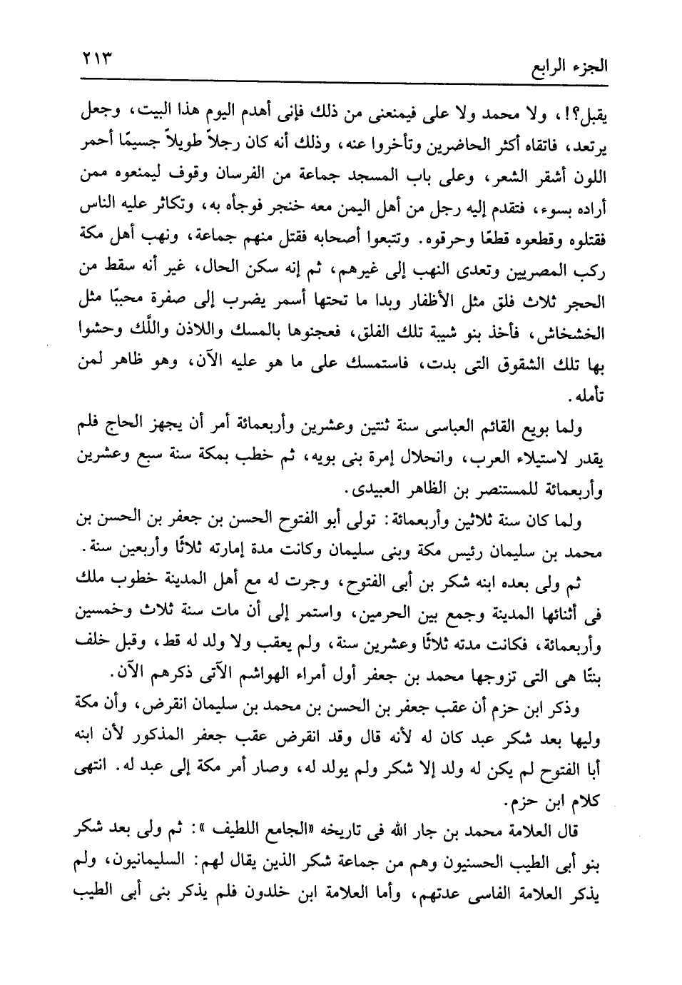 يقبل وَلَا مُحَمَّد وَلَا عَليّ فيمنعني من ذَلِك فَإِنِّي أهدم الْيَوْم هَذَا الْبَيْت وَجعل يرتعد فاتقاه أَكثر الْحَاضِرين وتأخروا عَنهُ وَذَلِكَ أَنه كَانَ رجلا طَويلا جسيماً أَحْمَر اللَّوْن أشقر الشّعْر وعَلى بَاب الْمَسْجِد جمَاعَة من الفرسان وقُوف ليمنعوه مِمَّن أَرَادَهُ بِسوء فَتقدم إِلَيْهِ رجل من أهل الْيمن مَعَه خنجر فوجأه بِهِ وتكاثر عَلَيْهِ النَّاس فَقَتَلُوهُ وقطعوه قطعا وحرقوه وتتبعوا أَصْحَابه فَقتل مِنْهُم جمَاعَة وَنهب أهل مَكَّة ركب المصريين وتعدى النهب إِلَى غَيرهم ثمَّ إِنَّه سكن الْحَال غير أَنه سقط من الْحجر ثَلَاث فلق مثل الْأَظْفَار وبدا مَا تحتهَا أسمر يضْرب إِلَى صفرَة محبباً مثل الخشخاش فَأخذ بَنو شيبَة تِلْكَ الفلق فعجنوها بالمسك واللاذن واللَّك وحشوا بهَا تِلْكَ الشقوق الَّتِي بَدَت فَاسْتَمْسك على مَا هُوَ عَلَيْهِ الْآن وَهُوَ ظَاهر لمن تَأمله وَلما بُويِعَ الْقَائِم العباسي سنة ثِنْتَيْنِ وَعشْرين وَأَرْبَعمِائَة أَمر أَن يُجهز الْحَاج فَلم يقدر لاستيلاء الْعَرَب وانحلال إمرة بني بويه ثمَّ خطب بِمَكَّة سنة سبع وَعشْرين وَأَرْبَعمِائَة للمستنصر بن الظَّاهِر العبيدي وَلما كَانَ سنة ثَلَاثِينَ وَأَرْبَعمِائَة تولى أَبُو الْفتُوح الْحسن بن جَعْفَر بن الْحسن بن مُحَمَّد بن سُلَيْمَان رَئِيس مَكَّة وَبني سُلَيْمَان وَكَانَت مُدَّة إمارته ثَلَاثًا وَأَرْبَعين سنة تمّ ولى بعده ابْنه شكر بن أبي الْفتُوح وَجَرت لَهُ مَعَ أهل الْمَدِينَة خطوب ملك فى أَثْنَائِهَا الْمَدِينَة وَجمع بَين الْحَرَمَيْنِ وَاسْتمرّ إِلَى أَن مَاتَ سنة ثَلَاث وَخمسين وَأَرْبَعمِائَة فَكَانَت مدَّته ثَلَاثًا وَعشْرين سنة وَلم يعقب وَلَا ولد لَهُ قطّ وَقيل خلف بِنْتا هِيَ الَّتِي تزَوجهَا مُحَمَّد بن جَعْفَر أول أُمَرَاء الهواشم الْآتِي ذكرهم الْآن وَذكر ابْن حزم أَن عقب جَعْفَر بن الْحسن بن مُحَمَّد بن سُلَيْمَان انقرض وَأَن مَكَّة وَليهَا بعد شكر عبد كَانَ لَهُ لِأَنَّهُ قَالَ وَقد انقرض عقب جَعْفَر الْمَذْكُور لِأَن ابْنه أَبَا الْفتُوح لم يكن لَهُ ولد أَلا شكر وَلم يُولد لَهُ وَصَارَ أَمر مَكَّة إِلَى عبد لَهُ انْتهى كَلَام ابْن حزم قَالَ الْعَلامَة مُحَمَّد بن جَار الله فِي تَارِيخه الْجَامِع اللَّطِيف ثمَّ ولي بعد شكر بَنو أبي الطّيب الحسنيون وهم من جمَاعَة شكر الَّذين يُقَال لَهُم السليمانيون وَلم يذكر الْعَلامَة الفاسي عدتهمْ وَأما الْعَلامَة ابْن خلدون فَلم يذكر بني أبي الطّيب