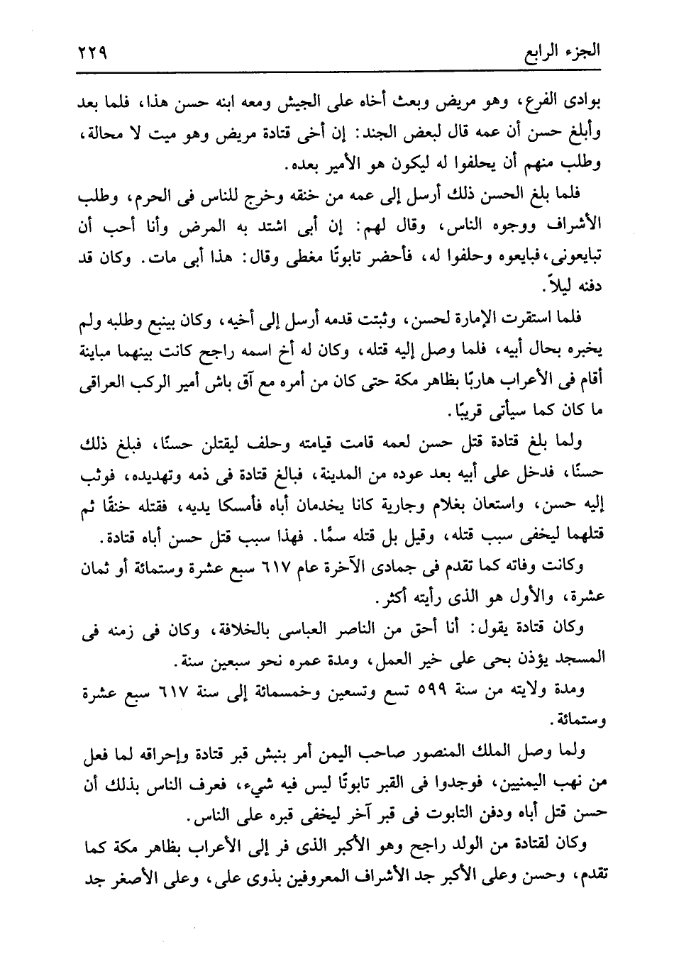 بوادي الْفَرْع وَهُوَ مَرِيض وَبعث أَخَاهُ على الْجَيْش وَمَعَهُ ابْنه حسن هَذَا فَلَمَّا بعد وأبلغ حسن أَن عَمه قَالَ لبَعض الْجند إِن أخي قَتَادَة مَرِيض وَهُوَ ميت لَا محَالة وَطلب مِنْهُم أَن يحلفوا لَهُ ليَكُون هُوَ الْأَمِير بعده فَلَمَّا بلغ الْحسن ذَلِك أرسل إِلَى عَمه من خنقه وَخرج للنَّاس فِي الْحرم وَطلب الْأَشْرَاف ووجوه النَّاس وَقَالَ لَهُم إِن أبي اشْتَدَّ بِهِ الْمَرَض وَأَنا أحب أَن تُبَايِعُونِي فَبَايعُوهُ وحلفوا لَهُ فأحضر تابوتاً مغطى وَقَالَ هَذَا أبي مَاتَ وَكَانَ قد دَفنه لَيْلًا فَلَمَّا اسْتَقَرَّتْ الْإِمَارَة لحسن وَثبتت قدمه أرسل إِلَى أَخِيه وَكَانَ بينبع وَطَلَبه وَلم يُخبرهُ بِحَال أَبِيه فَلَمَّا وصل إِلَيْهِ قَتله وَكَانَ لَهُ أَخ اسْمه رَاجِح كَانَت بَينهمَا مباينة أَقَامَ فِي الْأَعْرَاب هَارِبا بِظَاهِر مَكَّة حَتَّى كَانَ من أمره مَعَ آق باش أَمِير الركب الْعِرَاقِيّ مَا كَانَ كَمَا سَيَأْتِي قَرِيبا وَلما بلغ قَتَادَة قتل حسن لِعَمِّهِ قَامَت قِيَامَته وَحلف ليقْتلن حسنا فَبلغ ذَلِك حسنا فَدخل على أَبِيه بعد عوده من الْمَدِينَة فَبَالغ قَتَادَة فِي ذمه وتهديده فَوَثَبَ إِلَيْهِ حسن واستعان بِغُلَام وَجَارِيَة كَانَا يخدمان أَبَاهُ فأمسكا يَدَيْهِ فَقتله خنقاً ثمَّ قَتلهمَا ليخفي سَبَب قَتله وَقيل بل قَتله سما فَهَذَا سَبَب قتل حسن أَبَاهُ قَتَادَة وَكَانَت وَفَاته كَمَا تقدم فِي جُمَادَى الْآخِرَة عَام 617 سبع عشرَة وسِتمِائَة أَو ثَمَان عشرَة وَالْأول هُوَ الَّذِي رَأَيْته أَكثر وَكَانَ قَتَادَة يَقُول أَنا أَحَق من النَّاصِر العباسي بالخلافة وَكَانَ فِي زَمَنه فِي الْمَسْجِد يُؤذن بحي على خير الْعَمَل وَمُدَّة عمره نَحْو سبعين سنة وَمُدَّة ولَايَته من سنة 599 تسع وَتِسْعين وَخَمْسمِائة إِلَى سنة 617 سبع عشرَة وسِتمِائَة وَلما وصل الْملك الْمَنْصُور صَاحب الْيمن أَمر بنبش قبر قَتَادَة وإحراقه لما فعل من نهب اليمنيين فوجدوا فِي الْقَبْر تابوتاً لَيْسَ فِيهِ شَيْء فَعرف النَّاس بذلك أَن حسن قتل أَبَاهُ وَدفن التابوت فِي قبر آخر ليخفي قَبره على النَّاس وَكَانَ لِقَتَادَة من الْوَلَد رَاجِح وَهُوَ الْأَكْبَر الَّذِي فر إِلَى الْأَعْرَاب بِظَاهِر مَكَّة كَمَا تقدم وَحسن وعَلى الْأَكْبَر جد الْأَشْرَاف المعروفين بذوي عَليّ وعَلى الْأَصْغَر جد