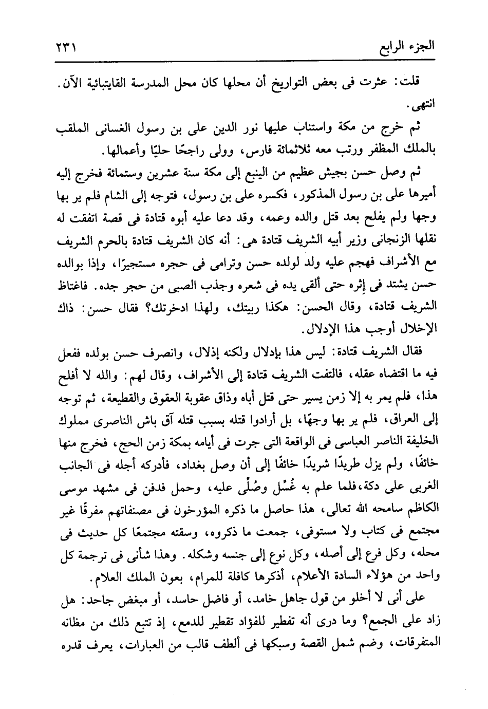 قلت عثرت فِي بعض التواريخ أَن محلهَا كَانَ مَحل الْمدرسَة القايتبائية الْآن انْتهى ثمَّ خرج من مَكَّة واستناب عَلَيْهَا نور الدّين عَليّ بن رَسُول الغساني الملقب بِالْملكِ المظفر ورتب مَعَه ثَلَاثمِائَة فَارس وَولى راجحاً حليا وأعمالها ثمَّ وصل حسن بِجَيْش عَظِيم من الينبع إِلَى مَكَّة سنة عشْرين وسِتمِائَة فَخرج إِلَيْهِ أميرها عَليّ بن رَسُول الْمَذْكُور فَكَسرهُ عَليّ بن رَسُول فَتوجه إِلَى الشَّام فَلم ير بهَا وَجها وَلم يفلح بعد قتل وَالِده وَعَمه وَقد دَعَا عَلَيْهِ أَبوهُ قَتَادَة فِي قصَّة اتّفقت لَهُ نقلهَا الزنجاني وَزِير أَبِيه الشريف قَتَادَة هِيَ أَنه كَانَ الشريف قَتَادَة بِالْحرم الشريف مَعَ الْأَشْرَاف فهجم عَلَيْهِ ولد لوَلَده حسن وترامى فِي حجره مستجيراً وَإِذا بوالده حسن يشْتَد فِي إِثره حَتَّى ألْقى يَده فِي شعره وجذب الصَّبِي من حجر جده فاغتاظ الشريف قَتَادَة وَقَالَ الْحسن هَكَذَا ربيتك وَلِهَذَا ادخرتك فَقَالَ حسن ذَاك الْإِخْلَال أوجب هَذَا الإدلال فَقَالَ الشريف قَتَادَة لَيْسَ هَذَا بإدلال وَلكنه إذلال وَانْصَرف حسن بولده فَفعل فِيهِ مَا اقْتَضَاهُ عقله فَالْتَفت الشريف قَتَادَة إِلَى الْأَشْرَاف وَقَالَ لَهُم وَالله لَا أَفْلح هَذَا فَلم يمر بِهِ أَلا زمن يسير حَتَّى قتل أَبَاهُ وذاق عُقُوبَة العقوق والقطيعة ثمَّ توجه إِلَى الْعرَاق فَلم ير بهَا وَجها بل أَرَادوا قَتله بِسَبَب قَتله آق باش الناصري مَمْلُوك الْخَلِيفَة النَّاصِر العباسي فِي الْوَاقِعَة الَّتِي جرت فِي أَيَّامه بِمَكَّة زمن الْحَج فَخرج مِنْهَا خَائفًا وَلم يزل طريداً شَرِيدًا خَائفًا إِلَى أَن وصل بَغْدَاد فأدركه أَجله فِي الْجَانِب الغربي على دكة فَلَمَّا علم بِهِ غُسل وصُلي عَلَيْهِ وَحمل فَدفن فِي مشْهد مُوسَى الكاظم سامحه الله تَعَالَى هَذَا حَاصِل مَا ذكره المؤرخون فِي مصنفاتهم مفرقاً غير مُجْتَمع فِي كتاب وَلَا مُسْتَوْفِي جمعت مَا ذَكرُوهُ وسقته مجتمعاً كل حَدِيث فِي مَحَله وكل فرع إِلَى أَصله وكل نوع إِلَى جنسه وشكله وَهَذَا شاني فِي تَرْجَمَة كل وَاحِد من هَؤُلَاءِ السَّادة الْأَعْلَام أذكرها كافلة للمرام بعون الْملك العلام على إِنِّي لَا أَخْلو من قَول جَاهِل خامد أَو فَاضل حَاسِد أَو مبغض جَاحد هَل زَاد على الْجمع وَمَا درى أَنه تفطير للفؤاد تقطير للدمع إِذْ تتبع ذَلِك من مظانه المتفرقات وَضم شَمل الْقِصَّة وسبكها فِي ألطف قالب من الْعبارَات يعرف قدره