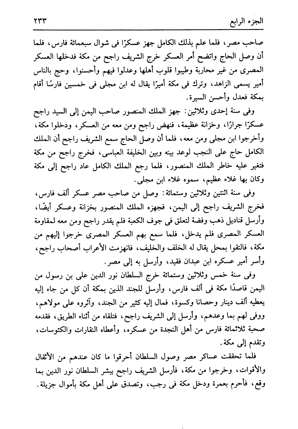 صَاحب مصر فَلَمَّا علم بذلك الْكَامِل جهز عسكراً فِي شَوَّال سَبْعمِائة فَارس فَلَمَّا أَن وصل الْحَاج واتضح أَمر الْعَسْكَر خرج الشريف رَاجِح من مَكَّة فَدَخلَهَا الْعَسْكَر الْمصْرِيّ من غير محاربة وطيبوا قُلُوب أَهلهَا وَعدلُوا فيهم وأحسنوا وَحج بِالنَّاسِ أَمِير يُسمى الزَّاهِد وَترك فِي مَكَّة أَمِيرا يُقَال لَهُ ابْن مجلي فِي خمسين فَارِسًا أَقَامَ بِمَكَّة فَعدل وَأحسن السِّيرَة وَفِي سنة إِحْدَى وَثَلَاثِينَ جهز الْملك الْمَنْصُور صَاحب الْيمن إِلَى السَّيِّد رَاجِح عسكراً جراراً وخزانة عَظِيمَة فَنَهَضَ رَاجِح وَمن مَعَه من الْعَسْكَر ودخلوا مَكَّة وأخرجوا ابْن مجلي وَمن مَعَه فَلَمَّا أَن وصل الْحَاج سمع الشريف راحج أَن الْملك الْكَامِل حَاج على النجب لوعد بَينه وَبَين الْخَلِيفَة العباسي فَخرج رَاجِح من مَكَّة فَتغير عَلَيْهِ خاطر الْملك الْمَنْصُور فَلَمَّا رَجَعَ الْملك الْكَامِل عَاد رَاجِح إِلَى مَكَّة وَكَانَ بهَا غلاء عَظِيم سموهُ غلاء ابْن مجلي وَفِي سنة اثْنَتَيْنِ وَثَلَاثِينَ وسِتمِائَة وصل من صَاحب مصر عَسْكَر ألف فَارس فَخرج الشريف رَاجِح إِلَى الْيمن فجهزه الْملك الْمَنْصُور بخزانة وعسكر أَيْضا وَأرْسل قناديل ذهب وَفِضة لتَعلق فِي جَوف الْكَعْبَة فَلم يقدر رَاجِح وَمن مَعَه لمقاومة الْعَسْكَر الْمصْرِيّ فَلم يدْخل فَلَمَّا سمع بهم الْعَسْكَر الْمصْرِيّ خَرجُوا إِلَيْهِم من مَكَّة فَالْتَقوا بِمحل يُقَال لَهُ الْخلف والخليف فانهزمت الْأَعْرَاب أَصْحَاب رَاجِح وَأسر أَمِير عسكره ابْن عَبْدَانِ فقيد وَأرْسل بِهِ إِلَى مصر وَفِي سنة خمس وَثَلَاثِينَ وسِتمِائَة خرج السُّلْطَان نور الدّين عَليّ بن رَسُول من الْيمن قَاصِدا مَكَّة فِي ألف فَارس وَأرْسل للجند الَّذين بِمَكَّة أَن كل من جَاءَ إِلَيْهِ يُعْطِيهِ ألف دِينَار وحصاناً وَكِسْوَة فَمَال إِلَيْهِ كثير من الْجند وآثروه على مَوْلَاهُم ووفي لَهُم بِمَا وعدهم وَأرْسل إِلَى الشريف رَاجِح فَتَلقاهُ من أثْنَاء الطَّرِيق فقدمه صُحْبَة ثَلَاثمِائَة فَارس من أهل النجدة من عسكره وَأَعْطَاهُ النقارات والكئوسات وَتقدم إِلَى مَكَّة فَلَمَّا تحققت عَسَاكِر مصر وُصُول السُّلْطَان أحرقوا مَا كَانَ عِنْدهم من الأثقال والأقوات وَخَرجُوا من مَكَّة فَأرْسل الشريف رَاجِح يبشر السُّلْطَان نور الدّين بِمَا وَقع فَأحْرم بِعُمْرَة وَدخل مَكَّة فِي رَجَب وَتصدق على أهل مَكَّة بأموال جزيلة