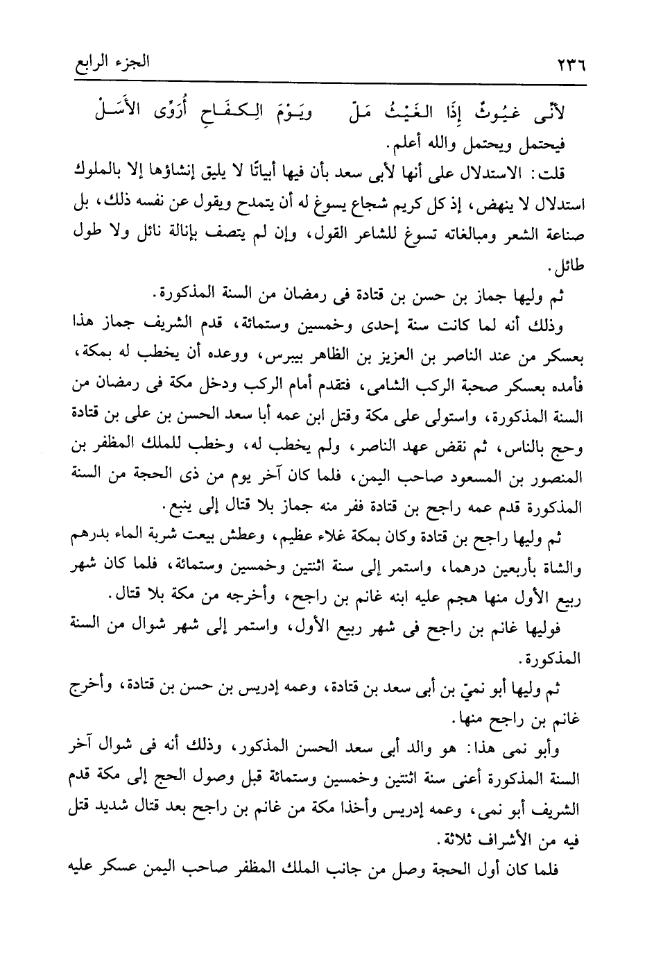 فَيحْتَمل وَيحْتَمل وَالله أعلم قلت الِاسْتِدْلَال على أَنَّهَا لأبي سعد بِأَن فِيهَا أبياتاً لَا يَلِيق إنشاؤها أَلا بالملوك اسْتِدْلَال لَا ينْهض إِذْ كل كريم شُجَاع يسوغ لَهُ أَن يتمدح وَيَقُول عَن نَفسه ذَلِك بل صناعَة الشّعْر ومبالغاته تسوغ للشاعر القَوْل وَإِن لم يَتَّصِف بإنالة نائل وَلَا طول طائل ثمَّ وَليهَا جماز بن حسن بن قَتَادَة فِي رَمَضَان من السّنة الْمَذْكُورَة وَذَلِكَ أَنه لما كَانَت سنة إِحْدَى وَخمسين وسِتمِائَة قدم الشريف جماز هَذَا بعسكر من عِنْد النَّاصِر بن الْعَزِيز بن الظَّاهِر بيبرس ووعده أَن يخْطب لَهُ بِمَكَّة فأمده بعسكر صُحْبَة الركب الشَّامي فَتقدم أَمَام الركب وَدخل مَكَّة فِي رَمَضَان من السّنة الْمَذْكُورَة وَاسْتولى على مَكَّة وَقتل ابْن عَمه أَبَا سعد الْحسن بن عَليّ بن قَتَادَة وَحج بِالنَّاسِ ثمَّ نقض عهد النَّاصِر وَلم يخْطب لَهُ وخطب للْملك المظفر بن الْمَنْصُور بن المسعود صَاحب الْيمن فَلَمَّا كَانَ آخر يَوْم من ذِي الْحجَّة من السّنة الْمَذْكُورَة قدم عَمه رَاجِح بن قَتَادَة ففر مِنْهُ جماز بِلَا قتال إِلَى يَنْبع ثمَّ وَليهَا رَاجِح بن قَتَادَة وَكَانَ بِمَكَّة غلاء عَظِيم وعطش بِيعَتْ شربة المَاء بدرهم وَالشَّاة بِأَرْبَعِينَ درهما وَاسْتمرّ إِلَى سنة اثْنَتَيْنِ وَخمسين وسِتمِائَة فَلَمَّا كَانَ شهر ربيع الأول مِنْهَا هجم عَلَيْهِ ابْنه غَانِم بن رَاجِح وَأخرجه من مَكَّة بِلَا قتال فوليها غَانِم بن رَاجِح فِي شهر ربيع الأول وَاسْتمرّ إِلَى شهر شَوَّال من السّنة الْمَذْكُورَة ثمَّ وَليهَا أَبُو نمي بن أبي سعد بن قَتَادَة وَعَمه إِدْرِيس بن حسن بن قَتَادَة وَأخرج غَانِم بن رَاجِح مِنْهَا وَأَبُو نمي هَذَا هُوَ وَالِد أبي سعد الْحسن الْمَذْكُور وَذَلِكَ أَنه فِي شَوَّال آخر السّنة الْمَذْكُورَة أغْنى سنة اثْنَتَيْنِ وَخمسين وسِتمِائَة قبل وُصُول الْحَج إِلَى مَكَّة قدم الشريف أَبُو نمي وَعَمه إِدْرِيس وأخذا مَكَّة من غَانِم بن رَاجِح بن قتال شَدِيد قتل فِيهِ من الْأَشْرَاف ثَلَاثَة فَلَمَّا كَانَ أول الْحجَّة وصل من جَانب الْملك المظفر صَاحب الْيمن عَسْكَر عَلَيْهِ