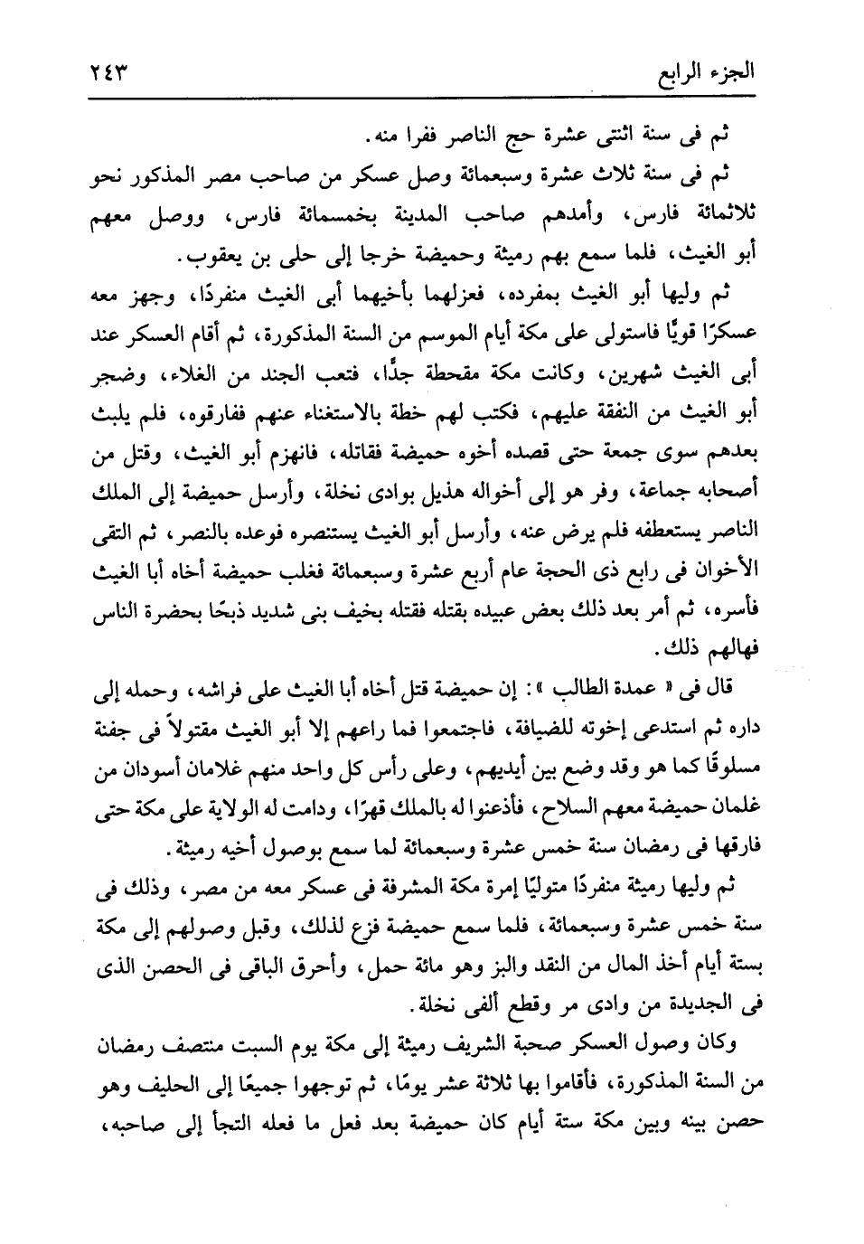 ثمَّ فِي سنة اثْنَتَيْ عشرَة حج النَّاصِر ففرا مِنْهُ ثمَّ فِي سنة ثَلَاث عشرَة وَسَبْعمائة وصل عَسْكَر من صَاحب مصر الْمَذْكُور نَحْو ثَلَاثمِائَة فَارس وأمدهم صَاحب الْمَدِينَة بِخَمْسِمِائَة فَارس وَوصل مَعَهم أَبُو الْغَيْث فَلَمَّا سمع بهم رميثة وحميضة خرجا إِلَى حلى بن يَعْقُوب ثمَّ وَليهَا أَبُو الْغَيْث بمفرده فعزلهما بأخيهما أبي الْغَيْث مُنْفَردا وجهز مَعَه عسكراً قَوِيا فاستولى على مَكَّة أَيَّام الْمَوْسِم من السّنة الْمَذْكُورَة ثمَّ أَقَامَ الْعَسْكَر عِنْد أبي الْغَيْث شَهْرَيْن وَكَانَت مَكَّة مقحطة جدا فتعب الْجند من الغلاء وضجر أَبُو الْغَيْث من النَّفَقَة عَلَيْهِم فَكتب لَهُم خطة بالاستغناء عَنْهُم ففارقوه فَلم يلبث بعدهمْ سوى جُمُعَة حَتَّى قَصده أَخُوهُ حميضة فقاتله فَانْهَزَمَ أَبُو الْغَيْث وَقتل من أَصْحَابه جمَاعَة وفر هُوَ إِلَى أَخْوَاله هُذَيْل بوادي نَخْلَة وَأرْسل حميضة إِلَى الْملك النَّاصِر يستعطفه فَلم يرض عَنهُ وَأرْسل أَبُو الْغَيْث يستنصره فوعده بالنصر ثمَّ التقى الأخوان فِي رَابِع ذِي الْحجَّة عَام أَربع عشرَة وَسَبْعمائة فغلب حميضة أَخَاهُ أَبَا الْغَيْث فَأسرهُ ثمَّ أَمر بعد ذَلِك بعض عبيده بقتْله فَقتله بخيف بني شَدِيد ذبحا بِحَضْرَة النَّاس فهالهم ذَلِك قَالَ فِي عُمْدَة الطَّالِب إِن حميضة قتل أَخَاهُ أَبَا الْغَيْث على فرَاشه وَحمله إِلَى دَاره ثمَّ استدعى إخواته للضيافة فَاجْتمعُوا فَمَا راعهم أَلا أَبُو الْغَيْث مقتولاً فِي جَفْنَة مسلوقاً كَمَا هُوَ وَقد وضع بَين أَيْديهم وعَلى رَأس كل وَاحِد مِنْهُم غلامان أسودان من غلْمَان حميضة مَعَهم السِّلَاح فأذعنوا لَهُ بِالْملكِ قهرا ودامت لَهُ الْولَايَة على مَكَّة حَتَّى فَارقهَا فِي رَمَضَان سنة خمس عشرَة وَسَبْعمائة لما سمع بوصول أَخِيه رميثة ثمَّ وَليهَا رميثة مُنْفَردا مُتَوَلِّيًا إمرة مَكَّة المشرفة فِي عَسْكَر مَعَه من مصر وَذَلِكَ فِي سنة خمس عشرَة وَسَبْعمائة فَلَمَّا سمع حميضة فزع لذَلِك وَقبل وصولهم إِلَى مَكَّة بِسِتَّة أَيَّام أَخذ المَال من النَّقْد والبز وَهُوَ مائَة حمل وأحرق الْبَاقِي فِي الْحصن الَّذِي فِي الجديدة من وَادي مر وَقطع ألفي نَخْلَة وَكَانَ وُصُول الْعَسْكَر صُحْبَة الشريف رميثة إِلَى مَكَّة يَوْم السبت منتصف رَمَضَان من السّنة الْمَذْكُورَة فأقاموا بهَا ثَلَاثَة عشر يَوْمًا ثمَّ توجهوا جَمِيعًا إِلَى الحليف وَهُوَ حصن بَينه وَبَين مَكَّة سِتَّة أَيَّام كَانَ حميضة بعد فعل مَا فعله التجأ إِلَى صَاحبه