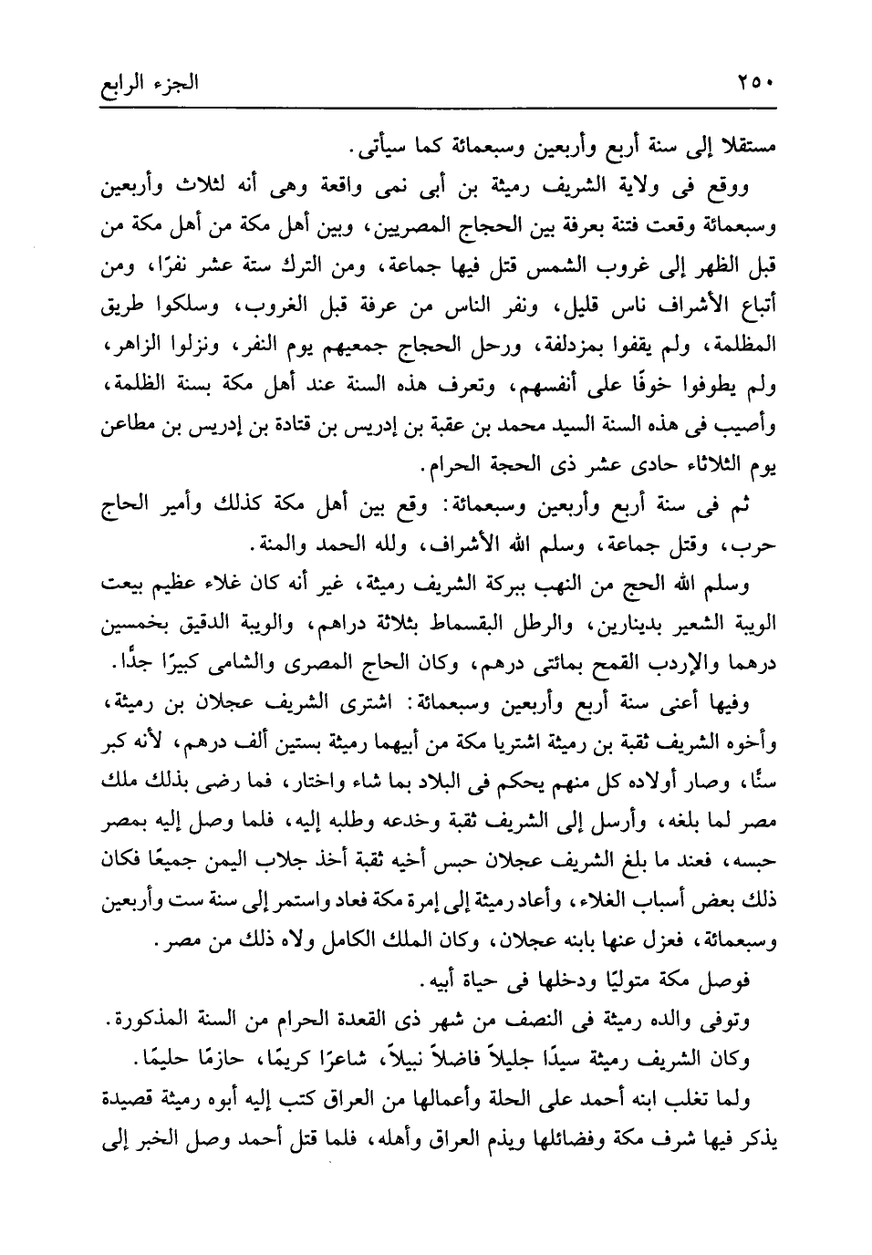 مُسْتقِلّا إِلَى سنة أَربع وَأَرْبَعين وَسَبْعمائة كَمَا سَيَأْتِي وَوَقع فِي ولَايَة الشريف رميثة بن أبي نمي وَاقعَة وَهِي أَنه لثلاث وَأَرْبَعين وَسَبْعمائة وَقعت فتْنَة بِعَرَفَة بَين الْحجَّاج المصريين وَبَين أهل مَكَّة من أهل مَكَّة من قبل الظّهْر إِلَى غرُوب الشَّمْس قتل فِيهَا جمَاعَة وَمن التّرْك سِتَّة عشر نَفرا وَمن أَتبَاع الْأَشْرَاف نَاس قَلِيل وَنَفر النَّاس من عَرَفَة قبل الْغُرُوب وسلكوا طَرِيق الْمظْلمَة وَلم يقعوا بِمُزْدَلِفَة ورحل الْحجَّاج جَمِيعهم يَوْم النَّفر ونزلوا الزَّاهِر وَلم يطوفوا خوفًا على أنفسهم وتعرف هَذِه السّنة عِنْد أهل مَكَّة بِسنة الظلمَة وَأُصِيب فى السّنة السَّيِّد مُحَمَّد بن عقبَة بن إِدْرِيس بن قَتَادَة بن إِدْرِيس بن مطاعن يَوْم الثُّلَاثَاء حادي عشر ذِي الْحجَّة الْحَرَام ثمَّ فِي سنة أَربع وَأَرْبَعين وَسَبْعمائة وَقع بَين أهل مَكَّة كَذَلِك وأمير الْحَاج حَرْب وَقتل جمَاعَة وَسلم الله الْأَشْرَاف وَللَّه الْحَمد والْمنَّة وَسلم الله الْحَج من النهب ببركة الشريف رميثة غير أَنه كَانَ غلاء عَظِيم بِيعَتْ الويبة الشّعير بدينارين والرطل البقسماط بِثَلَاثَة دَرَاهِم والويبة الدَّقِيق بِخَمْسِينَ درهما والإردب الْقَمْح بِمِائَتي دِرْهَم وَكَانَ الْحَاج الْمصْرِيّ والشامي كَبِيرا جدا وفيهَا أَعنِي سنة أَربع وَأَرْبَعين وَسَبْعمائة اشْترى الشريف عجلَان بن رميثة وَأَخُوهُ الشريف ثقبة بن رميثة اشتريا مَكَّة من أَبِيهِمَا رميثة بستين ألف دِرْهَم لِأَنَّهُ كبر سنا وَصَارَ أَوْلَاده كل مِنْهُم يحكم فِي الْبِلَاد بِمَا شَاءَ وَاخْتَارَ فَمَا رَضِي بذلك ملك مصر لما بلغه وَأرْسل إِلَى الشريف ثقبة وخدعه وَطَلَبه إِلَيْهِ فَلَمَّا وصل إِلَيْهِ بِمصْر حَبسه فَعِنْدَ مَا بلغ الشريف عجلَان حبس أَخِيه ثقبة أَخذ جلاب الْيمن جَمِيعًا فَكَانَ ذَلِك بعض أَسبَاب الغلاء وَأعَاد رميثة إِلَى إمرة مَكَّة فَعَاد وَاسْتمرّ إِلَى سنة سِتّ وَأَرْبَعين وَسَبْعمائة فعزل عَنْهَا بِابْنِهِ عجلَان وَكَانَ الْملك الْكَامِل ولاه ذَلِك فِي مصر فوصل مَكَّة مُتَوَلِّيًا ودخلها فِي حَيَاة أَبِيه وَتُوفِّي وَالِده رميثة فِي النّصْف من شهر ذِي الْقعدَة الْحَرَام من السّنة الْمَذْكُورَة وَكَانَ الشريف رميثة سيداً جَلِيلًا فَاضلا نبيلاً شَاعِرًا كَرِيمًا حازماً حَلِيمًا وَلما تغلب ابْنه أَحْمد على الْحلَّة وأعمالها من الْعرَاق كتب إِلَيْهِ أَبوهُ رميثة قصيدة يذكر فِيهَا شرف مَكَّة وفضائلها ويذم الْعرَاق وَأَهله فَلَمَّا قتل أَحْمد وصل الْخَبَر إِلَى