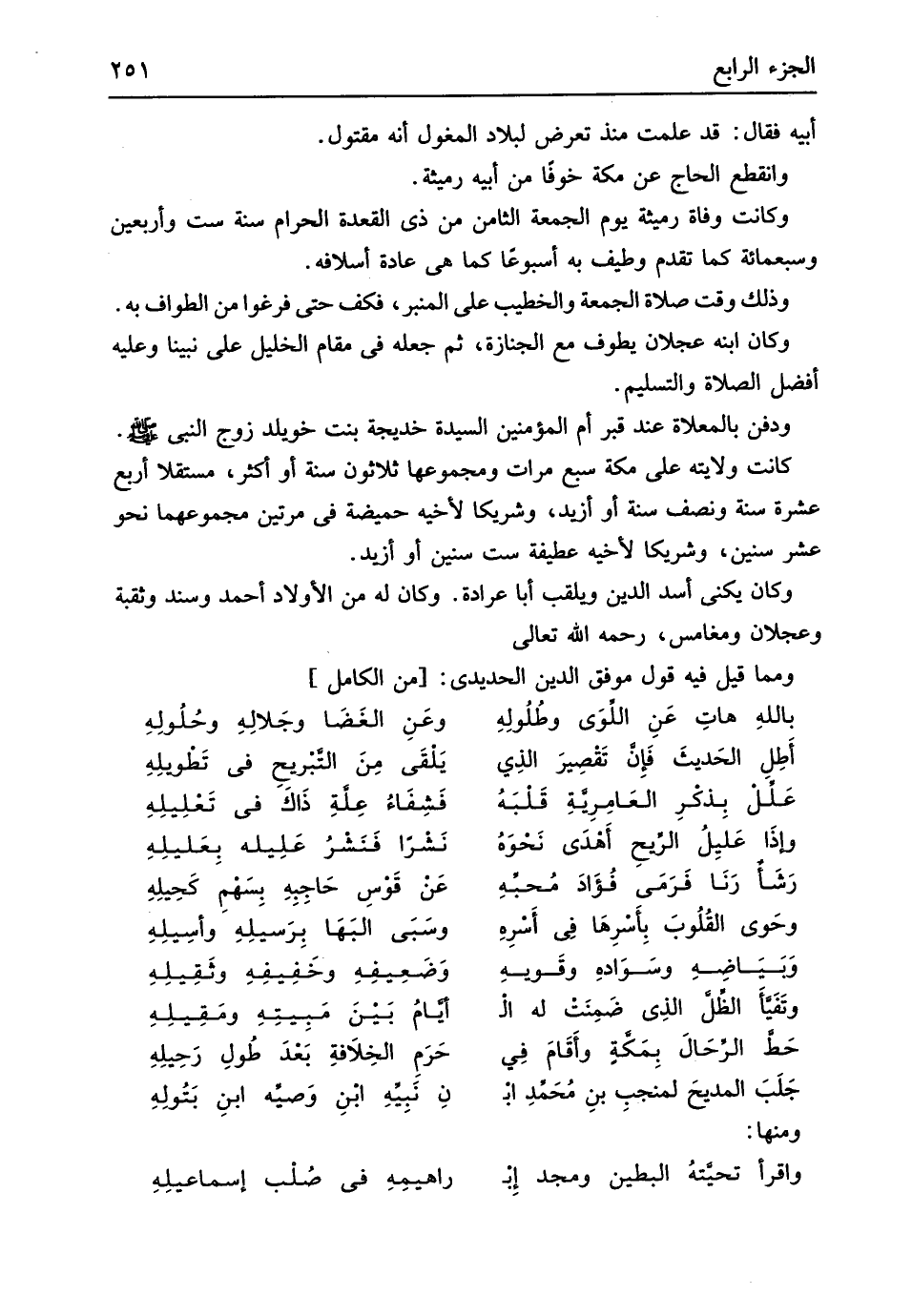 أَبِيه فَقَالَ قد علمت مُنْذُ تعرض لبلاد المغول أَنه مقتول وَانْقطع الْحَاج عَن مَكَّة خوفًا من أَبِيه رميثة وَكَانَت وَفَاة رميثة يَوْم الْجُمُعَة الثَّامِن من ذِي الْقعدَة الْحَرَام سنة سِتّ وَأَرْبَعين وَسَبْعمائة كَمَا تقدم وطيف بِهِ أسبوعاً كَمَا هِيَ عَادَة أسلافه وَذَلِكَ وَقت صَلَاة الْجُمُعَة والخطيب على الْمِنْبَر فَكف حَتَّى فرغوا من الطّواف بِهِ وَكَانَ ابْنه عجلَان يطوف مَعَ الجنارة ثمَّ جعله فِي مقَام الْخَلِيل على نَبينَا وَعَلِيهِ أفضل الصَّلَاة وَالتَّسْلِيم وَدفن بالمعلاة عِنْد قبر أم الْمُؤمنِينَ السيدة خَدِيجَة بنت خويلد زوج النبى