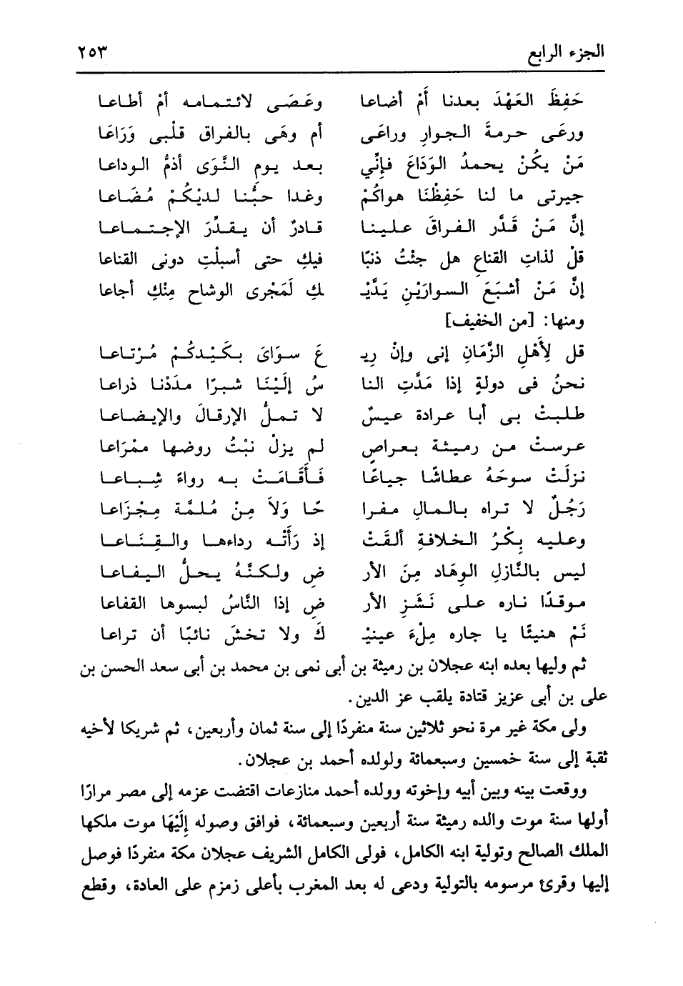 ثمَّ وَليهَا بعده ابْنة عجلَان بن رميثة بن أبي نمي بن مُحَمَّد بن أبي سعد الْحسن بن عَليّ بن أبي عَزِيز قَتَادَة يلقب عز الدّين ولي مَكَّة غير مرّة نَحْو ثَلَاثِينَ سنة مُنْفَردا إِلَى سنة ثَمَان وَأَرْبَعين ثمَّ شَرِيكا لِأَخِيهِ ثقبة إِلَى سنة خمسين وَسَبْعمائة ولولده أَحْمد بن عجلَان وَوَقعت بَينه وَبَين أَبِيه وَإِخْوَته وَولده أَحْمد منازعات اقْتَضَت عزمه إِلَى مصر مرَارًا أَولهَا سنة موت وَالِده رميثة سنة أَرْبَعِينَ وَسَبْعمائة فَوَافَقَ وُصُوله إِلَيها موت ملكهَا الْملك الصَّالح وتولية ابْنه الْكَامِل فولى الْكَامِل الشريف عجلَان مَكَّة مُنْفَردا فوصل إِلَيْهَا وقرىء مرسومه بالتولية ودعى لَهُ بعد الْمغرب بِأَعْلَى زَمْزَم على الْعَادة وَقطع