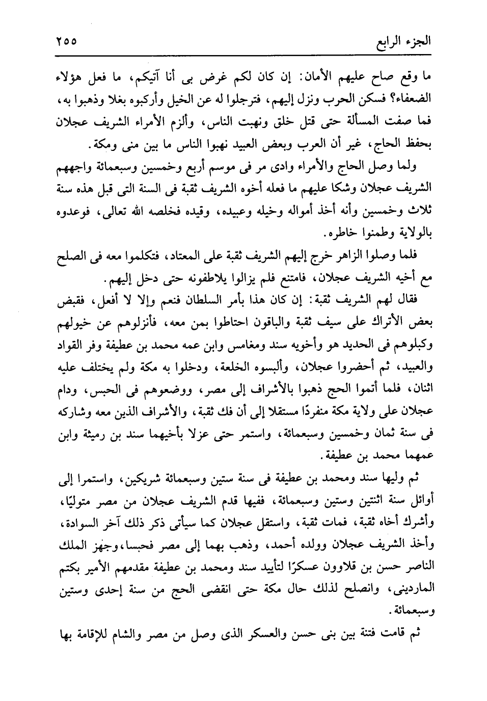مَا وَقع صَاح عَلَيْهِم الْأمان إِن كَانَ لكم غَرَض بى أَنا آتيكم وَمَا فعل هَؤُلَاءِ الضُّعَفَاء فسكن الْحَرْب وَنزل إِلَيْهِم فترجلوا لَهُ عَن الْخَيل وأركبوه بغلاً وذهبوا بِهِ فَمَا صفت الْمَسْأَلَة حَتَّى قتل خلق ونهبت النَّاس وألزم الْأُمَرَاء الشريف عجلَان بِحِفْظ الْحَاج غير أَن الْعَرَب وَبَعض العبيد نهبوا النَّاس مَا بَين منى وَمَكَّة وَلما وصل الْحَاج والأمراء وَادي مر فِي موسم أَربع وَخمسين وَسَبْعمائة واجههم الشريف عجلَان وشكا عَلَيْهِم مَا فعله أَخُوهُ الشريف ثقبة فِي السّنة الَّتِي قبل هَذِه سنة ثَلَاث وَخمسين وَأَنه أَخذ أَمْوَاله وخيله وعبيده وَقَيده فخلصه الله تَعَالَى فوعدوه بِالْولَايَةِ وطمنوا خاطره فَلَمَّا وصلوا الزَّاهِر خرج إِلَيْهِم الشريف ثقبة على الْمُعْتَاد فتكلموا مَعَه فِي الصُّلْح مَعَ أَخِيه الشريف عجلَان فَامْتنعَ فَلم يزَالُوا يلاطفونه حَتَّى دخل إِلَيْهِم فَقَالَ لَهُم الشريف ثقبة إِن كَانَ هَذَا بِأَمْر السُّلْطَان فَنعم وَإِلَّا لَا أفعل فَقبض بعض الأتراك على سيف ثقبة وَالْبَاقُونَ احتاطوا بِمن مَعَه فأنزلوهم عَن خيولهم وكبلوهم فِي الْحَدِيد هُوَ وأخويه سَنَد ومغامس وَابْن عَمه مُحَمَّد بن عطيفة وفر القواد وَالْعَبِيد ثمَّ أحضروا عجلَان وألبسوه الخلعة ودخلوا بِهِ مَكَّة وَلم يخْتَلف عَلَيْهِ اثْنَان فَلَمَّا أَتموا الْحَج ذَهَبُوا بالأشراف إِلَى مصر ووضعوهم فِي الْحَبْس ودام عجلَان على ولَايَة مَكَّة مُنْفَردا مُسْتقِلّا إِلَى أَن فك ثقبة والأشراف الَّذين مَعَه وشاركه فِي سنة ثَمَان وَخمسين وَسَبْعمائة وَاسْتمرّ حَتَّى عزلا بأخيهما سَنَد بن رميثة وَابْن عَمهمَا مُحَمَّد بن عطيفة ثمَّ وَليهَا سَنَد وَمُحَمّد بن عطيفة فِي سنة سِتِّينَ وَسَبْعمائة شَرِيكَيْنِ وَاسْتمرّ إِلَى أَوَائِل سنة اثْنَتَيْنِ وَسِتِّينَ وَسَبْعمائة فَفِيهَا قدم الشريف عجلَان من مصر مُتَوَلِّيًا وأشرك أَخَاهُ ثقبة فَمَاتَ ثقبة واستقل عجلَان كَمَا سَيَأْتِي ذكر ذَلِك آخر السوادة وَأخذ الشريف عجلَان وَولده أَحْمد وَذهب بهما إِلَى مصر فحبسا وجهز الْملك النَّاصِر حسن بن قلاوون عسكراً لتأييد سَنَد وَمُحَمّد بن عطيفة مقدمهم الْأَمِير بكتم المارديني وانصلح لذَلِك حَال مَكَّة حَتَّى انْقَضى الْحَج من سنة إِحْدَى وَسِتِّينَ وَسَبْعمائة ثمَّ قَامَت فتْنَة بَين بني حسن والعسكر الَّذِي وصل من مصر وَالشَّام للإقامة بهَا