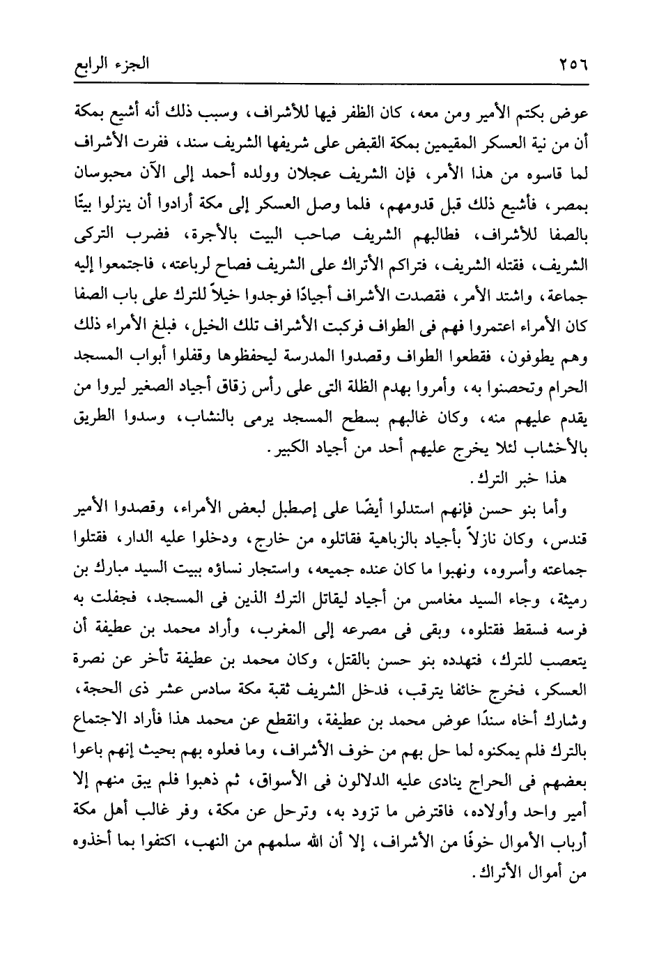 0 - عوض بكتم الْأَمِير وَمن مَعَه كَانَ الظفر فِيهَا للأشراف وَسبب ذَلِك أَنه أشيع بِمَكَّة أَن من نِيَّة الْعَسْكَر المقيمين بِمَكَّة الْقَبْض على شريفها الشريف سَنَد ففرت الْأَشْرَاف لما قاسوه من هَذَا الْأَمر فَإِن الشريف عجلَان وَولده أَحْمد إِلَى الْآن محبوسان بِمصْر فأشيع ذَلِك قبل قدومهم فَلَمَّا وصل الْعَسْكَر إِلَى مَكَّة أَرَادوا أَن ينزلُوا بَيْتا بالصفا للأشراف فطالبهم الشريف صاجب الْبَيْت بِالْأُجْرَةِ فضرت التركى الشريف فَقتله الرِّيف فتراكم الأتراك على الشريف فصاح لرباعته فَاجْتمعُوا إِلَيْهِ جمَاعَة وَاشْتَدَّ الْأَمر فقصدت الْأَشْرَاف أجياداً فوجدوا خيلاً للترك على بَاب الصَّفَا كَانَ الْأُمَرَاء اعتمروا فهم فِي الطّواف فركبت الْأَشْرَاف تِلْكَ الْخَيل فَبلغ الْأُمَرَاء ذَلِك وهم يطوفون فَقطعُوا الطّواف وقصدوا الْمدرسَة ليحفظوها وقفلوا أَبْوَاب الْمَسْجِد الْحَرَام وتحصنوا بِهِ وَأمرُوا بهدم الظلة الَّتِي على رَأس زقاق أجياد الصَّغِير ليروا من يقدم عَلَيْهِم مِنْهُ وَكَانَ غالبهم بسطح الْمَسْجِد يَرْمِي بالنشاب وسدوا الطَّرِيق بالأخشاب لِئَلَّا يخرج عَلَيْهِم أَحْمد من أجياد الْكَبِير هَذَا خبر التّرْك وَأما بَنو حسن فَإِنَّهُم استدلوا أَيْضا على إصطبل لبَعض الْأُمَرَاء وقصدوا الْأَمِير قندس وَكَانَ نازلاً بأجياد بالزباهية فقاتلوه من خَارج ودخلوا عَلَيْهِ الدَّار فَقتلُوا جماعته وأسروه ونهبوا مَا كَانَ عِنْده جَمِيعه واستجار نساؤه بِبَيْت السَّيِّد مبارك بن رميثة وَجَاء السَّيِّد مغامس من أجياد لِيُقَاتل التّرْك الَّذين فِي الْمَسْجِد فجفلت بِهِ فرسه فَسقط فَقَتَلُوهُ وَبَقِي فِي مصرعه إِلَى الْمغرب وَأَرَادَ مُحَمَّد بن عطيفة أَن يتعصب للترك فتهدده بَنو حسن بِالْقَتْلِ وَكَانَ مُحَمَّد بن عطيفة تَأَخّر عَن نصْرَة الْعَسْكَر فَخرج خَائفًا يترقب فَدخل الشريف ثقبة مَكَّة سادس عشر ذِي الْحجَّة وشارك أَخَاهُ سنداً عوض مُحَمَّد بن عطيفة وَانْقطع عَن مُحَمَّد هَذَا فَأَرَادَ الِاجْتِمَاع بِالتّرْكِ فَلم يمكنوه لما حل بهم من خوف الْأَشْرَاف وَمَا فَعَلُوهُ بهم بِحَيْثُ إِنَّهُم باعوا بَعضهم فِي الحراج يُنَادي عَلَيْهِ الدلالون فِي الْأَسْوَاق ثمَّ ذَهَبُوا فَلم يبْق مِنْهُم أَلا أَمِير وَاحِد وَأَوْلَاده فاقترض مَا تزَود بِهِ وترحل عَن مَكَّة وفر غَالب أهل مَكَّة أَرْبَاب الْأَمْوَال خوفًا من الْأَشْرَاف أَلا أَن الله سلمهم من النهب اكتفوا بِمَا أَخَذُوهُ من أَمْوَال الأتراك