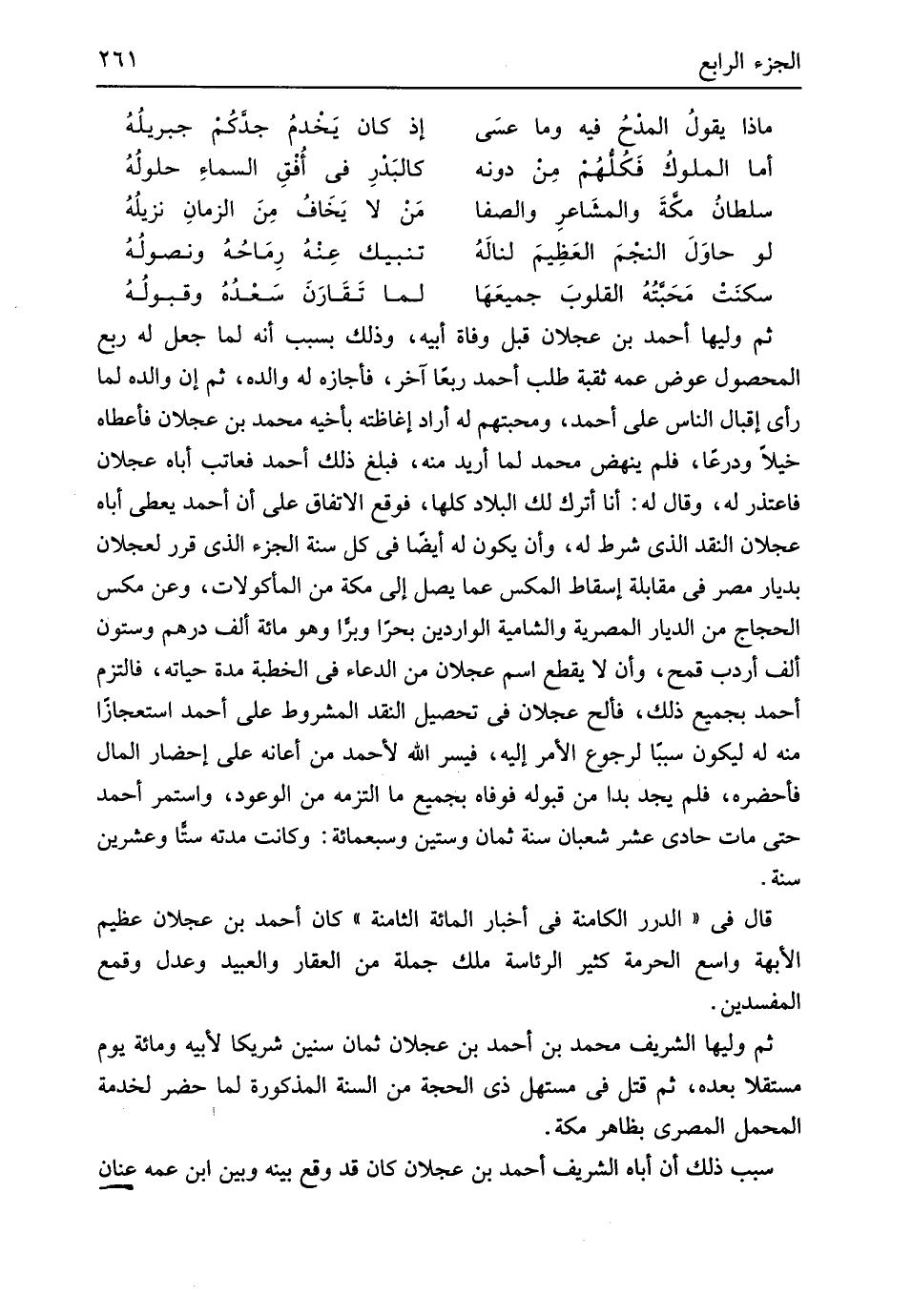 ثمَّ وَليهَا أَحْمد بن عجلَان قبل وَفَاة أَبِيه وَذَلِكَ بِسَبَب أَنه لما جعل لَهُ ربع الْمَحْصُول عوض عَمه ثقبة طلب أَحْمد ربعا آخر فَأَجَازَهُ لَهُ وَالِده ثمَّ إِن وَالِده لما رأى إقبال النَّاس على أَحْمد ومحبتهم لَهُ أَرَادَ إغاظته بأَخيه مُحَمَّد بن عجلَان فَأعْطَاهُ خيلاً وَدِرْعًا فَلم ينْهض مُحَمَّد لما أُرِيد مِنْهُ فَبلغ ذَلِك أَحْمد فعاتب أَبَاهُ عجلَان فَاعْتَذر لَهُ وَقَالَ لَهُ أَنا أترك لَك الْبِلَاد كلهَا فَوَقع الِاتِّفَاق على أَن أَحْمد يُعْطي أَبَاهُ عجلَان النَّقْد الَّذِي شَرط لَهُ وَأَن يكون لَهُ أَيْضا فِي كل سنة الْجُزْء الَّذِي قرر لعجلان بديار مصر فِي مُقَابلَة إِسْقَاط المكس عَمَّا يصل إِلَى مَكَّة من المأكولات وَعَن مكس الْحجَّاج من الديار المصرية والشامية الواردين بحراً وَبرا وَهُوَ مائَة ألف دِرْهَم وَسِتُّونَ ألف أردب قَمح وَأَن لَا يقطع اسْم عجلَان من الدُّعَاء فِي الْخطْبَة مُدَّة حَيَاته فالتزم أَحْمد بِجَمِيعِ ذَلِك فألح عجلَان فِي تَحْصِيل النَّقْد الْمَشْرُوط على أَحْمد استعجازاً مِنْهُ لَهُ ليَكُون سَببا لرجوع الْأَمر إِلَيْهِ فيسر الله لِأَحْمَد من أَعَانَهُ على إِحْضَار المَال فَأحْضرهُ فَلم يجد بدا من قبُوله فوفاه بِجَمِيعِ مَا الْتَزمهُ من الوعود وَاسْتمرّ أَحْمد حَتَّى مَاتَ حادي عشر شعْبَان سنة ثَمَان وَسِتِّينَ وَسَبْعمائة وَكَانَت مدَّته سِتا وَعشْرين سنة قَالَ فِي الدُّرَر الكامنة فِي أَخْبَار الْمِائَة الثَّامِنَة كَانَ أَحْمد بن عجلَان عَظِيم الأبهة وَاسع الْحُرْمَة كثير الرِّئَاسَة ملك جملَة من الْعقار وَالْعَبِيد وَعدل وقمع المفسدين ثمَّ وَليهَا الشريف مُحَمَّد بن أَحْمد بن عجلَان ثَمَان سِنِين شَرِيكا لِأَبِيهِ وَمِائَة يَوْم مُسْتقِلّا بعده ثمَّ قتل فِي مستهل ذِي الْحجَّة من السّنة الْمَذْكُورَة لما حضر لخدمة الْمحمل الْمصْرِيّ بِظَاهِر مَكَّة سَبَب ذَلِك أَن أَبَاهُ الشريف أَحْمد بن عجلَان كَانَ قد وَقع بَينه وَبَين ابْن عَمه عنان