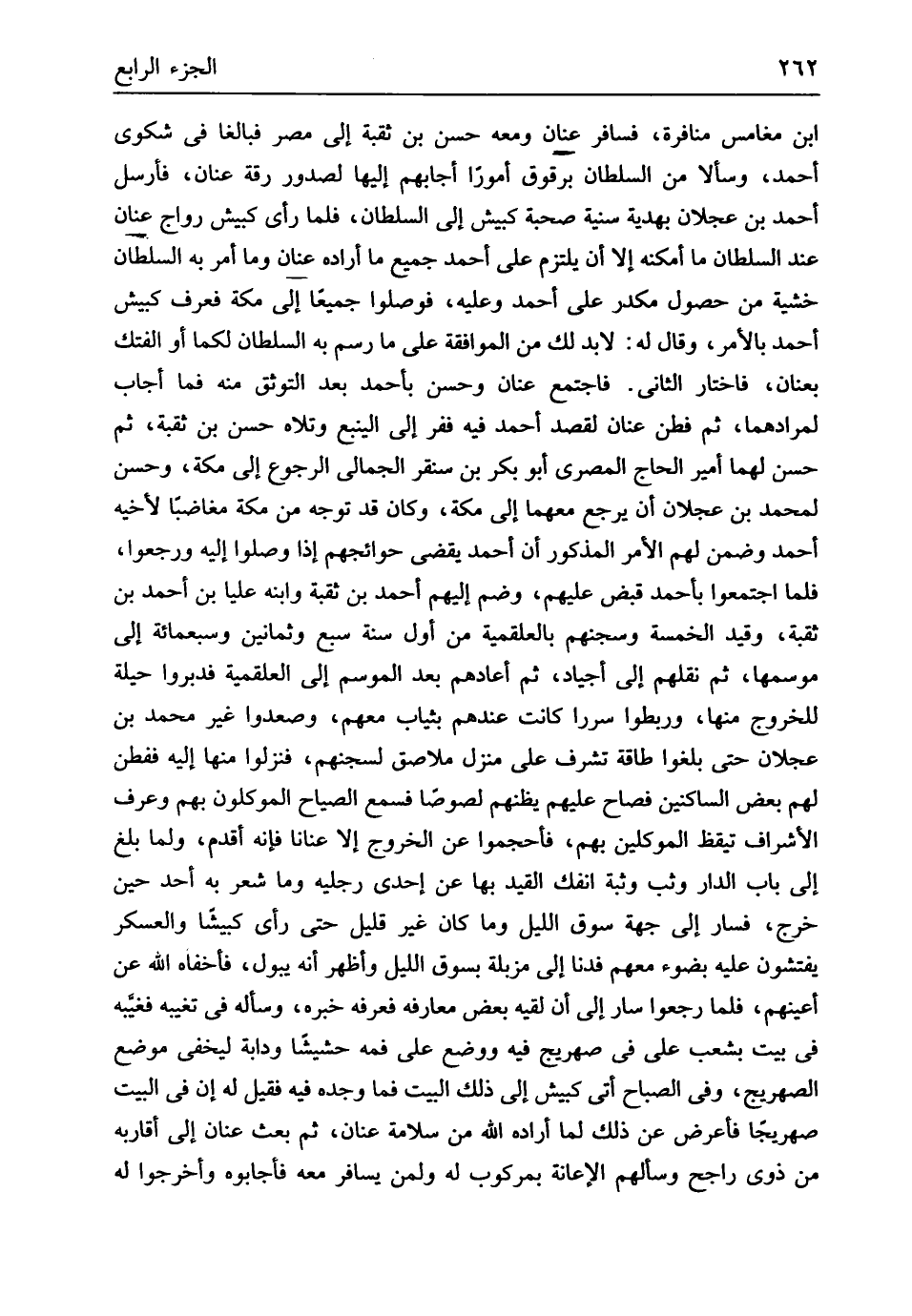 ابْن مغامس منافرة فسافر عنان وَمَعَهُ حسن بن ثقبة إِلَى مصر فبالغا فِي شكوى أَحْمد وسألا من السُّلْطَان برقوق أموراً أجابهم إِلَيْهَا لصدور رقة عنان فَأرْسل أَحْمد بن عجلَان بهدية سنبة صُحْبَة كبيش إِلَى السُّلْطَان فَلَمَّا رأى كبيش رواج عنان عِنْد السُّلْطَان مَا أمكنه أَلا أَن يلْتَزم على أَحْمد جَمِيع مَا أَرَادَهُ عنان وَمَا أَمر بِهِ السُّلْطَان خشيَة من حُصُول مكدر على أَحْمد وَعَلِيهِ فوصلوا جَمِيعًا إِلَى مَكَّة فَعرف كبيش أَحْمد بِالْأَمر وَقَالَ لَهُ لابد لَك من الْمُوَافقَة على مَا رسم بِهِ السُّلْطَان لَكمَا أَو لفتك بعنان فَاخْتَارَ الثَّانِي فَاجْتمع عنان وَحسن بِأَحْمَد بعد التوثيق مِنْهُ فَمَا أجَاب لمرادهما ثمَّ فطن عنان لقصد أَحْمد فِيهِ ففر إِلَى الينبع وتلاه حسن بن ثقبة ثمَّ حسن لَهما أَمِير الْحَاج الْمصْرِيّ أَبُو بكر بن سنقر الجمالي الرُّجُوع إِلَى مَكَّة وَحسن لمُحَمد بن عجلَان أَن يرجع مَعَهُمَا إِلَى مَكَّة وَكَانَ قد توجه إِلَى مَكَّة مغاضباً لِأَخِيهِ أَحْمد وَضمن لَهُم الْأَمر الْمَذْكُور أَن أَحْمد يقْضِي حوائجهم إِذا وصلوا إِلَيْهِ وَرَجَعُوا فَلَمَّا اجْتَمعُوا بِأَحْمَد قبض عَلَيْهِم وَضم إِلَيْهِم أَحْمد بن ثقبة وَابْنه عليا بن أَحْمد بن ثقبة وَقيد الْخَمْسَة وسجنهم بالعلقمية من أول سنة سبع وَثَمَانِينَ وَسَبْعمائة إِلَى موسمها ثمَّ نقلهم إِلَى أجياد ثمَّ أعادهم بعد الْمَوْسِم إِلَى العلقمية فدبروا حِيلَة لِلْخُرُوجِ مِنْهَا وربطوا سرراً كَانَت عِنْدهم بِثِيَاب مَعَهم وصعدوا غير مُحَمَّد بن عجلَان حَتَّى بلغُوا طَاقَة تشرف على منزل ملاصق لسجنهم فنزلوا مِنْهَا إِلَيْهِ فَفطن لَهُم بعض الساكنين فصاح عَلَيْهِم يظنهم لصوصاً فَسمع الصياح الموكلون بهم وَعرف الْأَشْرَاف تيقظ الموكلين بهم فأحجموا عَن الْخُرُوج أَلا عناناً فَإِنَّهُ أقدم وَلما بلغ إِلَى بَاب الدَّار وثب وثبة انْفَكَّ الْقَيْد بهَا عَن إِحْدَى رجلَيْهِ وَمَا شعر بِهِ أحد حِين خرج فَسَار إِلَى جِهَة سوق اللَّيْل وَمَا كَانَ غير قَلِيل حَتَّى رأى كبيشاً والعسكر يفتشون عَلَيْهِ بضوء مَعَهم فَدَنَا إِلَى مزبلة بسوق اللَّيْل وَأظْهر أَنه يَبُول فأخفاه الله عَن أَعينهم فَلَمَّا رجعُوا سَار إِلَى أَن لقِيه بعض معارفه فَعرفهُ خَبره وَسَأَلَهُ فِي تغيبه فغيبه فِي بَيت بشعب على فِي صهريج فِيهِ وَوضع على فمهم حشيشاً ودابة ليخفي مَوضِع الصهريج وَفِي الصَّباح أَتَى كبيش إِلَى ذَلِك الْبَيْت فَمَا وجده فِيهِ فَقيل لَهُ إِن فِي الْبَيْت صهريجاً فَأَعْرض عَن ذَلِك لما أَرَادَهُ الله من سَلامَة عنان ثمَّ بعث عنان إِلَى أَقَاربه من ذَوي رَاجِح وسألهم الْإِعَانَة بمركوب لَهُ وَلمن يُسَافر مَعَه فَأَجَابُوهُ وأخرجوا لَهُ