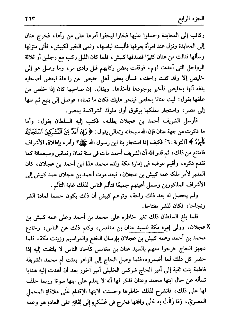 ركائب إِلَى المعابدة وحملوا عَلَيْهَا فخاراً ليخفوا أمرهَا على من رَآهَا فَخرج عنان إِلَى المعابدة وَنزل عِنْد امْرَأَة يعرفهَا فألبسته لباسها ونمى الْخَبَر لكبيش فَأتى منزلهَا وسألها فنالت من عنان كثيرا فصدقها كبيش فَلَمَّا كَانَ اللَّيْل ركب مَعَ رجلَيْنِ أَو ثَلَاثَة الرَّوَاحِل الَّتِي أعدت لَهُم فوقفت بعض رِكَابهمْ قبل وَادي مر وَمَا وصل هُوَ إِلَى خليص أَلا وَقد كلت رَاحِلَته فَسَأَلَ بعض أهل خليص عَن رَاحِلَة لبَعض أَصْحَابه بلغه أَنَّهَا بخليص فَأخْبر بوجودها فَأَخذهَا وَيُقَال إِن صَاحبهَا كَانَ إِذا خلص من عَلفهَا يَقُول لَيْث عناناً يخلص فينجو عَلَيْك فَكَانَ مَا تمناه فوصل إِلَى يَنْبع ثمَّ مِنْهَا إِلَى مصر واستجار بملكها برقوق أول مُلُوك الشراكسة بِمصْر فَأرْسل الشريف أَحْمد بن عجلَان يَطْلُبهُ فَكتب إِلَيْهِ السُّلْطَان يَقُول وَأما مَا ذكرت من جِهَة عنان فَإِن الله سُبْحَانَهُ وَتَعَالَى يَقُول {وَإِن أَحَد مِنَ اَلمُشركِينَ اَستَجَارَكَ فَأجِره} التَّوْبَة 6 فَكيف إِذا استجار بِنَا ابْن رَسُول الله